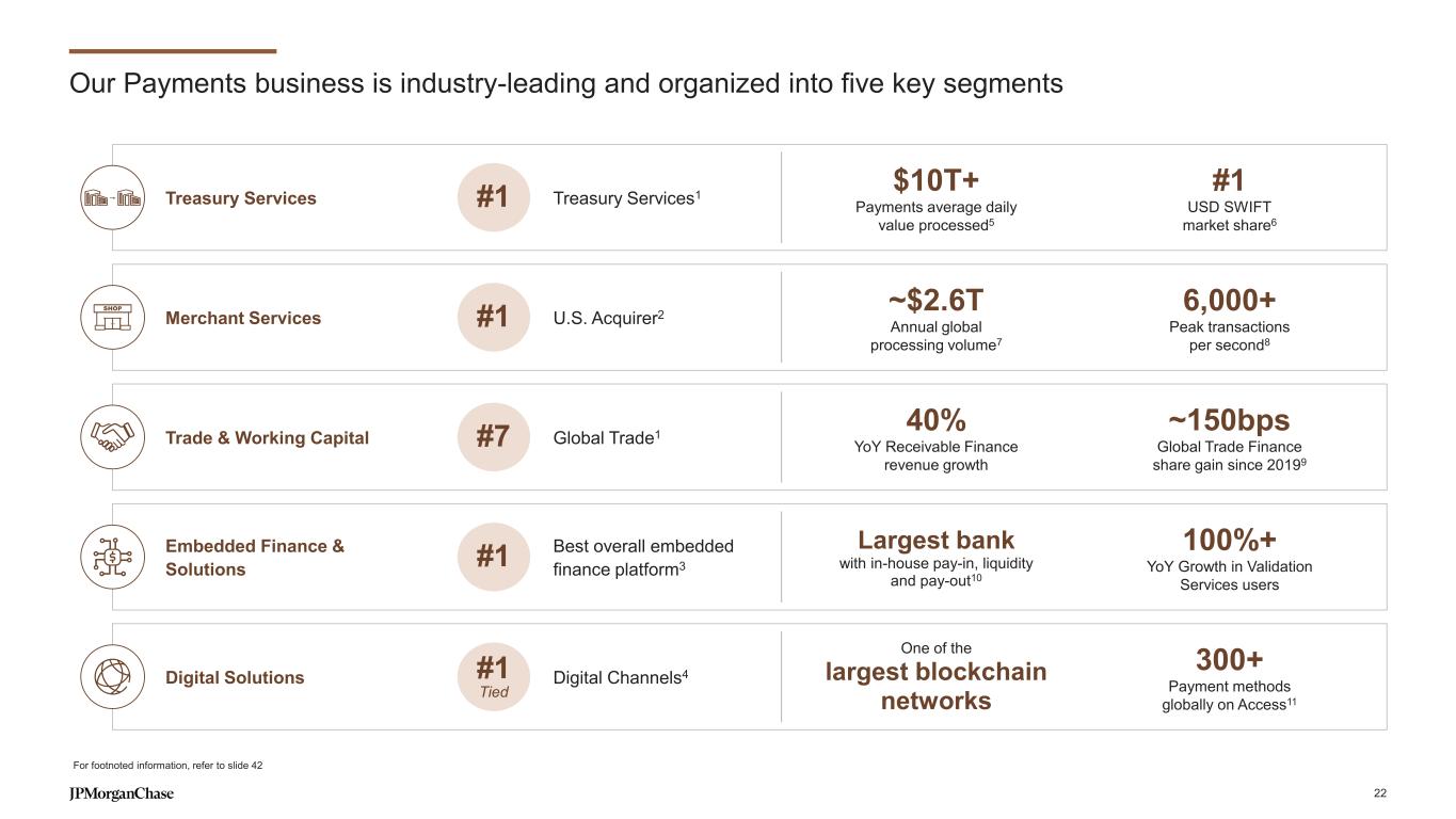 Payments drives value for businesses across the Firm IMPORTANT SOURCE OF LIQUIDITY ~1/3rd of Firmwide deposit funding CRITICAL INFRASTRUCTURE Payment rails Sanctions screening Fraud services ENHANCED CLIENT VALUE PROPOSITION CONSISTENT, RECURRING REVENUE COST-EFFICIENCIES OF IN-HOUSE PAYMENTS Recurring cross-border FX revenue Settlement services for trading Leading digital asset capabilities ~$170mm Average incremental FX revenue driven by Payments each year1 Holistic offering for Securities Services clients with in-house Payments offering Operational savings ~$115T Securities Services payments volume processed2 More efficient payments processing Enhanced fraud and authorization rates ~$7T CCB ACH volume processed3 ~$20T CCB Wire volume processed3 In-house Payments sweep platforms Partnership enabling Payments clients to directly invest on Morgan Money ~$175B Balances swept into AWM Money Market Funds4 SELECT EXAMPLES Markets Securities Services Consumer & Community Banking Asset & Wealth Management 21 For footnoted information, refer to slide 41