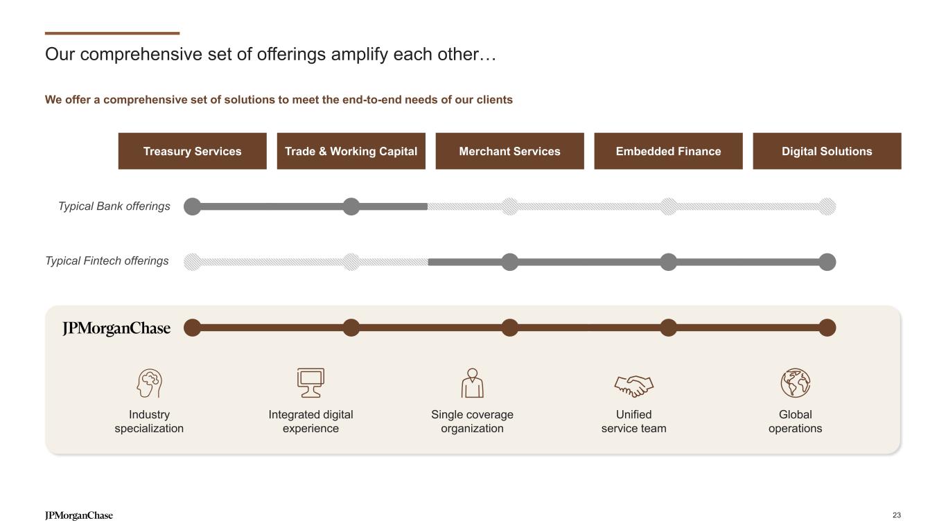 Our comprehensive set of offerings amplify each other… Merchant Services Embedded FinanceTreasury Services Trade & Working Capital Digital Solutions We offer a comprehensive set of solutions to meet the end-to-end needs of our clients Typical Fintech offerings Typical Bank offerings Integrated digital experience Single coverage organization Unified service team Global operations Industry specialization 23