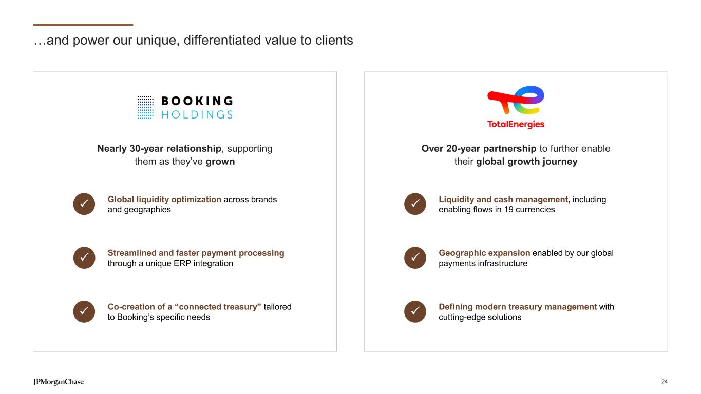 …and power our unique, differentiated value to clients Nearly 30-year relationship, supporting them as they’ve grown Over 20-year partnership to further enable their global growth journey Global liquidity optimization across brands and geographies Streamlined and faster payment processing through a unique ERP integration Co-creation of a “connected treasury” tailored to Booking’s specific needs Liquidity and cash management, including enabling flows in 19 currencies Geographic expansion enabled by our global payments infrastructure Defining modern treasury management with cutting-edge solutions 24