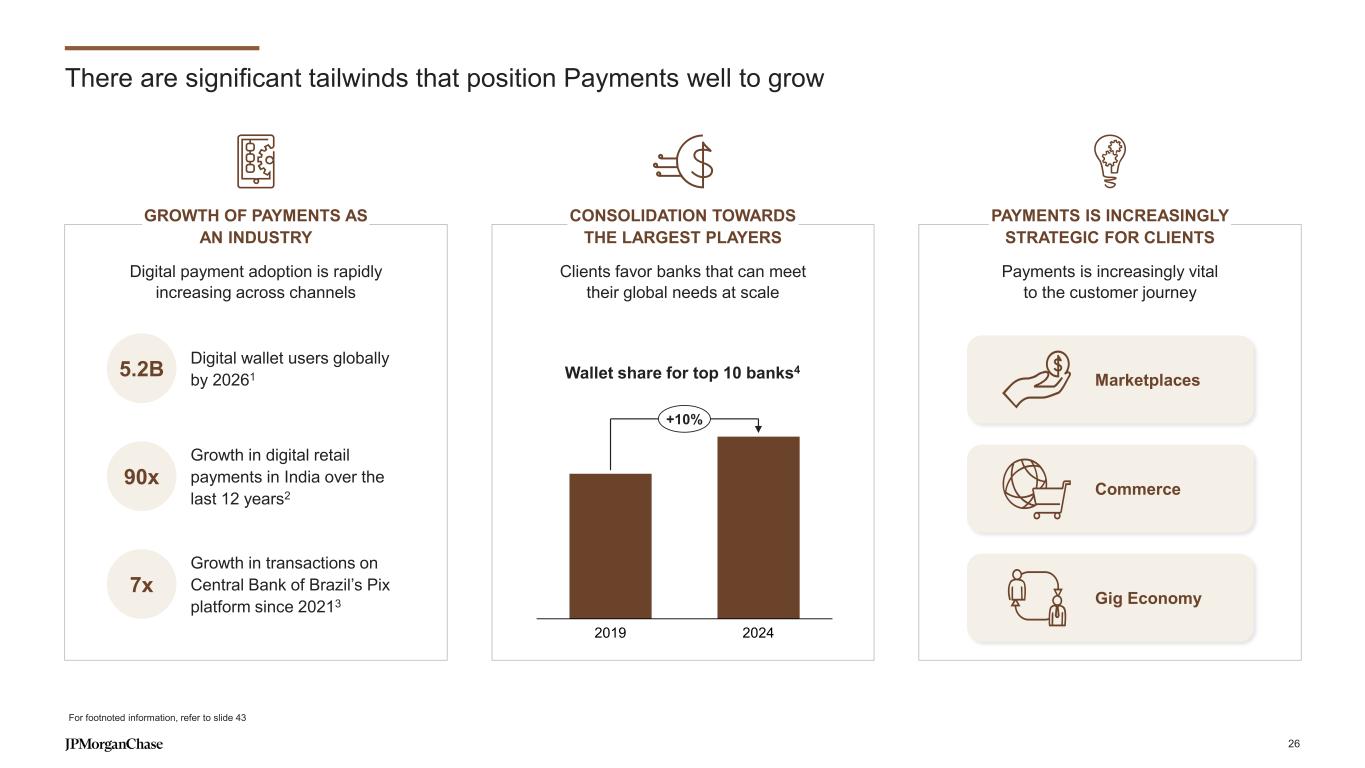 The business continues to deliver strong performance, gaining scale and market share 6.0% 2019 2020 2021 2022 2023 2024 Fee revenue growthPayments revenue1 ($B) $10.3 $18.4 2019 2024 TS market share2 9.5% Average deposits ($B) STRONG FINANCIAL PERFORMANCE UNDERPINNED BY FEE AND DEPOSIT GROWTH DELIVERED GROWTH DESPITE RATE HEADWINDS Payments revenue1 ($B) NOT TO SCALE 2023 Rate- related3 Deposit- related Fee- related3 2024 $18.3 $18.4 Organic growth ~$480 ~$760 +350bps +$280 25 For footnoted information, refer to slide 42