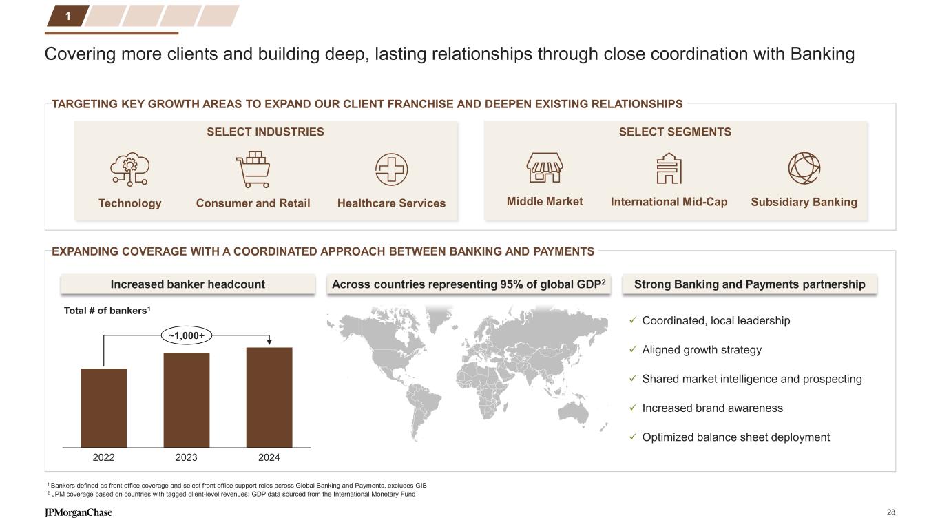 Covering more clients and building deep, lasting relationships through close coordination with Banking EXPANDING COVERAGE WITH A COORDINATED APPROACH BETWEEN BANKING AND PAYMENTS TARGETING KEY GROWTH AREAS TO EXPAND OUR CLIENT FRANCHISE AND DEEPEN EXISTING RELATIONSHIPS 2022 2023 2024 ~1,000+ Total # of bankers1 Coordinated, local leadership Aligned growth strategy Shared market intelligence and prospecting Increased brand awareness Optimized balance sheet deployment Increased banker headcount Across countries representing 95% of global GDP2 Strong Banking and Payments partnership 1 Middle Market Subsidiary BankingInternational Mid-Cap SELECT SEGMENTSSELECT INDUSTRIES Technology Healthcare ServicesConsumer and Retail 1 Bankers defined as front office coverage and select front office support roles across Global Banking and Payments, excludes GIB 2 JPM coverage based on countries with tagged client-level revenues; GDP data sourced from the International Monetary Fund 28