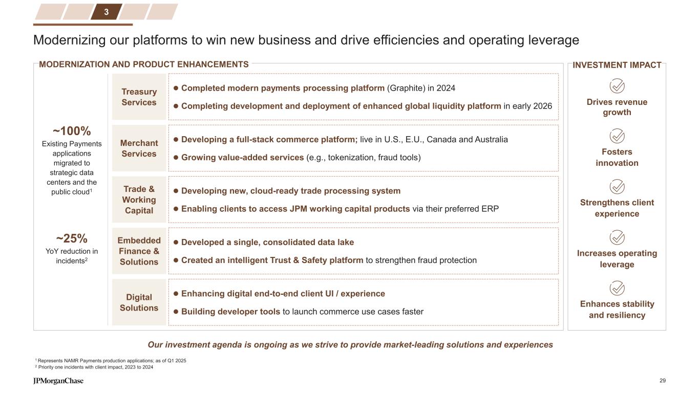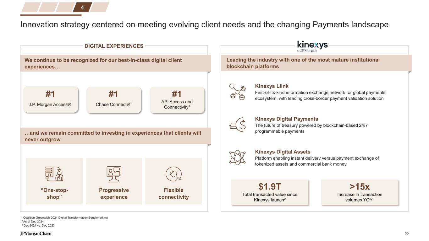 Modernizing our platforms to win new business and drive efficiencies and operating leverage INVESTMENT IMPACTMODERNIZATION AND PRODUCT ENHANCEMENTS ~25% YoY reduction in incidents2 ~100% Existing Payments applications migrated to strategic data centers and the public cloud1 Treasury Services Completed modern payments processing platform (Graphite) in 2024 Completing development and deployment of enhanced global liquidity platform in early 2026 Digital Solutions Enhancing digital end-to-end client UI / experience Building developer tools to launch commerce use cases faster Embedded Finance & Solutions Developed a single, consolidated data lake Created an intelligent Trust & Safety platform to strengthen fraud protection Trade & Working Capital Developing new, cloud-ready trade processing system Enabling clients to access JPM working capital products via their preferred ERP Merchant Services Developing a full-stack commerce platform; live in U.S., E.U., Canada and Australia Growing value-added services (e.g., tokenization, fraud tools) Our investment agenda is ongoing as we strive to provide market-leading solutions and experiences 3 1 Represents NAMR Payments production applications; as of Q1 2025 2 Priority one incidents with client impact, 2023 to 2024 Drives revenue growth Fosters innovation Strengthens client experience Increases operating leverage Enhances stability and resiliency 29