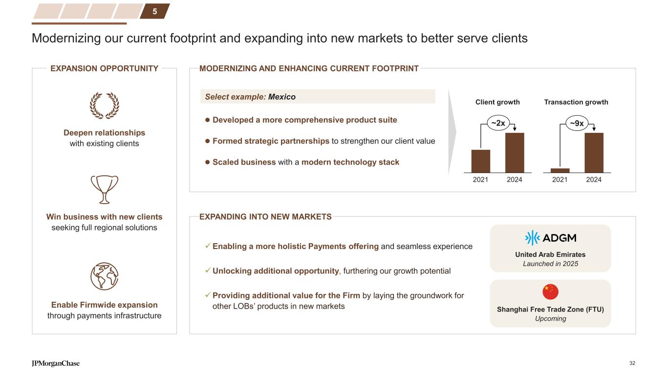 Innovation strategy centered on meeting evolving client needs and the changing Payments landscape Leading the industry with one of the most mature institutional blockchain platforms >15x Increase in transaction volumes YOY3 $1.9T Total transacted value since Kinexys launch2 Kinexys Digital Payments The future of treasury powered by blockchain-based 24/7 programmable payments Kinexys Digital Assets Platform enabling instant delivery versus payment exchange of tokenized assets and commercial bank money Kinexys Liink First-of-its-kind information exchange network for global payments ecosystem, with leading cross-border payment validation solution 4 DIGITAL EXPERIENCES We continue to be recognized for our best-in-class digital client experiences… …and we remain committed to investing in experiences that clients will never outgrow #1 J.P. Morgan Access®1 #1 Chase Connect®1 #1 API Access and Connectivity1 “One-stop- shop” Progressive experience Flexible connectivity 1 Coalition Greenwich 2024 Digital Transformation Benchmarking 2 As of Dec 2024 3 Dec 2024 vs. Dec 2023 30