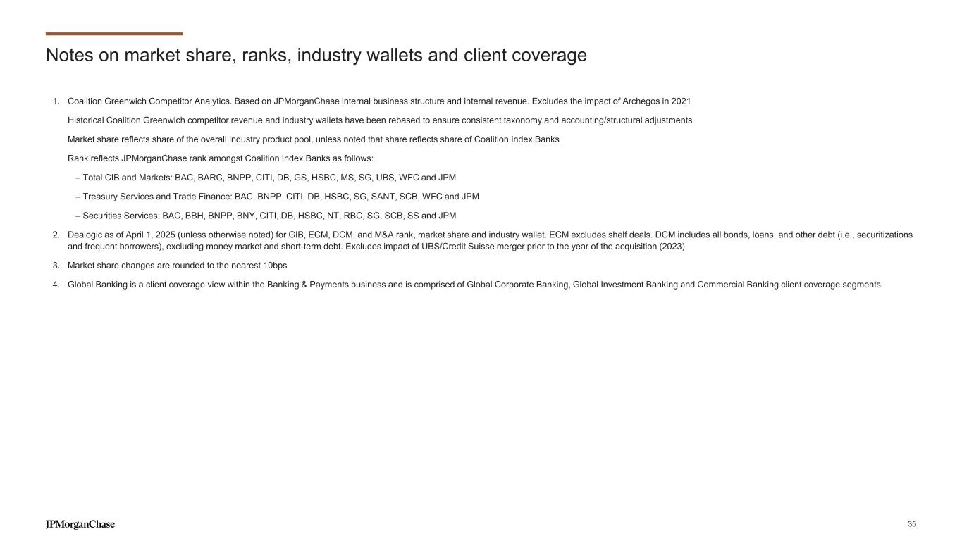 Notes on market share, ranks, industry wallets and client coverage 1. Coalition Greenwich Competitor Analytics. Based on JPMorganChase internal business structure and internal revenue. Excludes the impact of Archegos in 2021 Historical Coalition Greenwich competitor revenue and industry wallets have been rebased to ensure consistent taxonomy and accounting/structural adjustments Market share reflects share of the overall industry product pool, unless noted that share reflects share of Coalition Index Banks Rank reflects JPMorganChase rank amongst Coalition Index Banks as follows: – Total CIB and Markets: BAC, BARC, BNPP, CITI, DB, GS, HSBC, MS, SG, UBS, WFC and JPM – Treasury Services and Trade Finance: BAC, BNPP, CITI, DB, HSBC, SG, SANT, SCB, WFC and JPM – Securities Services: BAC, BBH, BNPP, BNY, CITI, DB, HSBC, NT, RBC, SG, SCB, SS and JPM 2. Dealogic as of April 1, 2025 (unless otherwise noted) for GIB, ECM, DCM, and M&A rank, market share and industry wallet. ECM excludes shelf deals. DCM includes all bonds, loans, and other debt (i.e., securitizations and frequent borrowers), excluding money market and short-term debt. Excludes impact of UBS/Credit Suisse merger prior to the year of the acquisition (2023) 3. Market share changes are rounded to the nearest 10bps 4. Global Banking is a client coverage view within the Banking & Payments business and is comprised of Global Corporate Banking, Global Investment Banking and Commercial Banking client coverage segments 35