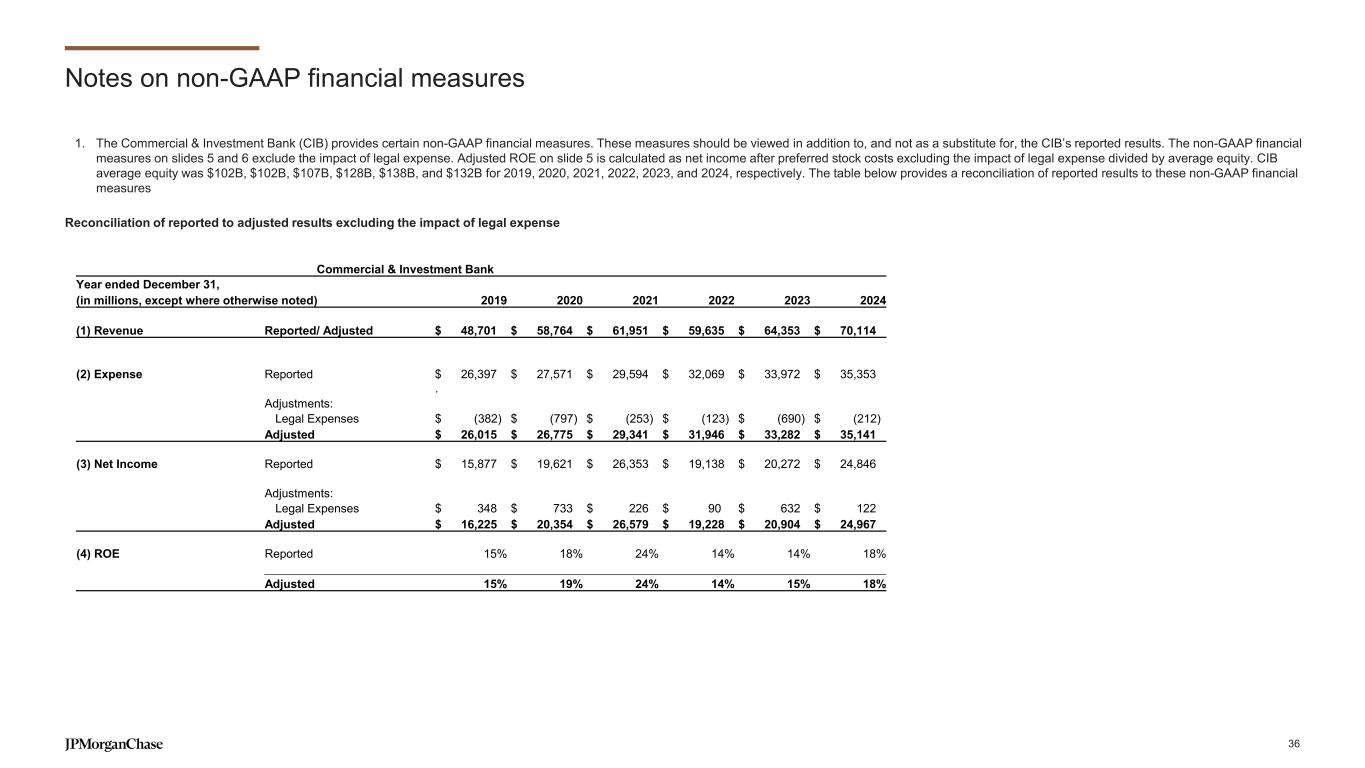 Notes on non-GAAP financial measures 1. The Commercial & Investment Bank (CIB) provides certain non-GAAP financial measures. These measures should be viewed in addition to, and not as a substitute for, the CIB’s reported results. The non-GAAP financial measures on slides 5 and 6 exclude the impact of legal expense. Adjusted ROE on slide 5 is calculated as net income after preferred stock costs excluding the impact of legal expense divided by average equity. CIB average equity was $102B, $102B, $107B, $128B, $138B, and $132B for 2019, 2020, 2021, 2022, 2023, and 2024, respectively. The table below provides a reconciliation of reported results to these non-GAAP financial measures Commercial & Investment Bank Year ended December 31, (in millions, except where otherwise noted) 2019 2020 2021 2022 2023 2024 (1) Revenue Reported/ Adjusted $ 48,701 $ 58,764 $ 61,951 $ 59,635 $ 64,353 $ 70,114 (2) Expense Reported $ 26,397 $ 27,571 $ 29,594 $ 32,069 $ 33,972 $ 35,353 . Adjustments: Legal Expenses $ (382) $ (797) $ (253) $ (123) $ (690) $ (212) Adjusted $ 26,015 $ 26,775 $ 29,341 $ 31,946 $ 33,282 $ 35,141 (3) Net Income Reported $ 15,877 $ 19,621 $ 26,353 $ 19,138 $ 20,272 $ 24,846 Adjustments: Legal Expenses $ 348 $ 733 $ 226 $ 90 $ 632 $ 122 Adjusted $ 16,225 $ 20,354 $ 26,579 $ 19,228 $ 20,904 $ 24,967 (4) ROE Reported 15% 18% 24% 14% 14% 18% Adjusted 15% 19% 24% 14% 15% 18% Reconciliation of reported to adjusted results excluding the impact of legal expense 36