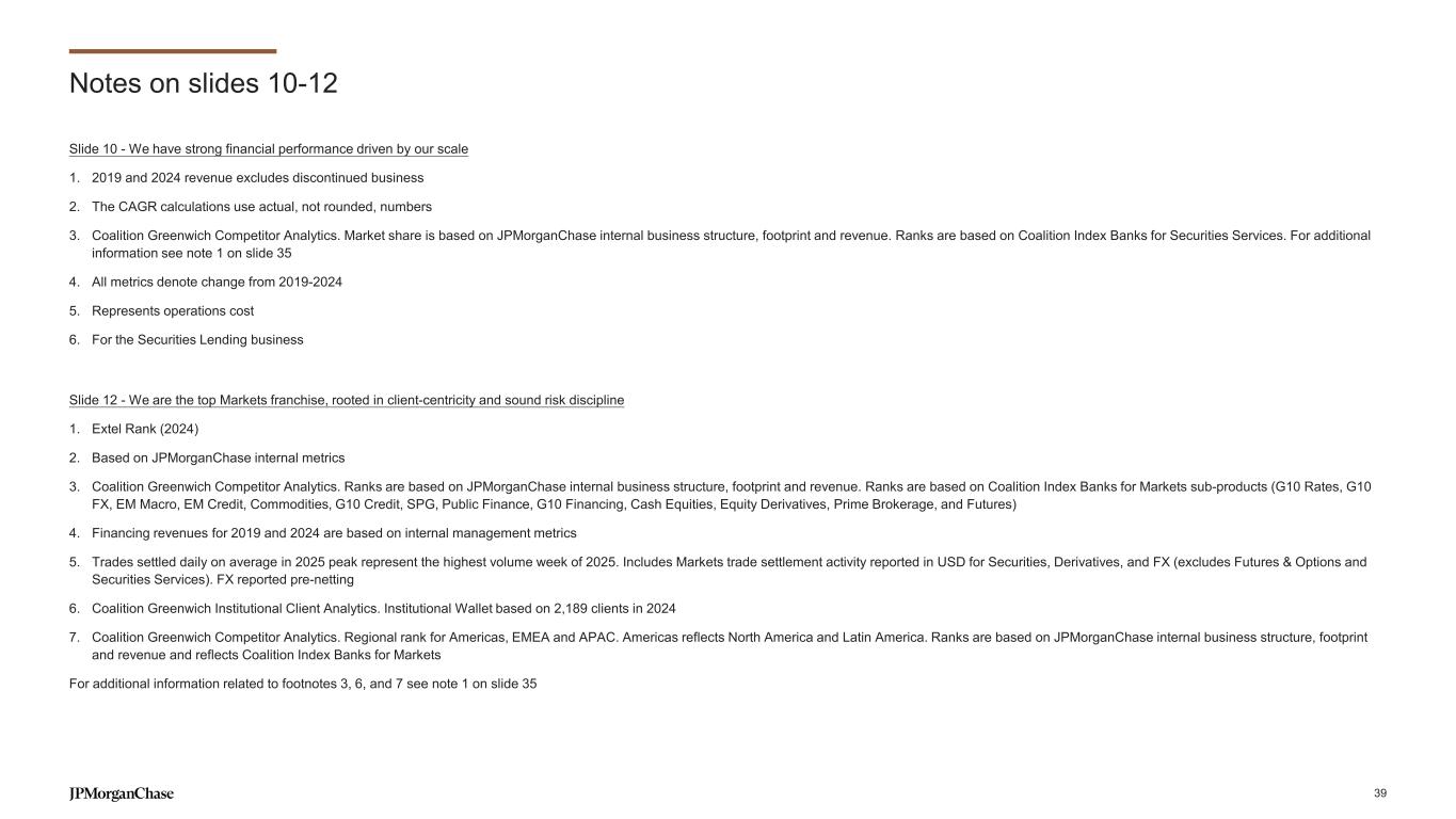 Notes on slides 10-12 Slide 10 - We have strong financial performance driven by our scale 1. 2019 and 2024 revenue excludes discontinued business 2. The CAGR calculations use actual, not rounded, numbers 3. Coalition Greenwich Competitor Analytics. Market share is based on JPMorganChase internal business structure, footprint and revenue. Ranks are based on Coalition Index Banks for Securities Services. For additional information see note 1 on slide 35 4. All metrics denote change from 2019-2024 5. Represents operations cost 6. For the Securities Lending business Slide 12 - We are the top Markets franchise, rooted in client-centricity and sound risk discipline 1. Extel Rank (2024) 2. Based on JPMorganChase internal metrics 3. Coalition Greenwich Competitor Analytics. Ranks are based on JPMorganChase internal business structure, footprint and revenue. Ranks are based on Coalition Index Banks for Markets sub-products (G10 Rates, G10 FX, EM Macro, EM Credit, Commodities, G10 Credit, SPG, Public Finance, G10 Financing, Cash Equities, Equity Derivatives, Prime Brokerage, and Futures) 4. Financing revenues for 2019 and 2024 are based on internal management metrics 5. Trades settled daily on average in 2025 peak represent the highest volume week of 2025. Includes Markets trade settlement activity reported in USD for Securities, Derivatives, and FX (excludes Futures & Options and Securities Services). FX reported pre-netting 6. Coalition Greenwich Institutional Client Analytics. Institutional Wallet based on 2,189 clients in 2024 7. Coalition Greenwich Competitor Analytics. Regional rank for Americas, EMEA and APAC. Americas reflects North America and Latin America. Ranks are based on JPMorganChase internal business structure, footprint and revenue and reflects Coalition Index Banks for Markets For additional information related to footnotes 3, 6, and 7 see note 1 on slide 35 39