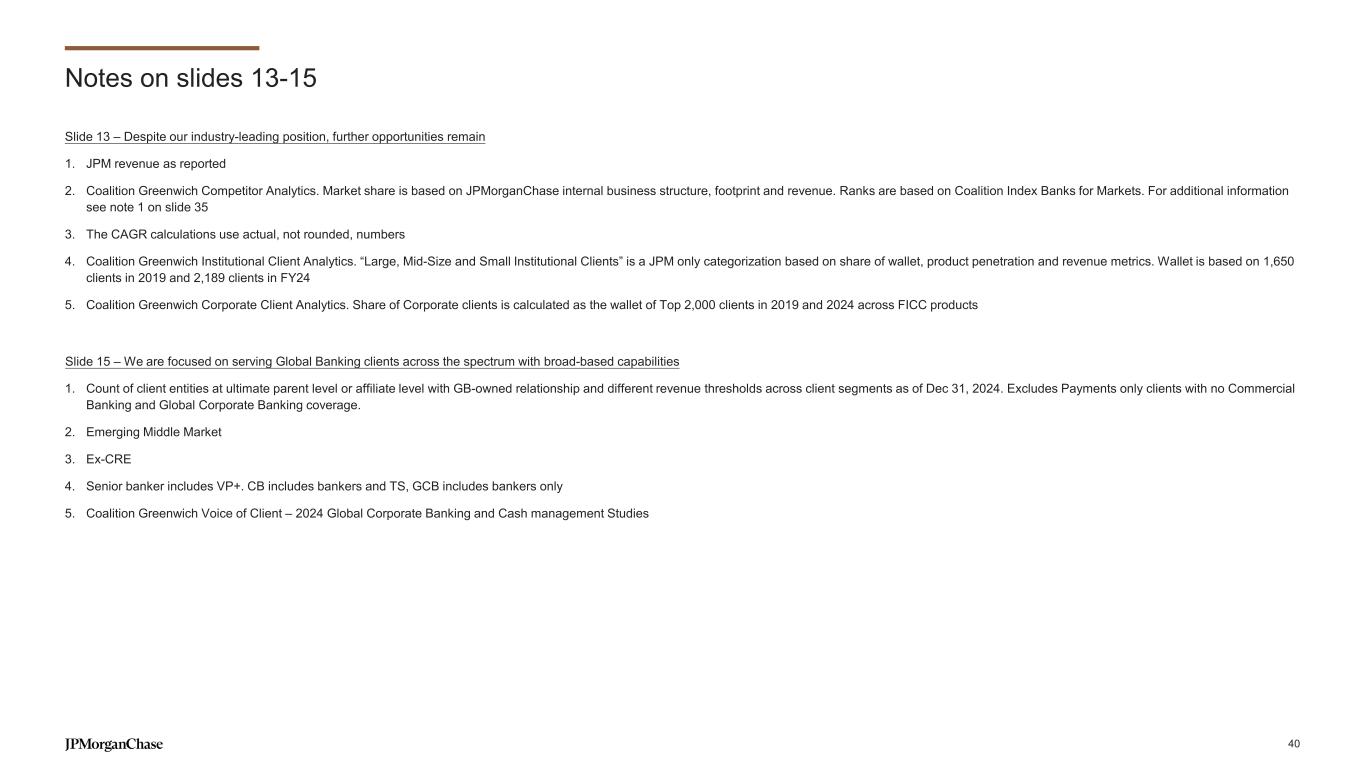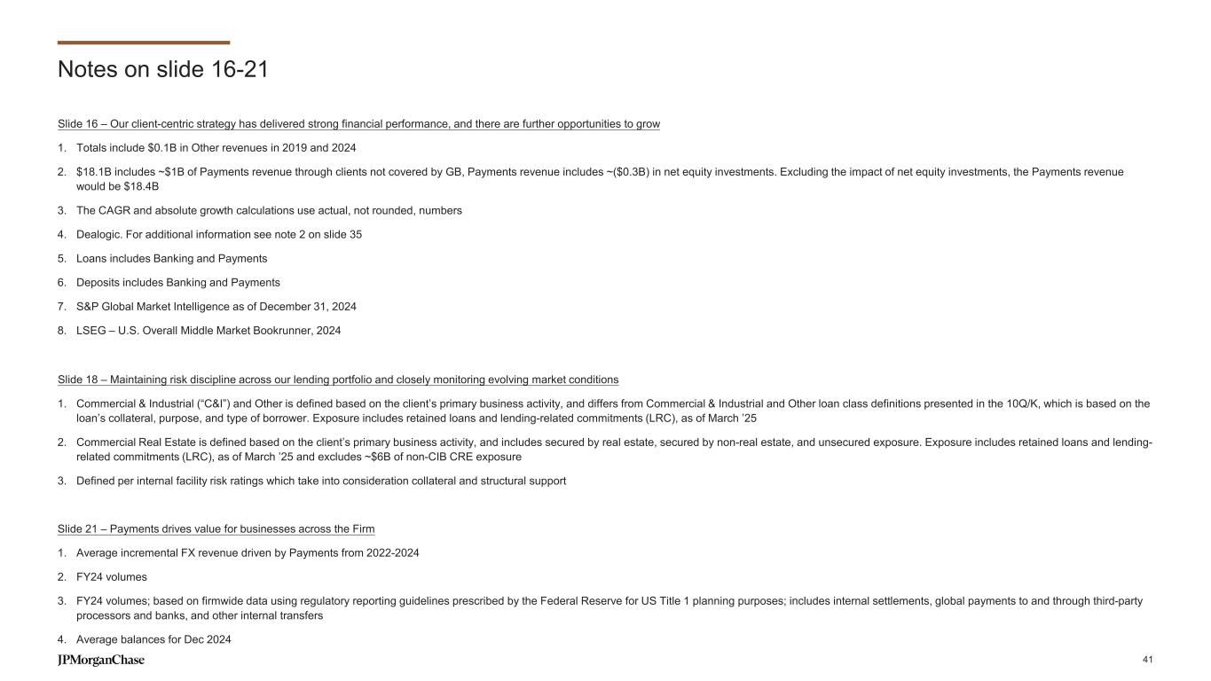 Notes on slides 13-15 Slide 13 – Despite our industry-leading position, further opportunities remain 1. JPM revenue as reported 2. Coalition Greenwich Competitor Analytics. Market share is based on JPMorganChase internal business structure, footprint and revenue. Ranks are based on Coalition Index Banks for Markets. For additional information see note 1 on slide 35 3. The CAGR calculations use actual, not rounded, numbers 4. Coalition Greenwich Institutional Client Analytics. “Large, Mid-Size and Small Institutional Clients” is a JPM only categorization based on share of wallet, product penetration and revenue metrics. Wallet is based on 1,650 clients in 2019 and 2,189 clients in FY24 5. Coalition Greenwich Corporate Client Analytics. Share of Corporate clients is calculated as the wallet of Top 2,000 clients in 2019 and 2024 across FICC products Slide 15 – We are focused on serving Global Banking clients across the spectrum with broad-based capabilities 1. Count of client entities at ultimate parent level or affiliate level with GB-owned relationship and different revenue thresholds across client segments as of Dec 31, 2024. Excludes Payments only clients with no Commercial Banking and Global Corporate Banking coverage. 2. Emerging Middle Market 3. Ex-CRE 4. Senior banker includes VP+. CB includes bankers and TS, GCB includes bankers only 5. Coalition Greenwich Voice of Client – 2024 Global Corporate Banking and Cash management Studies 40