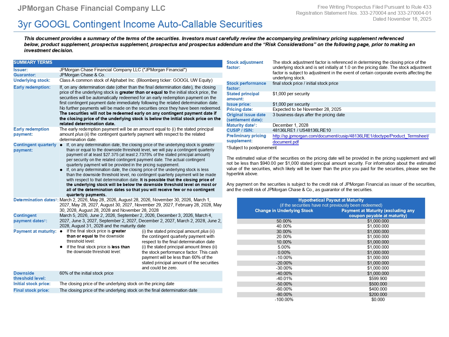 JPMorgan Chase Financial Company LLC 3yr GOOGL Contingent Income Auto - Callable Securities Free Writing Prospectus Filed Pursuant to Rule 433 Registration Statement Nos. 333 - 270004 and 333 - 270004 - 01 Dated November 18, 2025 This document provides a summary of the terms of the securities. Investors must carefully review the accompanying preliminary pricing supplement referenced below, product supplement, prospectus supplement, prospectus and prospectus addendum and the “Risk Considerations” on the following page, prior to making an investment decision. SUMMARY TERMS JPMorgan Chase Financial Company LLC ("JPMorgan Financial") Issuer: JPMorgan Chase & Co. Guarantor: Class A common stock of Alphabet Inc. (Bloomberg ticker: GOOGL UW Equity) Underlying stock: Early redemption: If, on any determination date (other than the final determination date), the closing price of the underlying stock is greater than or equal to the initial stock price, the securities will be automatically redeemed for an early redemption payment on the first contingent payment date immediately following the related determination date. No further payments will be made on the securities once they have been redeemed. The securities will not be redeemed early on any contingent payment date if the closing price of the underlying stock is below the initial stock price on the related determination date. Early redemption payment: The early redemption payment will be an amount equal to (i) the stated principal amount plus (ii) the contingent quarterly payment with respect to the related determination date. Contingent quarterly Ɣ If, on any determination date, the closing price of the underlying stock is greater payment: than or equal to the downside threshold level, we will pay a contingent quarterly payment of at least $27.375 (at least 2.7375% of the stated principal amount) per security on the related contingent payment date. The actual contingent quarterly payment will be provided in the pricing supplement. ● If, on any determination date, the closing price of the underlying stock is less than the downside threshold level, no contingent quarterly payment will be made with respect to that determination date. It is possible that the closing price of the underlying stock will be below the downside threshold level on most or all of the determination dates so that you will receive few or no contingent quarterly payments. Determination dates † : March 2, 2026, May 28, 2026, August 28, 2026, November 30, 2026, March 1, 2027, May 28, 2027, August 30, 2027, November 29, 2027, February 28, 2028, May 30, 2028, August 28, 2028 and November 28, 2028 Contingent payment dates † : March 5, 2026, June 2, 2026, September 2, 2026, December 3, 2026, March 4, 2027, June 3, 2027, September 2, 2027, December 2, 2027, March 2, 2028, June 2, 2028, August 31, 2028 and the maturity date Payment at maturity: Ɣ If the final stock price is greater than or equal to the downside threshold level: ● If the final stock price is less than the downside threshold level: (i) the stated principal amount plus (ii) the contingent quarterly payment with respect to the final determination date (i) the stated principal amount times (ii) the stock performance factor. This cash payment will be less than 60% of the stated principal amount of the securities and could be zero. Downside threshold level: 60% of the initial stock price Initial stock price: The closing price of the underlying stock on the pricing date Final stock price: The closing price of the underlying stock on the final determination date Stock adjustment factor: The stock adjustment factor is referenced in determining the closing price of the underlying stock and is set initially at 1.0 on the pricing date. The stock adjustment factor is subject to adjustment in the event of certain corporate events affecting the underlying stock. Stock performance final stock price / initial stock price factor: Stated principal $1,000 per security amount: Issue price: $1,000 per security Pricing date: Expected to be November 28, 2025 Original issue date 3 business days after the pricing date (settlement date): Maturity date † : December 1, 2028 CUSIP / ISIN: 48136LRE1 / US48136LRE10 Preliminary pricing supplement: http://sp.jpmorgan.com/document/cusip/48136LRE1/doctype/Product_Termsheet/ document.pdf † Subject to postponement The estimated value of the securities on the pricing date will be provided in the pricing supplement and will not be less than $ 940 . 00 per $ 1 , 000 stated principal amount security . For information about the estimated value of the securities, which likely will be lower than the price you paid for the securities, please see the hyperlink above . Any payment on the securities is subject to the credit risk of JPMorgan Financial as issuer of the securities, and the credit risk of JPMorgan Chase & Co., as guarantor of the securities. Hypothetical Payout at Maturity (if the securities have not previously been redeemed) Change in Underlying Stock Payment at Maturity (excluding any coupon payable at maturity) 50.00% $1,000.000 40.00% $1,000.000 30.00% $1,000.000 20.00% $1,000.000 10.00% $1,000.000 5.00% $1,000.000 0.00% $1,000.000 - 10.00% $1,000.000 - 20.00% $1,000.000 - 30.00% $1,000.000 - 40.00% $1,000.000 - 40.01% $599.900 - 50.00% $500.000 - 60.00% $400.000 - 80.00% $200.000 - 100.00% $0.000