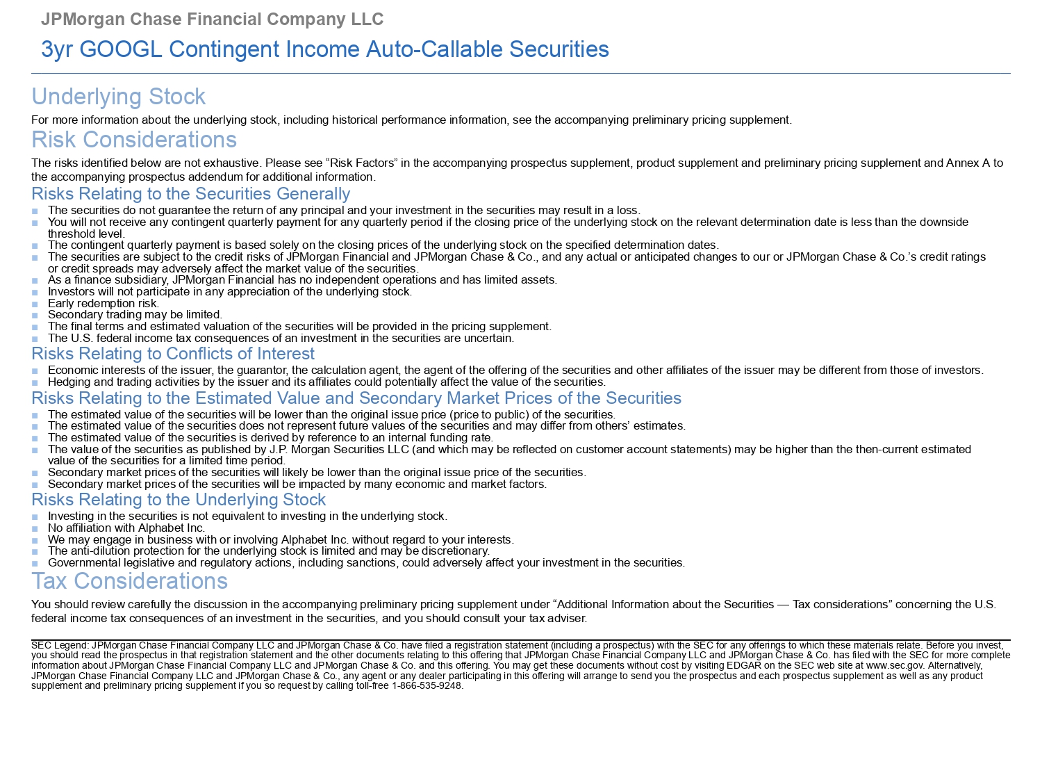 JPMorgan Chase Financial Company LLC 3yr GOOGL Contingent Income Auto - Callable Securities Underlying Stock For more information about the underlying stock, including historical performance information, see the accompanying preliminary pricing supplement. Risk Considerations The risks identified below are not exhaustive. Please see “Risk Factors” in the accompanying prospectus supplement, product supplement and preliminary pricing supplement and Annex A to the accompanying prospectus addendum for additional information. Risks Relating to the Securities Generally ■ The securities do not guarantee the return of any principal and your investment in the securities may result in a loss. ■ You will not receive any contingent quarterly payment for any quarterly period if the closing price of the underlying stock on the relevant determination date is less than the downside threshold level. ■ The contingent quarterly payment is based solely on the closing prices of the underlying stock on the specified determination dates. ■ The securities are subject to the credit risks of JPMorgan Financial and JPMorgan Chase & Co., and any actual or anticipated changes to our or JPMorgan Chase & Co.’s credit ratings or credit spreads may adversely affect the market value of the securities. ■ As a finance subsidiary, JPMorgan Financial has no independent operations and has limited assets. ■ Investors will not participate in any appreciation of the underlying stock. ■ Early redemption risk. ■ Secondary trading may be limited. ■ The final terms and estimated valuation of the securities will be provided in the pricing supplement. ■ The U.S. federal income tax consequences of an investment in the securities are uncertain. Risks Relating to Conflicts of Interest ■ Economic interests of the issuer, the guarantor, the calculation agent, the agent of the offering of the securities and other affiliates of the issuer may be different from those of investors. ■ Hedging and trading activities by the issuer and its affiliates could potentially affect the value of the securities. Risks Relating to the Estimated Value and Secondary Market Prices of the Securities ■ The estimated value of the securities will be lower than the original issue price (price to public) of the securities. ■ The estimated value of the securities does not represent future values of the securities and may differ from others’ estimates. ■ The estimated value of the securities is derived by reference to an internal funding rate. ■ The value of the securities as published by J.P. Morgan Securities LLC (and which may be reflected on customer account statements) may be higher than the then - current estimated value of the securities for a limited time period. ■ Secondary market prices of the securities will likely be lower than the original issue price of the securities. ■ Secondary market prices of the securities will be impacted by many economic and market factors. Risks Relating to the Underlying Stock ■ Investing in the securities is not equivalent to investing in the underlying stock. ■ No affiliation with Alphabet Inc. ■ We may engage in business with or involving Alphabet Inc. without regard to your interests. ■ The anti - dilution protection for the underlying stock is limited and may be discretionary. ■ Governmental legislative and regulatory actions, including sanctions, could adversely affect your investment in the securities. Tax Considerations You should review carefully the discussion in the accompanying preliminary pricing supplement under “Additional Information about the Securities — Tax considerations” concerning the U.S. federal income tax consequences of an investment in the securities, and you should consult your tax adviser. SEC Legend: JPMorgan Chase Financial Company LLC and JPMorgan Chase & Co. have filed a registration statement (including a prospectus) with the SEC for any offerings to which these materials relate. Before you invest, you should read the prospectus in that registration statement and the other documents relating to this offering that JPMorgan Chase Financial Company LLC and JPMorgan Chase & Co. has filed with the SEC for more complete information about JPMorgan Chase Financial Company LLC and JPMorgan Chase & Co. and this offering. You may get these documents without cost by visiting EDGAR on the SEC web site at www.sec.gov. Alternatively, JPMorgan Chase Financial Company LLC and JPMorgan Chase & Co., any agent or any dealer participating in this offering will arrange to send you the prospectus and each prospectus supplement as well as any product supplement and preliminary pricing supplement if you so request by calling toll - free 1 - 866 - 535 - 9248.