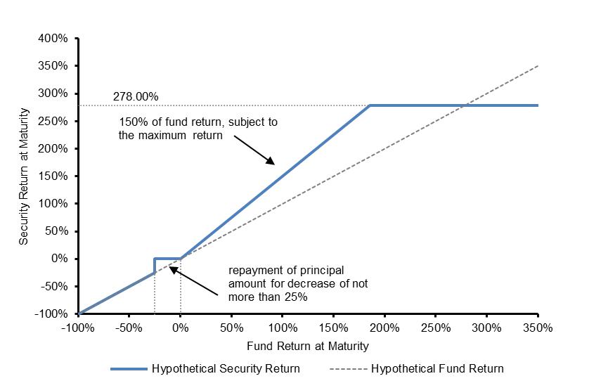 · if the ending price is greater than the starting price: $1,000 plus the lesser of: (i) $1,000 × fund return × upside participation rate; and (ii) the maximum return; · if the ending price is less than or equal to the starting price, but greater than or equal to the threshold price: $1,000; or · if the ending price is less than the threshold price: $1,000 + ($1,000 × fund return) |