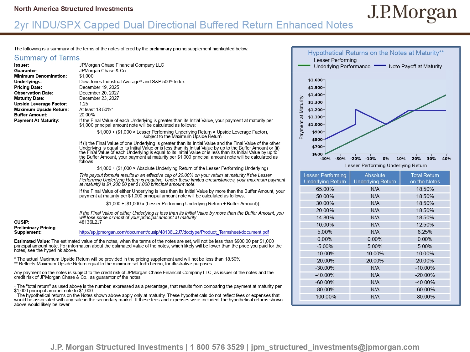 North America Structured Investments 2yr INDU/SPX Capped Dual Directional Buffered Return Enhanced Notes The following is a summary of the terms of the notes offered by the preliminary pricing supplement highlighted below. Summary of Terms Issuer: Guarantor: Minimum Denomination: Underlyings: Pricing Date: Observation Date: Maturity Date: Upside Leverage Factor: Maximum Upside Return: Buffer Amount: Payment At Maturity: JPMorgan Chase Financial Company LLC JPMorgan Chase & Co. $1,000 Dow Jones Industrial Average ® and S&P 500 ® Index December 19, 2025 December 20, 2027 December 23, 2027 1.25 At least 18.50%* 20.00% If the Final Value of each Underlying is greater than its Initial Value, your payment at maturity per $1,000 principal amount note will be calculated as follows: $1,000 + ($1,000 î Lesser Performing Underlying Return î Upside Leverage Factor), subject to the Maximum Upside Return If (i) the Final Value of one Underlying is greater than its Initial Value and the Final Value of the other Underlying is equal to its Initial Value or is less than its Initial Value by up to the Buffer Amount or (ii) the Final Value of each Underlying is equal to its Initial Value or is less than its Initial Value by up to the Buffer Amount, your payment at maturity per $1,000 principal amount note will be calculated as follows: $1,000 + ($1,000 î Absolute Underlying Return of the Lesser Performing Underlying) This payout formula results in an effective cap of 20.00% on your return at maturity if the Lesser Performing Underlying Return is negative. Under these limited circumstances, your maximum payment at maturity is $1,200.00 per $1,000 principal amount note. If the Final Value of either Underlying is less than its Initial Value by more than the Buffer Amount, your payment at maturity per $1,000 principal amount note will be calculated as follows: $1,000 + [$1,000 x (Lesser Performing Underlying Return + Buffer Amount)] If the Final Value of either Underlying is less than its Initial Value by more than the Buffer Amount, you will lose some or most of your principal amount at maturity. 48136L2J7 CUSIP: Preliminary Pricing Supplement: http://sp.jpmorgan.com/document/cusip/48136L2J7/doctype/Product_Termsheet/document.pdf Estimated Value : The estimated value of the notes, when the terms of the notes are set, will not be less than $900.00 per $1,000 principal amount note. For information about the estimated value of the notes, which likely will be lower than the price you paid for the notes, see the hyperlink above. * The actual Maximum Upside Return will be provided in the pricing supplement and will not be less than 18.50% ** Reflects Maximum Upside Return equal to the minimum set forth herein, for illustrative purposes. Any payment on the notes is subject to the credit risk of JPMorgan Chase Financial Company LLC, as issuer of the notes and the credit risk of JPMorgan Chase & Co., as guarantor of the notes. - The "total return" as used above is the number, expressed as a percentage, that results from comparing the payment at maturity per $1,000 principal amount note to $1,000. - The hypothetical returns on the Notes shown above apply only at maturity. These hypotheticals do not reflect fees or expenses that would be associated with any sale in the secondary market. If these fees and expenses were included, the hypothetical returns shown above would likely be lower. Hypothetical Returns on the Notes at Maturity** Lesser Performing Underlying Performance Note Payoff at Maturity Payment at Maturity Lesser Performing Underlying Return Total Return on the Notes Absolute Underlying Return Lesser Performing Underlying Return 18.50% N/A 65.00% 18.50% N/A 50.00% 18.50% N/A 30.00% 18.50% N/A 20.00% 18.50% N/A 14.80% 12.50% N/A 10.00% 6.25% N/A 5.00% 0.00% 0.00% 0.00% 5.00% 5.00% - 5.00% 10.00% 10.00% - 10.00% 20.00% 20.00% - 20.00% - 10.00% N/A - 30.00% - 20.00% N/A - 40.00% - 40.00% N/A - 60.00% - 60.00% N/A - 80.00% - 80.00% N/A - 100.00% J.P. Morgan Structured Investments | 1 800 576 3529 | jpm_structured_investments@jpmorgan.com