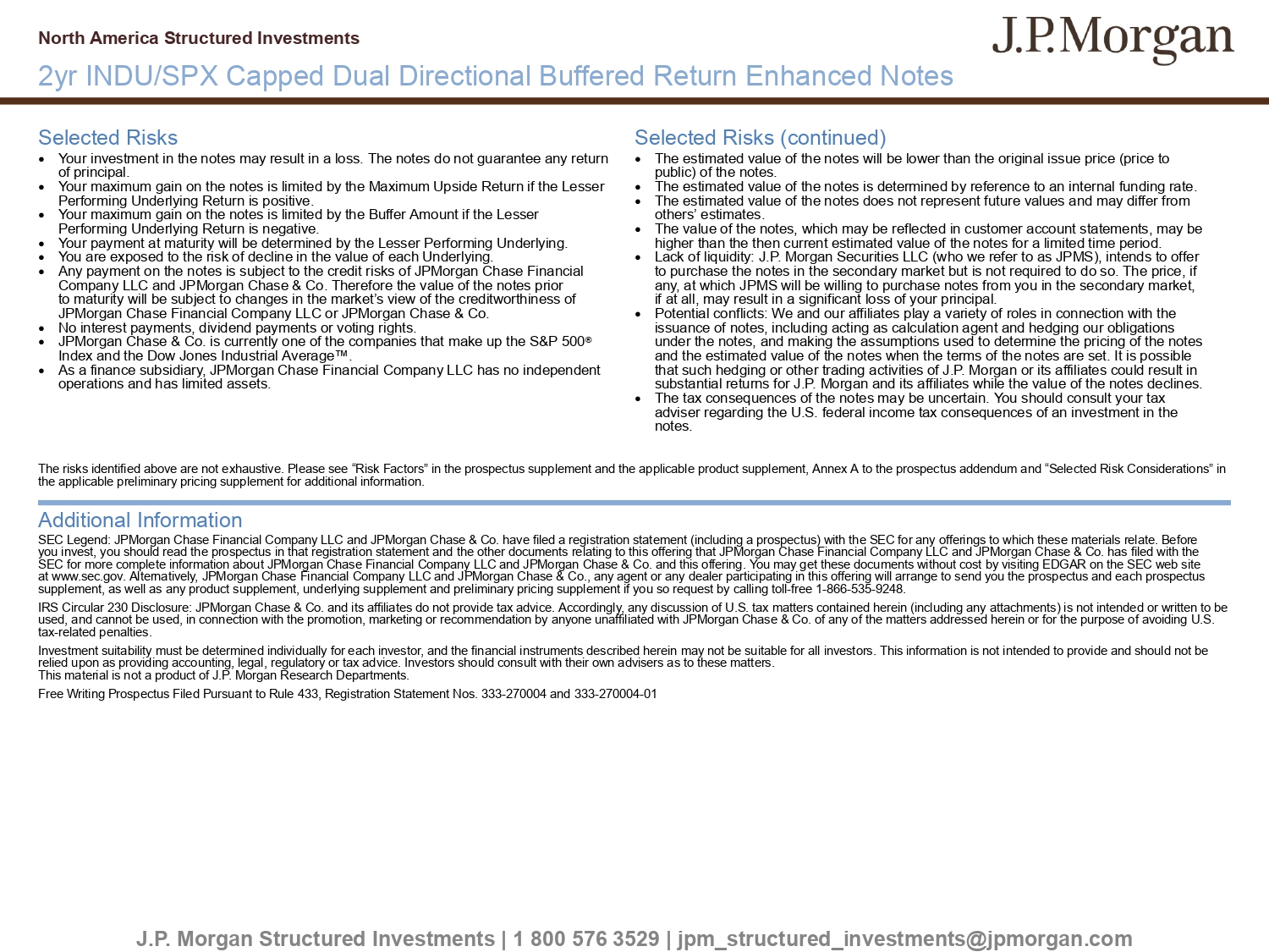 North America Structured Investments 2yr INDU/SPX Capped Dual Directional Buffered Return Enhanced Notes Ɣ Your investment in the notes may result in a loss. The notes do not guarantee any return of principal. Your maximum gain on the notes is limited by the Maximum Upside Return if the Lesser Performing Underlying Return is positive. Your maximum gain on the notes is limited by the Buffer Amount if the Lesser Performing Underlying Return is negative. Your payment at maturity will be determined by the Lesser Performing Underlying. You are exposed to the risk of decline in the value of each Underlying. Any payment on the notes is subject to the credit risks of JPMorgan Chase Financial Company LLC and JPMorgan Chase & Co. Therefore the value of the notes prior to maturity will be subject to changes in the market’s view of the creditworthiness of JPMorgan Chase Financial Company LLC or JPMorgan Chase & Co. No interest payments, dividend payments or voting rights. JPMorgan Chase & Co. is currently one of the companies that make up the S&P 500 ® Index and the Dow Jones Industrial Average . As a finance subsidiary, JPMorgan Chase Financial Company LLC has no independent operations and has limited assets. Selected Risks Selected Risks (continued) Ɣ Ɣ Ɣ Ɣ Ɣ Ɣ Ɣ Ɣ Ɣ The estimated value of the notes will be lower than the original issue price (price to public) of the notes. The estimated value of the notes is determined by reference to an internal funding rate. The estimated value of the notes does not represent future values and may differ from others’ estimates. The value of the notes, which may be reflected in customer account statements, may be higher than the then current estimated value of the notes for a limited time period. Lack of liquidity : J . P . Morgan Securities LLC (who we refer to as JPMS), intends to offer to purchase the notes in the secondary market but is not required to do so . The price, if any, at which JPMS will be willing to purchase notes from you in the secondary market, if at all, may result in a significant loss of your principal . Potential conflicts: We and our affiliates play a variety of roles in connection with the issuance of notes, including acting as calculation agent and hedging our obligations under the notes, and making the assumptions used to determine the pricing of the notes and the estimated value of the notes when the terms of the notes are set. It is possible that such hedging or other trading activities of J.P. Morgan or its affiliates could result in substantial returns for J.P. Morgan and its affiliates while the value of the notes declines. The tax consequences of the notes may be uncertain. You should consult your tax adviser regarding the U.S. federal income tax consequences of an investment in the notes. Ɣ Ɣ Ɣ Ɣ Ɣ Ɣ The risks identified above are not exhaustive. Please see “Risk Factors” in the prospectus supplement and the applicable product supplement, Annex A to the prospectus addendum and “Selected Risk Considerations” in the applicable preliminary pricing supplement for additional information. Additional Information SEC Legend: JPMorgan Chase Financial Company LLC and JPMorgan Chase & Co. have filed a registration statement (including a prospectus) with the SEC for any offerings to which these materials relate. Before you invest, you should read the prospectus in that registration statement and the other documents relating to this offering that JPMorgan Chase Financial Company LLC and JPMorgan Chase & Co. has filed with the SEC for more complete information about JPMorgan Chase Financial Company LLC and JPMorgan Chase & Co. and this offering. You may get these documents without cost by visiting EDGAR on the SEC web site at www.sec.gov. Alternatively, JPMorgan Chase Financial Company LLC and JPMorgan Chase & Co., any agent or any dealer participating in this offering will arrange to send you the prospectus and each prospectus supplement, as well as any product supplement, underlying supplement and preliminary pricing supplement if you so request by calling toll - free 1 - 866 - 535 - 9248. IRS Circular 230 Disclosure: JPMorgan Chase & Co. and its affiliates do not provide tax advice. Accordingly, any discussion of U.S. tax matters contained herein (including any attachments) is not intended or written to be used, and cannot be used, in connection with the promotion, marketing or recommendation by anyone unaffiliated with JPMorgan Chase & Co. of any of the matters addressed herein or for the purpose of avoiding U.S. tax - related penalties. Investment suitability must be determined individually for each investor, and the financial instruments described herein may not be suitable for all investors. This information is not intended to provide and should not be relied upon as providing accounting, legal, regulatory or tax advice. Investors should consult with their own advisers as to these matters. This material is not a product of J.P. Morgan Research Departments. Free Writing Prospectus Filed Pursuant to Rule 433, Registration Statement Nos. 333 - 270004 and 333 - 270004 - 01 J.P. Morgan Structured Investments | 1 800 576 3529 | jpm_structured_investments@jpmorgan.com