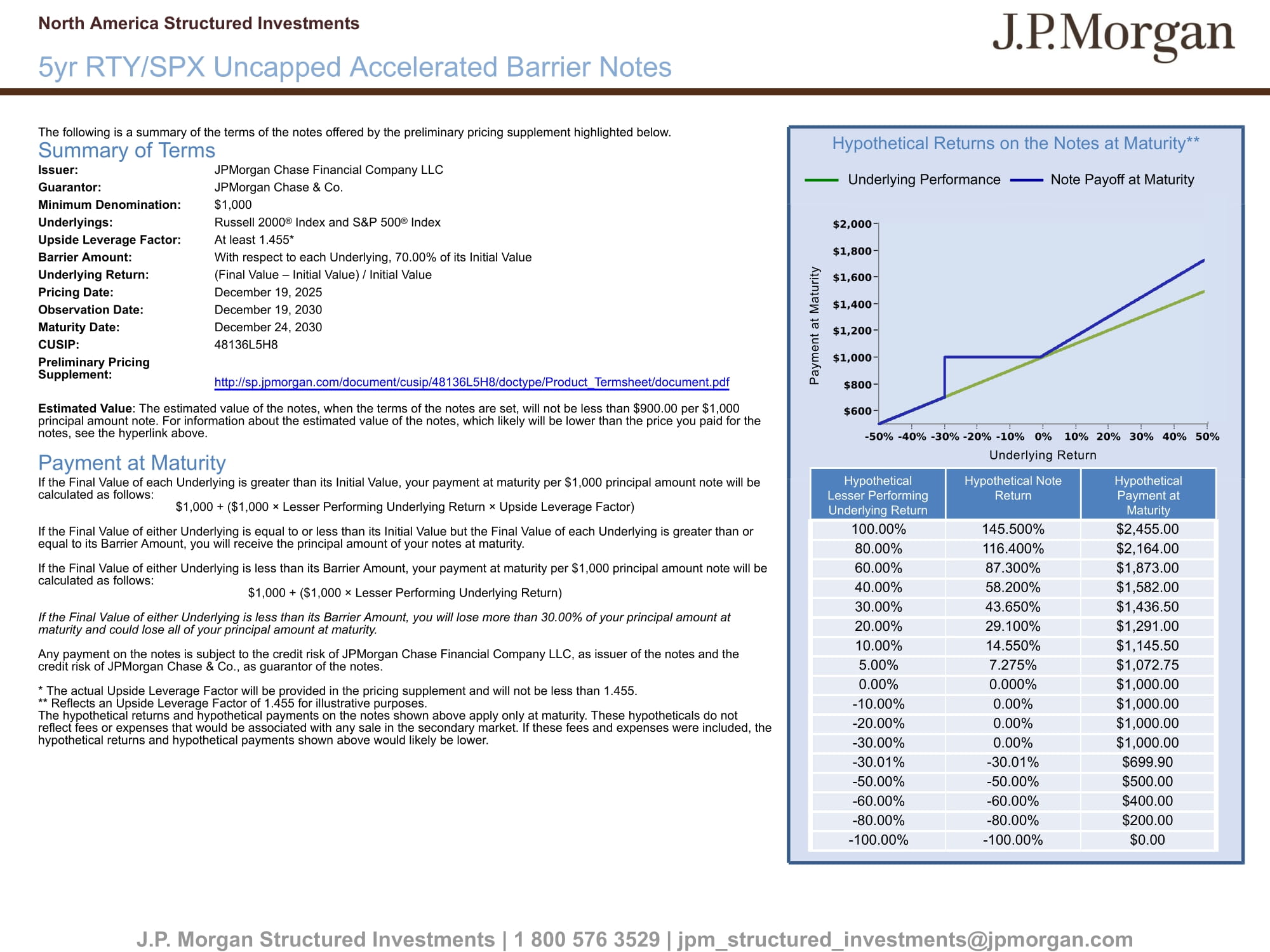 North America Structured Investments 5yr RTY/SPX Uncapped Accelerated Barrier Notes J.P. Morgan Structured Investments | 1 800 576 3529 | jpm_structured_investments@jpmorgan.com The following is a summary of the terms of the notes offered by the preliminary pricing supplement highlighted below. Summary of Terms Issuer: JPMorgan Chase Financial Company LLC Guarantor: JPMorgan Chase & Co. Minimum Denomination: $1,000 Underlyings: Russell 2000 ® Index and S&P 500 ® Index Upside Leverage Factor: At least 1.455* Barrier Amount: With respect to each Underlying, 70.00% of its Initial Value Underlying Return: (Final Value – Initial Value) / Initial Value Pricing Date: December 19, 2025 Observation Date: December 19, 2030 Maturity Date: December 24, 2030 CUSIP: 48136L5H8 Preliminary Pricing Supplement: http://sp.jpmorgan.com/document/cusip/48136L5H8/doctype/Product_Termsheet/document.pdf Estimated Value : The estimated value of the notes, when the terms of the notes are set, will not be less than $900.00 per $1,000 principal amount note. For information about the estimated value of the notes, which likely will be lower than the price you pai d for the notes, see the hyperlink above. Payment at Maturity If the Final Value of each Underlying is greater than its Initial Value, your payment at maturity per $1,000 principal amount no te will be calculated as follows: $1,000 + ($1,000 × Lesser Performing Underlying Return × Upside Leverage Factor) If the Final Value of either Underlying is equal to or less than its Initial Value but the Final Value of each Underlying is gre ater than or equal to its Barrier Amount, you will receive the principal amount of your notes at maturity. If the Final Value of either Underlying is less than its Barrier Amount, your payment at maturity per $1,000 principal amount no te will be calculated as follows: $1,000 + ($1,000 × Lesser Performing Underlying Return) If the Final Value of either Underlying is less than its Barrier Amount, you will lose more than 30.00% of your principal amo unt at maturity and could lose all of your principal amount at maturity. Any payment on the notes is subject to the credit risk of JPMorgan Chase Financial Company LLC, as issuer of the notes and th e credit risk of JPMorgan Chase & Co., as guarantor of the notes. * The actual Upside Leverage Factor will be provided in the pricing supplement and will not be less than 1.455. ** Reflects an Upside Leverage Factor of 1.455 for illustrative purposes. The hypothetical returns and hypothetical payments on the notes shown above apply only at maturity. These hypotheticals do no t reflect fees or expenses that would be associated with any sale in the secondary market. If these fees and expenses were incl ude d, the hypothetical returns and hypothetical payments shown above would likely be lower. Hypothetical Returns on the Notes at Maturity** Underlying Performance Note Payoff at Maturity Payment at Maturity Underlying Return Hypothetical Lesser Performing Underlying Return Hypothetical Note Return Hypothetical Payment at Maturity 100.00% 145.500% $2,455.00 80.00% 116.400% $2,164.00 60.00% 87.300% $1,873.00 40.00% 58.200% $1,582.00 30.00% 43.650% $1,436.50 20.00% 29.100% $1,291.00 10.00% 14.550% $1,145.50 5.00% 7.275% $1,072.75 0.00% 0.000% $1,000.00 - 10.00% 0.00% $1,000.00 - 20.00% 0.00% $1,000.00 - 30.00% 0.00% $1,000.00 - 30.01% - 30.01% $699.90 - 50.00% - 50.00% $500.00 - 60.00% - 60.00% $400.00 - 80.00% - 80.00% $200.00 - 100.00% - 100.00% $0.00
