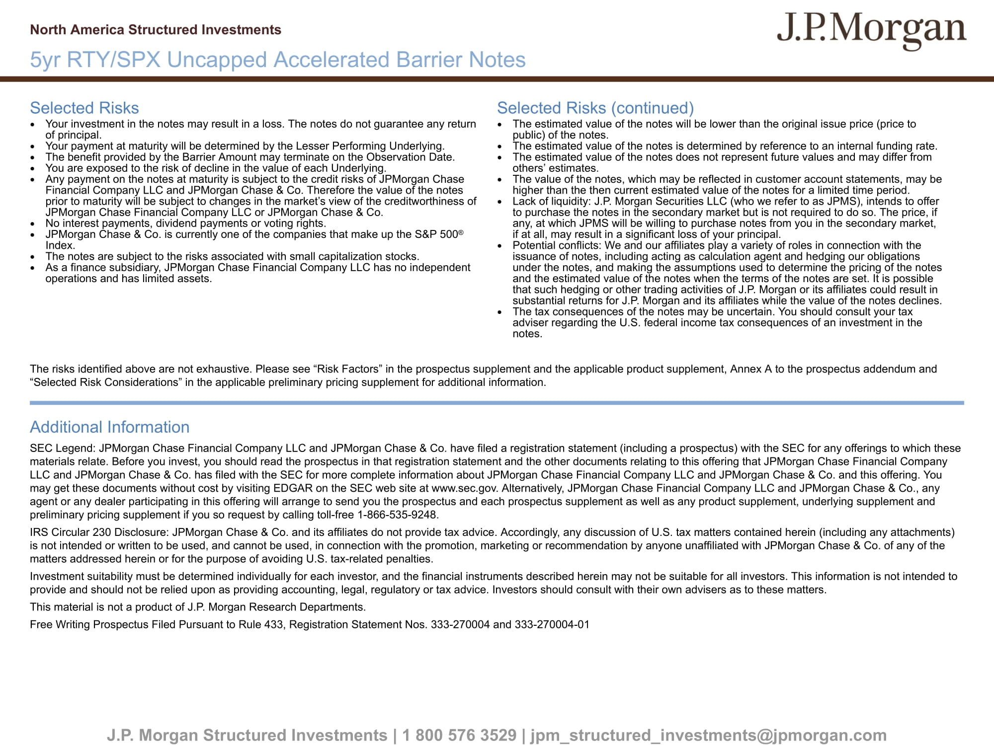 North America Structured Investments 5yr RTY/SPX Uncapped Accelerated Barrier Notes J.P. Morgan Structured Investments | 1 800 576 3529 | jpm_structured_investments@jpmorgan.com Selected Risks ● Your investment in the notes may result in a loss. The notes do not guarantee any return of principal. ● Your payment at maturity will be determined by the Lesser Performing Underlying. ● The benefit provided by the Barrier Amount may terminate on the Observation Date. ● You are exposed to the risk of decline in the value of each Underlying. ● Any payment on the notes at maturity is subject to the credit risks of JPMorgan Chase Financial Company LLC and JPMorgan Chase & Co. Therefore the value of the notes prior to maturity will be subject to changes in the market’s view of the creditworthiness of JPMorgan Chase Financial Company LLC or JPMorgan Chase & Co. ● No interest payments, dividend payments or voting rights. ● JPMorgan Chase & Co. is currently one of the companies that make up the S&P 500 ® Index. ● The notes are subject to the risks associated with small capitalization stocks. ● As a finance subsidiary, JPMorgan Chase Financial Company LLC has no independent operations and has limited assets. Selected Risks (continued) ● The estimated value of the notes will be lower than the original issue price (price to public) of the notes. ● The estimated value of the notes is determined by reference to an internal funding rate. ● The estimated value of the notes does not represent future values and may differ from others’ estimates. ● The value of the notes, which may be reflected in customer account statements, may be higher than the then current estimated value of the notes for a limited time period. ● Lack of liquidity: J.P. Morgan Securities LLC (who we refer to as JPMS), intends to offer to purchase the notes in the secondary market but is not required to do so. The price, if any, at which JPMS will be willing to purchase notes from you in the secondary market, if at all, may result in a significant loss of your principal. ● Potential conflicts: We and our affiliates play a variety of roles in connection with the issuance of notes, including acting as calculation agent and hedging our obligations under the notes, and making the assumptions used to determine the pricing of the notes and the estimated value of the notes when the terms of the notes are set. It is possible that such hedging or other trading activities of J.P. Morgan or its affiliates could result in substantial returns for J.P. Morgan and its affiliates while the value of the notes declines. ● The tax consequences of the notes may be uncertain. You should consult your tax adviser regarding the U.S. federal income tax consequences of an investment in the notes. The risks identified above are not exhaustive. Please see “Risk Factors” in the prospectus supplement and the applicable prod uct supplement, Annex A to the prospectus addendum and “Selected Risk Considerations” in the applicable preliminary pricing supplement for additional information. Additional Information SEC Legend: JPMorgan Chase Financial Company LLC and JPMorgan Chase & Co. have filed a registration statement (including a pr osp ectus) with the SEC for any offerings to which these materials relate. Before you invest, you should read the prospectus in that registration statement and the other documents re lat ing to this offering that JPMorgan Chase Financial Company LLC and JPMorgan Chase & Co. has filed with the SEC for more complete information about JPMorgan Chase Financial Company LLC and JPMorgan Chase & Co. and this offering. You may get these documents without cost by visiting EDGAR on the SEC web site at www.sec.gov. Alternatively, JPMorgan Chase Fina nci al Company LLC and JPMorgan Chase & Co., any agent or any dealer participating in this offering will arrange to send you the prospectus and each prospectus supplement as wel l as any product supplement, underlying supplement and preliminary pricing supplement if you so request by calling toll - free 1 - 866 - 535 - 9248. IRS Circular 230 Disclosure: JPMorgan Chase & Co. and its affiliates do not provide tax advice. Accordingly, any discussion o f U .S. tax matters contained herein (including any attachments) is not intended or written to be used, and cannot be used, in connection with the promotion, marketing or recommendation by a nyo ne unaffiliated with JPMorgan Chase & Co. of any of the matters addressed herein or for the purpose of avoiding U.S. tax - related penalties. Investment suitability must be determined individually for each investor, and the financial instruments described herein may not be suitable for all investors. This information is not intended to provide and should not be relied upon as providing accounting, legal, regulatory or tax advice. Investors should consult with th eir own advisers as to these matters. This material is not a product of J.P. Morgan Research Departments. Free Writing Prospectus Filed Pursuant to Rule 433, Registration Statement Nos. 333 - 270004 and 333 - 270004 - 01