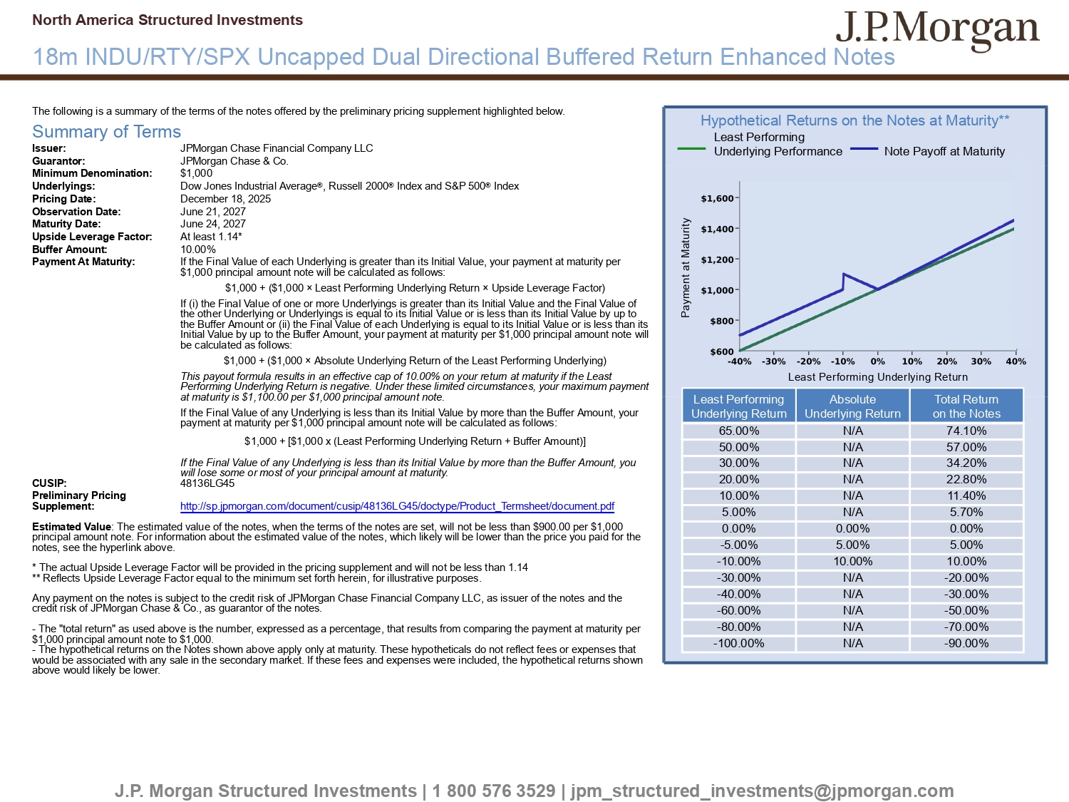 North America Structured Investments 18m INDU/RTY/SPX Uncapped Dual Directional Buffered Return Enhanced Notes The following is a summary of the terms of the notes offered by the preliminary pricing supplement highlighted below. Summary of Terms Issuer: Guarantor: Minimum Denomination: Underlyings: Pricing Date: Observation Date: Maturity Date: Upside Leverage Factor: Buffer Amount: Payment At Maturity: JPMorgan Chase Financial Company LLC JPMorgan Chase & Co. $1,000 Dow Jones Industrial Average ® , Russell 2000 ® Index and S&P 500 ® Index December 18, 2025 June 21, 2027 June 24, 2027 At least 1.14* 10.00% If the Final Value of each Underlying is greater than its Initial Value, your payment at maturity per $1,000 principal amount note will be calculated as follows: $1,000 + ($1,000 î Least Performing Underlying Return î Upside Leverage Factor) If (i) the Final Value of one or more Underlyings is greater than its Initial Value and the Final Value of the other Underlying or Underlyings is equal to its Initial Value or is less than its Initial Value by up to the Buffer Amount or (ii) the Final Value of each Underlying is equal to its Initial Value or is less than its Initial Value by up to the Buffer Amount, your payment at maturity per $1,000 principal amount note will be calculated as follows: $1,000 + ($1,000 î Absolute Underlying Return of the Least Performing Underlying) This payout formula results in an effective cap of 10.00% on your return at maturity if the Least Performing Underlying Return is negative. Under these limited circumstances, your maximum payment at maturity is $1,100.00 per $1,000 principal amount note. If the Final Value of any Underlying is less than its Initial Value by more than the Buffer Amount, your payment at maturity per $1,000 principal amount note will be calculated as follows: $1,000 + [$1,000 x (Least Performing Underlying Return + Buffer Amount)] If the Final Value of any Underlying is less than its Initial Value by more than the Buffer Amount, you will lose some or most of your principal amount at maturity. 48136LG45 CUSIP: Preliminary Pricing Supplement: http://sp.jpmorgan.com/document/cusip/48136LG45/doctype/Product_Termsheet/document.pdf Estimated Value : The estimated value of the notes, when the terms of the notes are set, will not be less than $900.00 per $1,000 principal amount note. For information about the estimated value of the notes, which likely will be lower than the price you paid for the notes, see the hyperlink above. * The actual Upside Leverage Factor will be provided in the pricing supplement and will not be less than 1.14 ** Reflects Upside Leverage Factor equal to the minimum set forth herein, for illustrative purposes. Any payment on the notes is subject to the credit risk of JPMorgan Chase Financial Company LLC, as issuer of the notes and the credit risk of JPMorgan Chase & Co., as guarantor of the notes. - The "total return" as used above is the number, expressed as a percentage, that results from comparing the payment at maturity per $1,000 principal amount note to $1,000. - The hypothetical returns on the Notes shown above apply only at maturity. These hypotheticals do not reflect fees or expenses that would be associated with any sale in the secondary market. If these fees and expenses were included, the hypothetical returns shown above would likely be lower. Hypothetical Returns on the Notes at Maturity** Least Performing Underlying Performance Note Payoff at Maturity Payment at Maturity Least Performing Underlying Return Total Return on the Notes Absolute Underlying Return Least Performing Underlying Return 74.10% N/A 65.00% 57.00% N/A 50.00% 34.20% N/A 30.00% 22.80% N/A 20.00% 11.40% N/A 10.00% 5.70% N/A 5.00% 0.00% 0.00% 0.00% 5.00% 5.00% - 5.00% 10.00% 10.00% - 10.00% - 20.00% N/A - 30.00% - 30.00% N/A - 40.00% - 50.00% N/A - 60.00% - 70.00% N/A - 80.00% - 90.00% N/A - 100.00% J.P. Morgan Structured Investments | 1 800 576 3529 | jpm_structured_investments@jpmorgan.com
