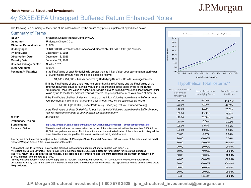 The following is a summary of the terms of the notes offered by the preliminary pricing supplement hyperlinked below. Summary of Terms Issuer: JPMorgan Chase Financial Company LLC Guarantor: JPMorgan Chase & Co. Minimum Denomination: $1,000 Underlyings : EURO STOXX 50 ® Index (the “Index”) and iShares ® MSCI EAFE ETF (the “Fund”) Pricing Date: December 18, 2025 Observation Date: December 18, 2029 Maturity Date: December 21, 2029 Upside Leverage Factor: At least 1.75* Buffer Amount: 10.00% Payment At Maturity: If the Final Value of each Underlying is greater than its Initial Value, your payment at maturity per $1,000 principal amount note will be calculated as follows: $1,000 + ($1,000 î Lesser Performing Underlying Return î Upside Leverage Factor) If (i) the Final Value of one Underlying is greater than its Initial Value and the Final Value of the other Underlying is equal to its Initial Value or is less than its Initial Value by up to the Buffer Amount or (ii) the Final Value of each Underlying is equal to its Initial Value or is less than its Initial Value by up to the Buffer Amount, you will receive the principal amount of your notes at maturity. If the Final Value of either Underlying is less than its Initial Value by more than the Buffer Amount, your payment at maturity per $1,000 principal amount note will be calculated as follows: $1,000 + [$1,000 î (Lesser Performing Underlying Return + Buffer Amount)] If the Final Value of either Underlying is less than its Initial Value by more than the Buffer Amount, you will lose some or most of your principal amount at maturity. CUSIP: 48136LH85 Preliminary Pricing Supplement: https://sp.jpmorgan.com/document/cusip/48136LH85/doctype/Product_Termsheet/document.pdf Estimated Value: The estimated value of the notes, when the terms of the notes are set, will not be less than $900.00 per $1,000 principal amount note. For information about the estimated value of the notes, which likely will be lower than the price you paid for the notes, please see the hyperlink above. Any payment on the notes is subject to the credit risk of JPMorgan Chase Financial Company LLC, as issuer of the notes, and t he credit risk of JPMorgan Chase & Co., as guarantor of the notes. * The actual Upside Leverage Factor will be provided in the pricing supplement and will not be less than 1.75. ** Reflects an Upside Leverage Factor equal to the minimum Upside Leverage Factor set forth herein for illustrative purposes. The “total return” as used above is the number, expressed as a percentage, that results from comparing the payment at maturit y p er $1,000 principal amount note to $1,000. The hypothetical returns shown above apply only at maturity. These hypotheticals do not reflect fees or expenses that would b e associated with any sale in the secondary market. If these fees and expenses were included, the hypothetical returns shown ab ove would likely be lower. J.P. Morgan Structured Investments | 1 800 576 3529 | jpm_structured_investments@jpmorgan.com Total Return on the Notes Lesser Performing Underlying Return Final Value of Lesser Performing Underlying 113.75% 65.00% 165.00 87.50% 50.00% 150.00 70.00% 40.00% 140.00 52.50% 30.00% 130.00 35.00% 20.00% 120.00 17.50% 10.00% 110.00 8.75% 5.00% 105.00 0.00% 0.00% 100.00 0.00% - 5.00% 95.00 0.00% - 10.00% 90.00 - 10.00% - 20.00% 80.00 - 20.00% - 30.00% 70.00 - 30.00% - 40.00% 60.00 - 40.00% - 50.00% 50.00 - 50.00% - 60.00% 40.00 - 60.00% - 70.00% 30.00 - 70.00% - 80.00% 20.00 - 80.00% - 90.00% 10.00 - 90.00% - 100.00% 0.00 4y SX5E/EFA Uncapped Buffered Return Enhanced Notes North America Structured Investments Hypothetical Total Returns**