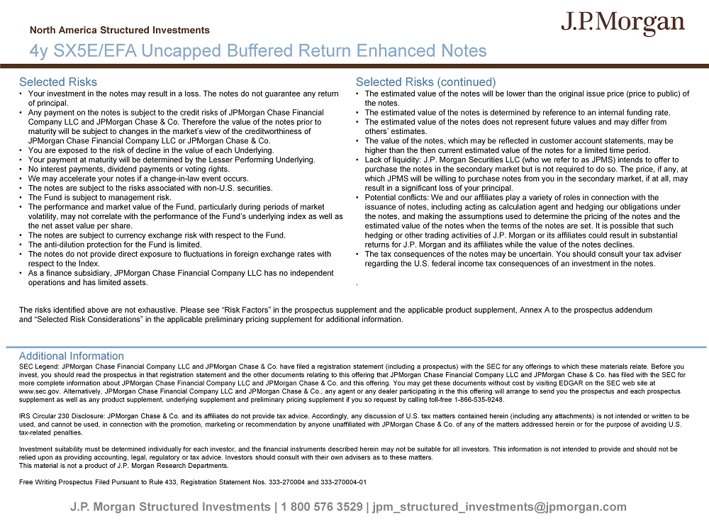 J.P. Morgan Structured Investments | 1 800 576 3529 | jpm_structured_investments@jpmorgan.com Selected Risks • Your investment in the notes may result in a loss. The notes do not guarantee any return of principal. • Any payment on the notes is subject to the credit risks of JPMorgan Chase Financial Company LLC and JPMorgan Chase & Co. Therefore the value of the notes prior to maturity will be subject to changes in the market’s view of the creditworthiness of JPMorgan Chase Financial Company LLC or JPMorgan Chase & Co. • You are exposed to the risk of decline in the value of each Underlying. • Your payment at maturity will be determined by the Lesser Performing Underlying. • No interest payments, dividend payments or voting rights. • We may accelerate your notes if a change - in - law event occurs. • The notes are subject to the risks associated with non - U.S. securities. • The Fund is subject to management risk. • The performance and market value of the Fund, particularly during periods of market volatility, may not correlate with the performance of the Fund’s underlying index as well as the net asset value per share. • The notes are subject to currency exchange risk with respect to the Fund. • The anti - dilution protection for the Fund is limited. • The notes do not provide direct exposure to fluctuations in foreign exchange rates with respect to the Index. • As a finance subsidiary, JPMorgan Chase Financial Company LLC has no independent operations and has limited assets. Selected Risks (continued) • The estimated value of the notes will be lower than the original issue price (price to public) of the notes. • The estimated value of the notes is determined by reference to an internal funding rate. • The estimated value of the notes does not represent future values and may differ from others’ estimates. • The value of the notes, which may be reflected in customer account statements, may be higher than the then current estimated value of the notes for a limited time period. • Lack of liquidity: J.P. Morgan Securities LLC (who we refer to as JPMS) intends to offer to purchase the notes in the secondary market but is not required to do so. The price, if any, at which JPMS will be willing to purchase notes from you in the secondary market, if at all, may result in a significant loss of your principal. • Potential conflicts: We and our affiliates play a variety of roles in connection with the issuance of notes, including acting as calculation agent and hedging our obligations under the notes, and making the assumptions used to determine the pricing of the notes and the estimated value of the notes when the terms of the notes are set. It is possible that such hedging or other trading activities of J.P. Morgan or its affiliates could result in substantial returns for J.P. Morgan and its affiliates while the value of the notes declines. • The tax consequences of the notes may be uncertain. You should consult your tax adviser regarding the U.S. federal income tax consequences of an investment in the notes. . Additional Information SEC Legend: JPMorgan Chase Financial Company LLC and JPMorgan Chase & Co. have filed a registration statement (including a pr osp ectus) with the SEC for any offerings to which these materials relate. Before you invest, you should read the prospectus in that registration statement and the other documents relating to this offering that JPM organ Chase Financial Company LLC and JPMorgan Chase & Co. has filed with the SEC for more complete information about JPMorgan Chase Financial Company LLC and JPMorgan Chase & Co. and this offering. You may get the se documents without cost by visiting EDGAR on the SEC web site at www.sec.gov. Alternatively, JPMorgan Chase Financial Company LLC and JPMorgan Chase & Co., any agent or any dealer participat ing in the this offering will arrange to send you the prospectus and each prospectus supplement as well as any product supplement, underlying supplement and preliminary pricing supplement if you so request by c all ing toll - free 1 - 866 - 535 - 9248. IRS Circular 230 Disclosure: JPMorgan Chase & Co. and its affiliates do not provide tax advice. Accordingly, any discussion o f U .S. tax matters contained herein (including any attachments) is not intended or written to be used, and cannot be used, in connection with the promotion, marketing or recommendation by anyone unaffiliated with JPMorgan Cha se & Co. of any of the matters addressed herein or for the purpose of avoiding U.S. tax - related penalties. Investment suitability must be determined individually for each investor, and the financial instruments described herein may not be suitable for all investors. This information is not intended to provide and should not be relied upon as providing accounting, legal, regulatory or tax advice. Investors should consult with their own advisers as to the se matters. This material is not a product of J.P. Morgan Research Departments. Free Writing Prospectus Filed Pursuant to Rule 433, Registration Statement Nos. 333 - 270004 and 333 - 270004 - 01 North America Structured Investments 4y SX5E/EFA Uncapped Buffered Return Enhanced Notes The risks identified above are not exhaustive. Please see “Risk Factors” in the prospectus supplement and the applicable prod uct supplement, Annex A to the prospectus addendum and “Selected Risk Considerations” in the applicable preliminary pricing supplement for additional information.