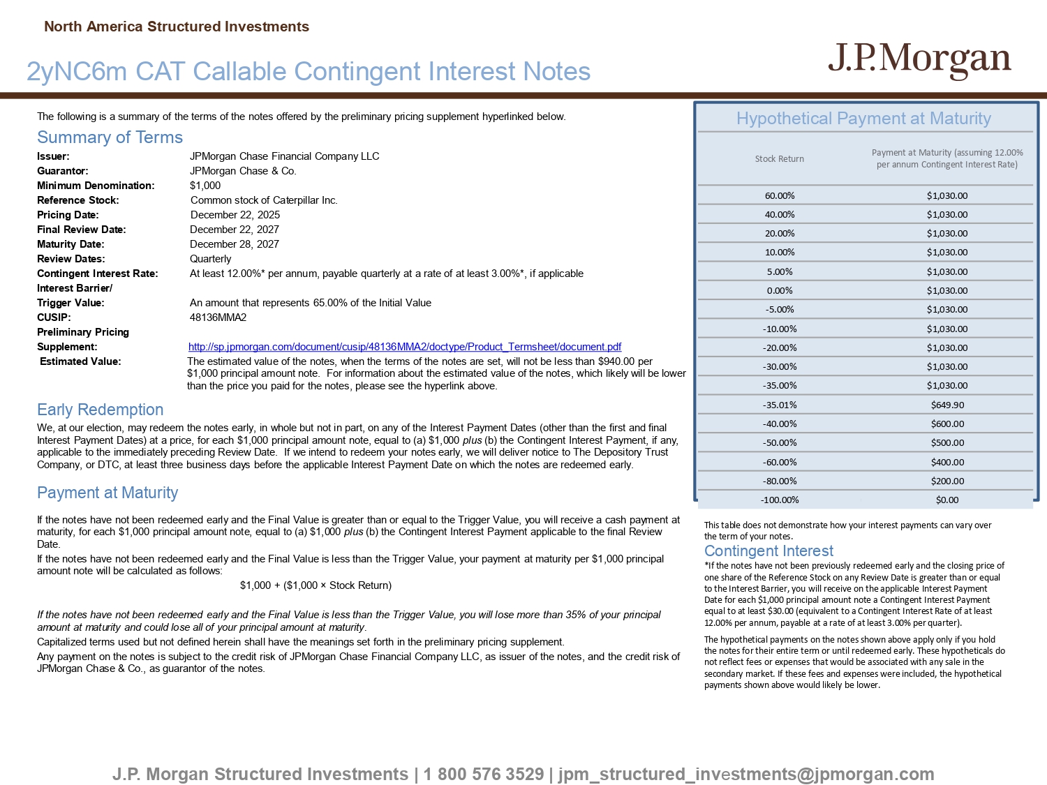 The following is a summary of the terms of the notes offered by the preliminary pricing supplement hyperlinked below. Summary of Terms Issuer: JPMorgan Chase Financial Company LLC Guarantor: JPMorgan Chase & Co. Minimum Denomination: $1,000 Reference Stock: Common stock of Caterpillar Inc. Pricing Date: December 22, 2025 Final Review Date: December 22, 2027 Maturity Date: December 28, 2027 Review Dates: Quarterly Contingent Interest Rate: At least 12.00%* per annum, payable quarterly at a rate of at least 3.00%*, if applicable Interest Barrier/ Trigger Value: An amount that represents 65.00% of the Initial Value CUSIP: 48136MMA2 Preliminary Pricing Supplement: http://sp.jpmorgan.com/document/cusip/48136MMA2/doctype/Product_Termsheet/document.pdf Estimated Value: The estimated value of the notes, when the terms of the notes are set, will not be less than $940.00 per $1,000 principal amount note. For information about the estimated value of the notes, which likely will be lower than the price you paid for the notes, please see the hyperlink above. Early Redemption We, at our election, may redeem the notes early, in whole but not in part, on any of the Interest Payment Dates (other than t he first and final Interest Payment Dates) at a price, for each $1,000 principal amount note, equal to (a) $1,000 plus (b) the Contingent Interest Payment, if any, applicable to the immediately preceding Review Date. If we intend to redeem your notes early, we will deliver notice to The Dep ository Trust Company, or DTC , at least three business days before the applicable Interest Payment Date on which the notes are redeemed early. Payment at Maturity If the notes have not been redeemed early and the Final Value is greater than or equal to the Trigger Value, you will receive a cash payment at maturity, for each $1,000 principal amount note, equal to (a) $1,000 plus (b) the Contingent Interest Payment applicable to the final Review Date. If the notes have not been redeemed early and the Final Value is less than the Trigger Value, your payment at maturity per $1 ,00 0 principal amount note will be calculated as follows: $1,000 + ($1,000 î Stock Return) If the notes have not been redeemed early and the Final Value is less than the Trigger Value, you will lose more than 35% of you r principal amount at maturity and could lose all of your principal amount at maturity. Capitalized terms used but not defined herein shall have the meanings set forth in the preliminary pricing supplement. Any payment on the notes is subject to the credit risk of JPMorgan Chase Financial Company LLC, as issuer of the notes, and t he credit risk of JPMorgan Chase & Co., as guarantor of the notes. Hypothetical Payment at Maturity J.P. Morgan Structured Investments | 1 800 576 3529 | jpm_structured_inv e stments@jpmorgan.com 2yNC6m CAT Callable Contingent Interest Notes North America Structured Investments Payment at Maturity (assuming 12.00% per annum Contingent Interest Rate) Stock Return $1,030.00 60.00% $1,030.00 40.00% $1,030.00 20.00% $1,030.00 10.00% $1,030.00 5.00% $1,030.00 0.00% $1,030.00 - 5.00% $1,030.00 - 10.00% $1,030.00 - 20.00% $1,030.00 - 30.00% $1,030.00 - 35.00% $649.90 - 35.01% $600.00 - 40.00% $500.00 - 50.00% $400.00 - 60.00% $200.00 - 80.00% $0.00 - 100.00% This table does not demonstrate how your interest payments can vary over the term of your notes. Contingent Interest *If the notes have not been previously redeemed early and the closing price of one share of the Reference Stock on any Review Date is greater than or equal to the Interest Barrier, you will receive on the applicable Interest Payment Date for each $1,000 principal amount note a Contingent Interest Payment equal to at least $30.00 (equivalent to a Contingent Interest Rate of at least 12.00% per annum, payable at a rate of at least 3.00% per quarter). The hypothetical payments on the notes shown above apply only if you hold the notes for their entire term or until redeemed early. These hypotheticals do not reflect fees or expenses that would be associated with any sale in the secondary market. If these fees and expenses were included, the hypothetical payments shown above would likely be lower.