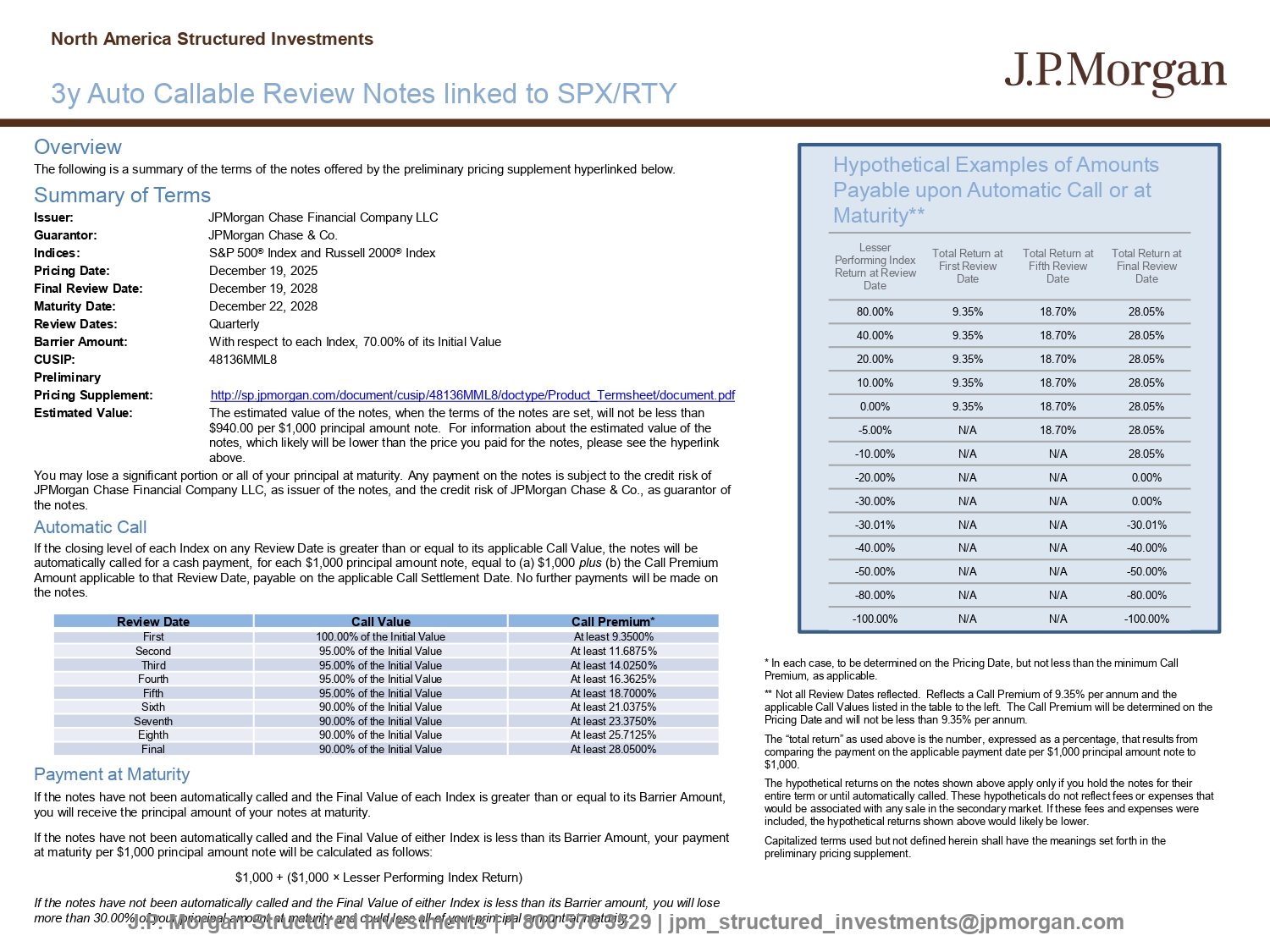 Overview The following is a summary of the terms of the notes offered by the preliminary pricing supplement hyperlinked below. Summary of Terms Issuer: JPMorgan Chase Financial Company LLC Guarantor: JPMorgan Chase & Co. Indices: S&P 500 ® Index and Russell 2000 ® Index Pricing Date: December 19, 2025 Final Review Date: December 19, 2028 Maturity Date: December 22, 2028 Review Dates: Quarterly Barrier Amount: With respect to each Index, 70.00% of its Initial Value CUSIP: 48136MML8 Preliminary Pricing Supplement: http://sp.jpmorgan.com/document/cusip/48136MML8/doctype/Product_Termsheet/document.pdf Estimated Value: The estimated value of the notes, when the terms of the notes are set, will not be less than $940.00 per $1,000 principal amount note. For information about the estimated value of the notes, which likely will be lower than the price you paid for the notes, please see the hyperlink above. You may lose a significant portion or all of your principal at maturity. Any payment on the notes is subject to the credit ri sk of JPMorgan Chase Financial Company LLC, as issuer of the notes, and the credit risk of JPMorgan Chase & Co., as guarantor of the notes. Automatic Call If the closing level of each Index on any Review Date is greater than or equal to its applicable Call Value, the notes will b e automatically called for a cash payment, for each $1,000 principal amount note, equal to (a) $1,000 plus (b) the Call Premium Amount applicable to that Review Date, payable on the applicable Call Settlement Date. No further payments will be made on the notes. Payment at Maturity If the notes have not been automatically called and the Final Value of each Index is greater than or equal to its Barrier Amo unt , you will receive the principal amount of your notes at maturity. If the notes have not been automatically called and the Final Value of either Index is less than its Barrier Amount, your pay men t at maturity per $1,000 principal amount note will be calculated as follows: $1,000 + ($1,000 î Lesser Performing Index Return) If the notes have not been automatically called and the Final Value of either Index is less than its Barrier amount, you will lo se more than 30.00% of your principal amount at maturity and could lose all of your principal amount at maturity. Hypothetical Examples of Amounts Payable upon Automatic Call or at Maturity** J.P. Morgan Structured Investments | 1 800 576 3529 | jpm_structured_investments@jpmorgan.com 3y Auto Callable Review Notes linked to SPX/RTY North America Structured Investments Total Return at Final Review Date Total Return at Fifth Review Date Total Return at First Review Date Lesser Performing Index Return at Review Date 28.05% 18.70% 9.35% 80.00% 28.05% 18.70% 9.35% 40.00% 28.05% 18.70% 9.35% 20.00% 28.05% 18.70% 9.35% 10.00% 28.05% 18.70% 9.35% 0.00% 28.05% 18.70% N/A - 5.00% 28.05% N/A N/A - 10.00% 0.00% N/A N/A - 20.00% 0.00% N/A N/A - 30.00% - 30.01% N/A N/A - 30.01% - 40.00% N/A N/A - 40.00% - 50.00% N/A N/A - 50.00% - 80.00% N/A N/A - 80.00% - 100.00% N/A N/A - 100.00% * In each case, to be determined on the Pricing Date, but not less than the minimum Call Premium, as applicable. ** Not all Review Dates reflected. Reflects a Call Premium of 9.35% per annum and the applicable Call Values listed in the table to the left. The Call Premium will be determined on the Pricing Date and will not be less than 9.35% per annum. The “total return” as used above is the number, expressed as a percentage, that results from comparing the payment on the applicable payment date per $1,000 principal amount note to $1,000. The hypothetical returns on the notes shown above apply only if you hold the notes for their entire term or until automatically called. These hypotheticals do not reflect fees or expenses that would be associated with any sale in the secondary market. If these fees and expenses were included, the hypothetical returns shown above would likely be lower. Capitalized terms used but not defined herein shall have the meanings set forth in the preliminary pricing supplement. Call Premium* Call Value Review Date At least 9.3500 % 100.00% of the Initial Value First At least 11.6875 % 95.00% of the Initial Value Second At least 14.0250 % 95.00% of the Initial Value Third At least 16.3625% 95.00% of the Initial Value Fourth At least 18.7000% 95.00% of the Initial Value Fifth At least 21.0375% 90.00% of the Initial Value Sixth At least 23.3750% 90.00% of the Initial Value Seventh At least 25.7125% 90.00% of the Initial Value Eighth At least 28.0500% 90.00% of the Initial Value Final