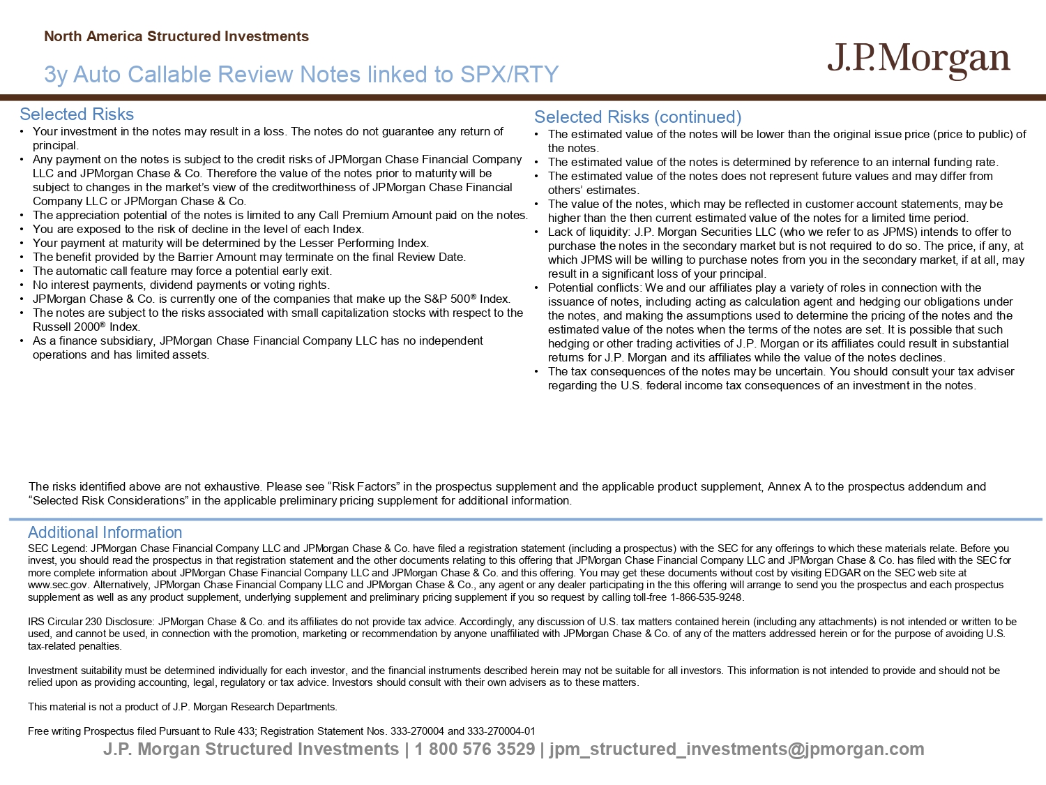 J.P. Morgan Structured Investments | 1 800 576 3529 | jpm_structured_investments@jpmorgan.com Selected Risks • Your investment in the notes may result in a loss. The notes do not guarantee any return of principal. • Any payment on the notes is subject to the credit risks of JPMorgan Chase Financial Company LLC and JPMorgan Chase & Co. Therefore the value of the notes prior to maturity will be subject to changes in the market’s view of the creditworthiness of JPMorgan Chase Financial Company LLC or JPMorgan Chase & Co. • The appreciation potential of the notes is limited to any Call Premium Amount paid on the notes. • You are exposed to the risk of decline in the level of each Index. • Your payment at maturity will be determined by the Lesser Performing Index. • The benefit provided by the Barrier Amount may terminate on the final Review Date. • The automatic call feature may force a potential early exit. • No interest payments, dividend payments or voting rights. • JPMorgan Chase & Co. is currently one of the companies that make up the S&P 500 ® Index. • The notes are subject to the risks associated with small capitalization stocks with respect to the Russell 200 0 ® Index . • As a finance subsidiary, JPMorgan Chase Financial Company LLC has no independent operations and has limited assets. Selected Risks (continued) • The estimated value of the notes will be lower than the original issue price (price to public) of the notes. • The estimated value of the notes is determined by reference to an internal funding rate. • The estimated value of the notes does not represent future values and may differ from others’ estimates. • The value of the notes, which may be reflected in customer account statements, may be higher than the then current estimated value of the notes for a limited time period. • Lack of liquidity: J.P. Morgan Securities LLC (who we refer to as JPMS ) intends to offer to purchase the notes in the secondary market but is not required to do so. The price, if any, at which JPMS will be willing to purchase notes from you in the secondary market, if at all, may result in a significant loss of your principal. • Potential conflicts: We and our affiliates play a variety of roles in connection with the issuance of notes, including acting as calculation agent and hedging our obligations under the notes, and making the assumptions used to determine the pricing of the notes and the estimated value of the notes when the terms of the notes are set. It is possible that such hedging or other trading activities of J.P. Morgan or its affiliates could result in substantial returns for J.P. Morgan and its affiliates while the value of the notes declines. • The tax consequences of the notes may be uncertain. You should consult your tax adviser regarding the U.S. federal income tax consequences of an investment in the notes. Additional Information SEC Legend: JPMorgan Chase Financial Company LLC and JPMorgan Chase & Co. have filed a registration statement (including a pr osp ectus) with the SEC for any offerings to which these materials relate. Before you invest, you should read the prospectus in that registration statement and the other documents relating to this offering that JPM organ Chase Financial Company LLC and JPMorgan Chase & Co. has filed with the SEC for more complete information about JPMorgan Chase Financial Company LLC and JPMorgan Chase & Co. and this offering. You may get the se documents without cost by visiting EDGAR on the SEC web site at www.sec.gov. Alternatively, JPMorgan Chase Financial Company LLC and JPMorgan Chase & Co., any agent or any dealer participat ing in the this offering will arrange to send you the prospectus and each prospectus supplement as well as any product supplement, underlying supplement and preliminary pricing supplement if you so request by c all ing toll - free 1 - 866 - 535 - 9248. IRS Circular 230 Disclosure: JPMorgan Chase & Co. and its affiliates do not provide tax advice. Accordingly, any discussion o f U .S. tax matters contained herein (including any attachments) is not intended or written to be used, and cannot be used, in connection with the promotion, marketing or recommendation by anyone unaffiliated with JPMorgan Cha se & Co. of any of the matters addressed herein or for the purpose of avoiding U.S. tax - related penalties. Investment suitability must be determined individually for each investor, and the financial instruments described herein may not be suitable for all investors. This information is not intended to provide and should not be relied upon as providing accounting, legal, regulatory or tax advice. Investors should consult with their own advisers as to the se matters. This material is not a product of J.P. Morgan Research Departments. Free writing Prospectus filed Pursuant to Rule 433; Registration Statement Nos. 333 - 270004 and 333 - 270004 - 01 North America Structured Investments 3y Auto Callable Review Notes linked to SPX/RTY The risks identified above are not exhaustive. Please see “Risk Factors” in the prospectus supplement and the applicable prod uct supplement, Annex A to the prospectus addendum and “Selected Risk Considerations” in the applicable preliminary pricing supplement for additional information.