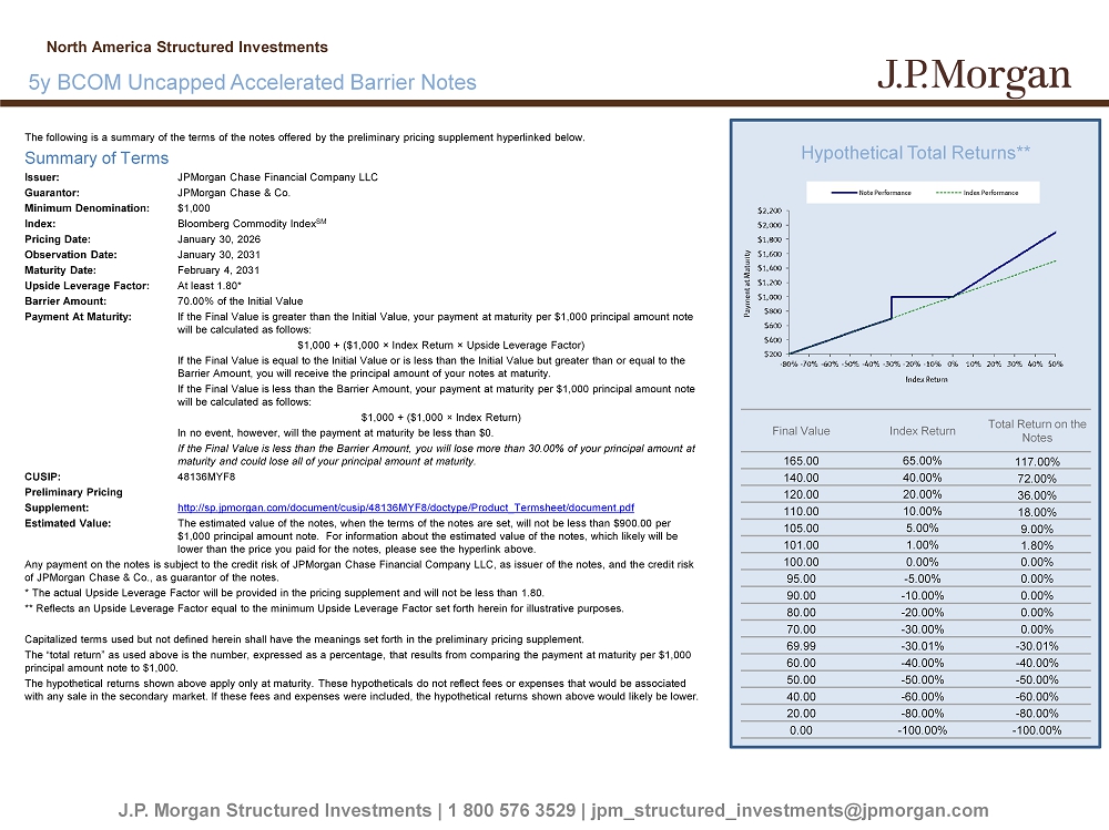 The following is a summary of the terms of the notes offered by the preliminary pricing supplement hyperlinked below. Summary of Terms Issuer: JPMorgan Chase Financial Company LLC Guarantor: JPMorgan Chase & Co. Minimum Denomination: $1,000 Index: Bloomberg Commodity Index SM Pricing Date: January 30, 2026 Observation Date: January 30, 2031 Maturity Date: February 4, 2031 Upside Leverage Factor: At least 1.80* Barrier Amount: 70.00% of the Initial Value Payment At Maturity: If the Final Value is greater than the Initial Value, your payment at maturity per $1,000 principal amount note will be calculated as follows: $1,000 + ($1,000 î Index Return î Upside Leverage Factor) If the Final Value is equal to the Initial Value or is less than the Initial Value but greater than or equal to the Barrier Amount, you will receive the principal amount of your notes at maturity. If the Final Value is less than the Barrier Amount, your payment at maturity per $1,000 principal amount note will be calculated as follows: $1,000 + ($1,000 î Index Return) In no event, however, will the payment at maturity be less than $0. If the Final Value is less than the Barrier Amount, you will lose more than 30.00% of your principal amount at maturity and could lose all of your principal amount at maturity. CUSIP: 48136MYF8 Preliminary Pricing Supplement: http://sp.jpmorgan.com/document/cusip /48136MYF8/ doctype/Product_Termsheet/document .pdf Estimated Value: The estimated value of the notes, when the terms of the notes are set, will not be less than $900.00 per $1,000 principal amount note. For information about the estimated value of the notes, which likely will be lower than the price you paid for the notes, please see the hyperlink above. Any payment on the notes is subject to the credit risk of JPMorgan Chase Financial Company LLC, as issuer of the notes, and t he credit risk of JPMorgan Chase & Co., as guarantor of the notes. * The actual Upside Leverage Factor will be provided in the pricing supplement and will not be less than 1.80. ** Reflects an Upside Leverage Factor equal to the minimum Upside Leverage Factor set forth herein for illustrative purposes. Capitalized terms used but not defined herein shall have the meanings set forth in the preliminary pricing supplement. The “total return” as used above is the number, expressed as a percentage, that results from comparing the payment at maturit y p er $1,000 principal amount note to $1,000. The hypothetical returns shown above apply only at maturity. These hypotheticals do not reflect fees or expenses that would b e a ssociated with any sale in the secondary market. If these fees and expenses were included, the hypothetical returns shown above would l ike ly be lower. J.P. Morgan Structured Investments | 1 800 576 3529 | jpm_structured_investments@jpmorgan.com 5y BCOM Uncapped Accelerated Barrier Notes H North America Structured Investments Hypothetical Total Returns** Total Return on the Notes Index Return Final Value 117.00% 65.00% 165.00 72.00% 40.00% 140.00 36.00% 20.00% 120.00 18.00% 10.00% 110.00 9.00% 5.00% 105.00 1.80% 1.00% 101.00 0.00% 0.00% 100.00 0.00% - 5.00% 95.00 0.00% - 10.00% 90.00 0.00% - 20.00% 80.00 0.00% - 30.00% 70.00 - 30.01% - 30.01% 69.99 - 40.00% - 40.00% 60.00 - 50.00% - 50.00% 50.00 - 60.00% - 60.00% 40.00 - 80.00% - 80.00% 20.00 - 100.00% - 100.00% 0.00