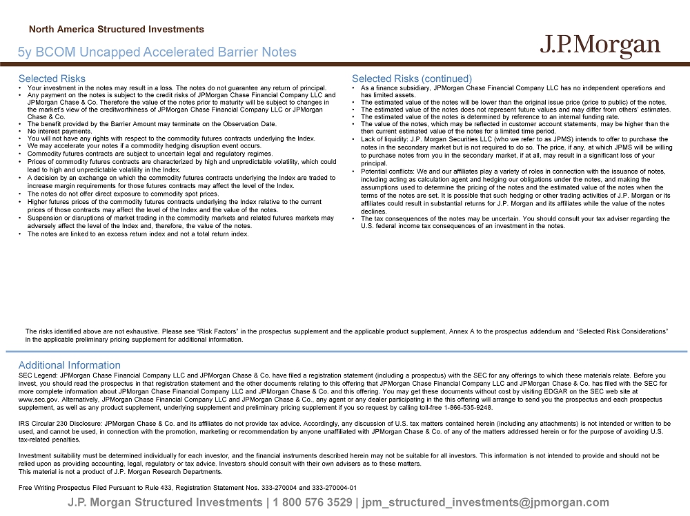 J.P. Morgan Structured Investments | 1 800 576 3529 | jpm_structured_investments@jpmorgan.com Selected Risks • Your investment in the notes may result in a loss. The notes do not guarantee any return of principal. • Any payment on the notes is subject to the credit risks of JPMorgan Chase Financial Company LLC and JPMorgan Chase & Co. Therefore the value of the notes prior to maturity will be subject to changes in the market’s view of the creditworthiness of JPMorgan Chase Financial Company LLC or JPMorgan Chase & Co. • The benefit provided by the Barrier Amount may terminate on the Observation Date. • No interest payments. • You will not have any rights with respect to the commodity futures contracts underlying the Index. • We may accelerate your notes if a commodity hedging disruption event occurs. • Commodity futures contracts are subject to uncertain legal and regulatory regimes. • Prices of commodity futures contracts are characterized by high and unpredictable volatility, which could lead to high and unpredictable volatility in the Index. • A decision by an exchange on which the commodity futures contracts underlying the Index are traded to increase margin requirements for those futures contracts may affect the level of the Index. • The notes do not offer direct exposure to commodity spot prices. • Higher futures prices of the commodity futures contracts underlying the Index relative to the current prices of those contracts may affect the level of the Index and the value of the notes. • Suspension or disruptions of market trading in the commodity markets and related futures markets may adversely affect the level of the Index and, therefore, the value of the notes. • The notes are linked to an excess return index and not a total return index. Selected Risks (continued) • As a finance subsidiary, JPMorgan Chase Financial Company LLC has no independent operations and has limited assets. • The estimated value of the notes will be lower than the original issue price (price to public) of the notes. • The estimated value of the notes does not represent future values and may differ from others’ estimates. • The estimated value of the notes is determined by reference to an internal funding rate. • The value of the notes, which may be reflected in customer account statements, may be higher than the then current estimated value of the notes for a limited time period. • Lack of liquidity: J.P. Morgan Securities LLC (who we refer to as JPMS ) intends to offer to purchase the notes in the secondary market but is not required to do so. The price, if any, at which JPMS will be willing to purchase notes from you in the secondary market, if at all, may result in a significant loss of your principal. • Potential conflicts: We and our affiliates play a variety of roles in connection with the issuance of notes, including acting as calculation agent and hedging our obligations under the notes, and making the assumptions used to determine the pricing of the notes and the estimated value of the notes when the terms of the notes are set. It is possible that such hedging or other trading activities of J.P. Morgan or its affiliates could result in substantial returns for J.P. Morgan and its affiliates while the value of the notes declines. • The tax consequences of the notes may be uncertain. You should consult your tax adviser regarding the U.S. federal income tax consequences of an investment in the notes. Additional Information SEC Legend: JPMorgan Chase Financial Company LLC and JPMorgan Chase & Co. have filed a registration statement (including a pr osp ectus) with the SEC for any offerings to which these materials relate. Before you invest, you should read the prospectus in that registration statement and the other documents relating to this offering that JPM organ Chase Financial Company LLC and JPMorgan Chase & Co. has filed with the SEC for more complete information about JPMorgan Chase Financial Company LLC and JPMorgan Chase & Co. and this offering. You may get the se documents without cost by visiting EDGAR on the SEC web site at www.sec.gov. Alternatively, JPMorgan Chase Financial Company LLC and JPMorgan Chase & Co., any agent or any dealer participat ing in the this offering will arrange to send you the prospectus and each prospectus supplement, as well as any product supplement, underlying supplement and preliminary pricing supplement if you so request by cal ling toll - free 1 - 866 - 535 - 9248. IRS Circular 230 Disclosure: JPMorgan Chase & Co. and its affiliates do not provide tax advice. Accordingly, any discussion o f U .S. tax matters contained herein (including any attachments) is not intended or written to be used, and cannot be used, in connection with the promotion, marketing or recommendation by anyone unaffiliated with JPMorgan Cha se & Co. of any of the matters addressed herein or for the purpose of avoiding U.S. tax - related penalties. Investment suitability must be determined individually for each investor, and the financial instruments described herein may not be suitable for all investors. This information is not intended to provide and should not be relied upon as providing accounting, legal, regulatory or tax advice. Investors should consult with their own advisers as to the se matters. This material is not a product of J.P. Morgan Research Departments. Free Writing Prospectus Filed Pursuant to Rule 433, Registration Statement Nos. 333 - 270004 and 333 - 270004 - 01 North America Structured Investments The risks identified above are not exhaustive. Please see “Risk Factors” in the prospectus supplement and the applicable prod uct supplement, Annex A to the prospectus addendum and “Selected Risk Considerations” in the applicable preliminary pricing supplement for additional information. 5y BCOM Uncapped Accelerated Barrier Notes