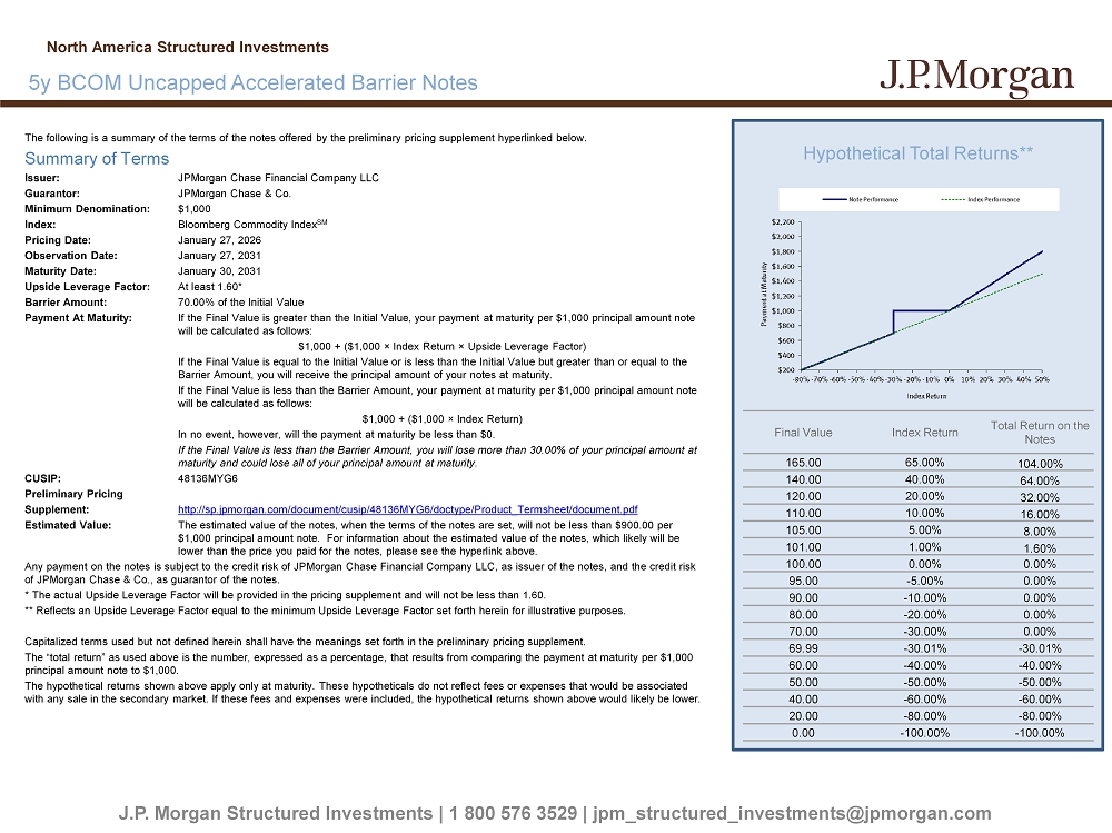 The following is a summary of the terms of the notes offered by the preliminary pricing supplement hyperlinked below. Summary of Terms Issuer: JPMorgan Chase Financial Company LLC Guarantor: JPMorgan Chase & Co. Minimum Denomination: $1,000 Index: Bloomberg Commodity Index SM Pricing Date: January 27, 2026 Observation Date: January 27, 2031 Maturity Date: January 30, 2031 Upside Leverage Factor: At least 1.60* Barrier Amount: 70.00% of the Initial Value Payment At Maturity: If the Final Value is greater than the Initial Value, your payment at maturity per $1,000 principal amount note will be calculated as follows: $1,000 + ($1,000 î Index Return î Upside Leverage Factor) If the Final Value is equal to the Initial Value or is less than the Initial Value but greater than or equal to the Barrier Amount, you will receive the principal amount of your notes at maturity. If the Final Value is less than the Barrier Amount, your payment at maturity per $1,000 principal amount note will be calculated as follows: $1,000 + ($1,000 î Index Return) In no event, however, will the payment at maturity be less than $0. If the Final Value is less than the Barrier Amount, you will lose more than 30.00% of your principal amount at maturity and could lose all of your principal amount at maturity. CUSIP: 48136MYG6 Preliminary Pricing Supplement: http://sp.jpmorgan.com/document/ cusip/48136MYG6/ doctype/Product_Termsheet/document.pdf Estimated Value: The estimated value of the notes, when the terms of the notes are set, will not be less than $900.00 per $1,000 principal amount note. For information about the estimated value of the notes, which likely will be lower than the price you paid for the notes, please see the hyperlink above. Any payment on the notes is subject to the credit risk of JPMorgan Chase Financial Company LLC, as issuer of the notes, and t he credit risk of JPMorgan Chase & Co., as guarantor of the notes. * The actual Upside Leverage Factor will be provided in the pricing supplement and will not be less than 1.60. ** Reflects an Upside Leverage Factor equal to the minimum Upside Leverage Factor set forth herein for illustrative purposes. Capitalized terms used but not defined herein shall have the meanings set forth in the preliminary pricing supplement. The “total return” as used above is the number, expressed as a percentage, that results from comparing the payment at maturit y p er $1,000 principal amount note to $1,000. The hypothetical returns shown above apply only at maturity. These hypotheticals do not reflect fees or expenses that would b e a ssociated with any sale in the secondary market. If these fees and expenses were included, the hypothetical returns shown above would l ike ly be lower. J.P. Morgan Structured Investments | 1 800 576 3529 | jpm_structured_investments@jpmorgan.com 5y BCOM Uncapped Accelerated Barrier Notes H North America Structured Investments Hypothetical Total Returns** Total Return on the Notes Index Return Final Value 104.00% 65.00% 165.00 64.00% 40.00% 140.00 32.00% 20.00% 120.00 16.00% 10.00% 110.00 8.00% 5.00% 105.00 1.60% 1.00% 101.00 0.00% 0.00% 100.00 0.00% - 5.00% 95.00 0.00% - 10.00% 90.00 0.00% - 20.00% 80.00 0.00% - 30.00% 70.00 - 30.01% - 30.01% 69.99 - 40.00% - 40.00% 60.00 - 50.00% - 50.00% 50.00 - 60.00% - 60.00% 40.00 - 80.00% - 80.00% 20.00 - 100.00% - 100.00% 0.00