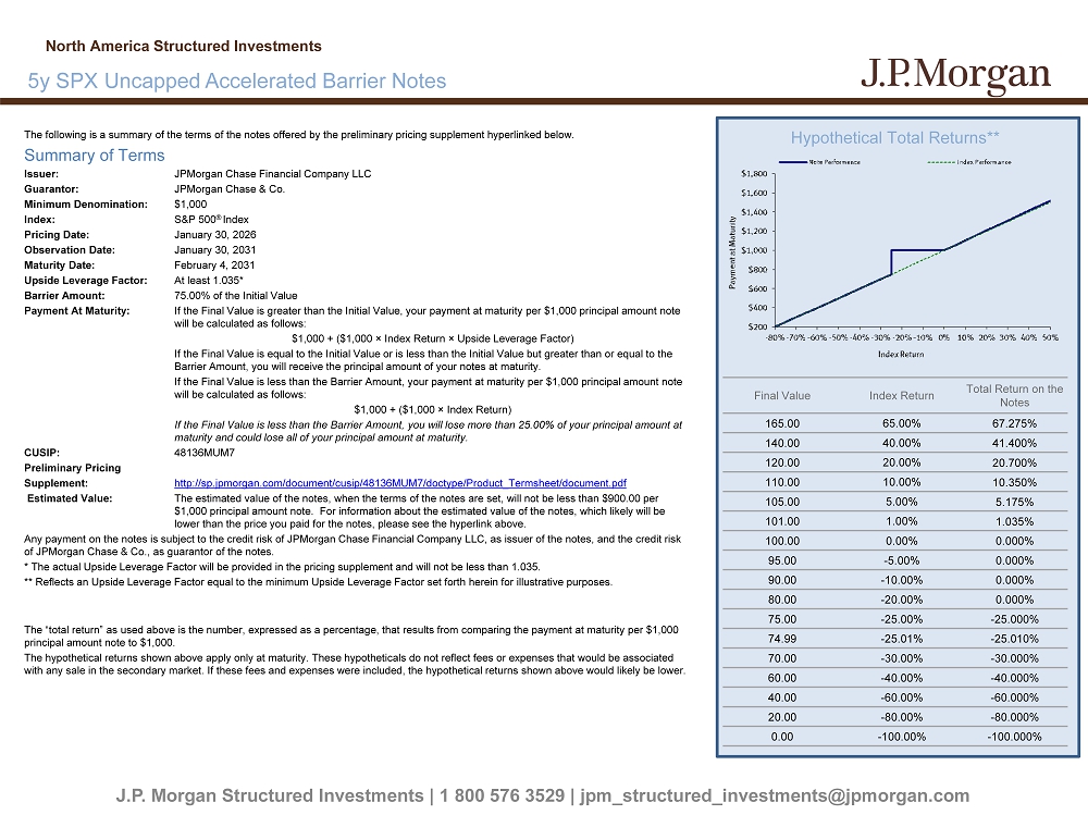 The following is a summary of the terms of the notes offered by the preliminary pricing supplement hyperlinked below. Summary of Terms Issuer: JPMorgan Chase Financial Company LLC Guarantor: JPMorgan Chase & Co. Minimum Denomination: $1,000 Index: S&P 500 ® Index Pricing Date: January 30, 2026 Observation Date: January 30, 2031 Maturity Date: February 4, 2031 Upside Leverage Factor: At least 1.035* Barrier Amount: 75.00% of the Initial Value Payment At Maturity: If the Final Value is greater than the Initial Value, your payment at maturity per $1,000 principal amount note will be calculated as follows: $1,000 + ($1,000 î Index Return î Upside Leverage Factor) If the Final Value is equal to the Initial Value or is less than the Initial Value but greater than or equal to the Barrier Amount, you will receive the principal amount of your notes at maturity. If the Final Value is less than the Barrier Amount, your payment at maturity per $1,000 principal amount note will be calculated as follows: $1,000 + ($1,000 î Index Return) If the Final Value is less than the Barrier Amount, you will lose more than 25.00% of your principal amount at maturity and could lose all of your principal amount at maturity. CUSIP: 48136MUM7 Preliminary Pricing Supplement: http://sp.jpmorgan.com/document/cusip/48136MUM7/doctype/Product_Termsheet/document.pdf Estimated Value: The estimated value of the notes, when the terms of the notes are set, will not be less than $900.00 per $1,000 principal amount note. For information about the estimated value of the notes, which likely will be lower than the price you paid for the notes, please see the hyperlink above. Any payment on the notes is subject to the credit risk of JPMorgan Chase Financial Company LLC, as issuer of the notes, and t he credit risk of JPMorgan Chase & Co., as guarantor of the notes. * The actual Upside Leverage Factor will be provided in the pricing supplement and will not be less than 1.035. ** Reflects an Upside Leverage Factor equal to the minimum Upside Leverage Factor set forth herein for illustrative purposes. The “total return” as used above is the number, expressed as a percentage, that results from comparing the payment at maturit y p er $1,000 principal amount note to $1,000. The hypothetical returns shown above apply only at maturity. These hypotheticals do not reflect fees or expenses that would b e a ssociated with any sale in the secondary market. If these fees and expenses were included, the hypothetical returns shown above would l ike ly be lower. J.P. Morgan Structured Investments | 1 800 576 3529 | jpm_structured_investments@jpmorgan.com 5y SPX Uncapped Accelerated Barrier Notes H North America Structured Investments Hypothetical Total Returns** Final Value Index Return Total Return on the Notes 165.00 65.00% 67.275% 140.00 40.00% 41.400% 120.00 20.00% 20.700% 110.00 10.00% 10.350% 105.00 5.00% 5.175% 101.00 1.00% 1.035% 100.00 0.00% 0.000% 95.00 - 5.00% 0.000% 90.00 - 10.00% 0.000% 80.00 - 20.00% 0.000% 75.00 - 25.00% - 25.000% 74.99 - 25.01% - 25.010% 70.00 - 30.00% - 30.000% 60.00 - 40.00% - 40.000% 40.00 - 60.00% - 60.000% 20.00 - 80.00% - 80.000% 0.00 - 100.00% - 100.000%