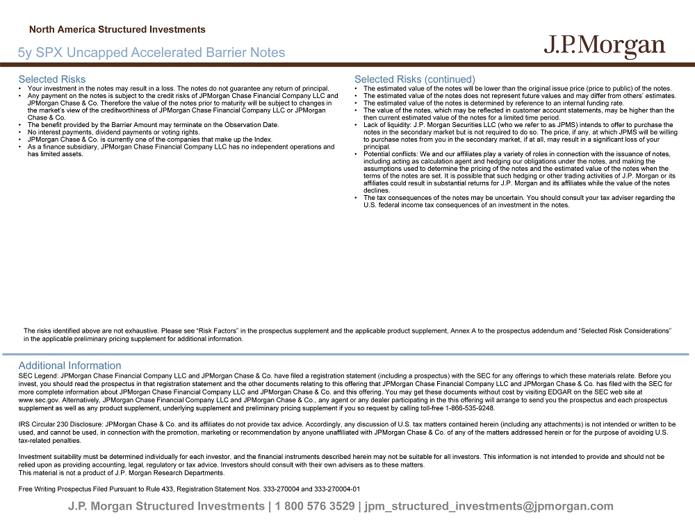 J.P. Morgan Structured Investments | 1 800 576 3529 | jpm_structured_investments@jpmorgan.com Selected Risks • Your investment in the notes may result in a loss. The notes do not guarantee any return of principal. • Any payment on the notes is subject to the credit risks of JPMorgan Chase Financial Company LLC and JPMorgan Chase & Co. Therefore the value of the notes prior to maturity will be subject to changes in the market’s view of the creditworthiness of JPMorgan Chase Financial Company LLC or JPMorgan Chase & Co. • The benefit provided by the Barrier Amount may terminate on the Observation Date. • No interest payments, dividend payments or voting rights. • JPMorgan Chase & Co. is currently one of the companies that make up the Index. • As a finance subsidiary, JPMorgan Chase Financial Company LLC has no independent operations and has limited assets. Selected Risks (continued) • The estimated value of the notes will be lower than the original issue price (price to public) of the notes. • The estimated value of the notes does not represent future values and may differ from others’ estimates. • The estimated value of the notes is determined by reference to an internal funding rate. • The value of the notes, which may be reflected in customer account statements, may be higher than the then current estimated value of the notes for a limited time period. • Lack of liquidity: J.P. Morgan Securities LLC (who we refer to as JPMS) intends to offer to purchase the notes in the secondary market but is not required to do so. The price, if any, at which JPMS will be willing to purchase notes from you in the secondary market, if at all, may result in a significant loss of your principal. • Potential conflicts: We and our affiliates play a variety of roles in connection with the issuance of notes, including acting as calculation agent and hedging our obligations under the notes, and making the assumptions used to determine the pricing of the notes and the estimated value of the notes when the terms of the notes are set. It is possible that such hedging or other trading activities of J.P. Morgan or its affiliates could result in substantial returns for J.P. Morgan and its affiliates while the value of the notes declines. • The tax consequences of the notes may be uncertain. You should consult your tax adviser regarding the U.S. federal income tax consequences of an investment in the notes. Additional Information SEC Legend: JPMorgan Chase Financial Company LLC and JPMorgan Chase & Co. have filed a registration statement (including a pr osp ectus) with the SEC for any offerings to which these materials relate. Before you invest, you should read the prospectus in that registration statement and the other documents relating to this offering that JPM organ Chase Financial Company LLC and JPMorgan Chase & Co. has filed with the SEC for more complete information about JPMorgan Chase Financial Company LLC and JPMorgan Chase & Co. and this offering. You may get the se documents without cost by visiting EDGAR on the SEC web site at www.sec.gov. Alternatively, JPMorgan Chase Financial Company LLC and JPMorgan Chase & Co., any agent or any dealer participat ing in the this offering will arrange to send you the prospectus and each prospectus supplement as well as any product supplement, underlying supplement and preliminary pricing supplement if you so request by c all ing toll - free 1 - 866 - 535 - 9248. IRS Circular 230 Disclosure: JPMorgan Chase & Co. and its affiliates do not provide tax advice. Accordingly, any discussion o f U .S. tax matters contained herein (including any attachments) is not intended or written to be used, and cannot be used, in connection with the promotion, marketing or recommendation by anyone unaffiliated with JPMorgan Cha se & Co. of any of the matters addressed herein or for the purpose of avoiding U.S. tax - related penalties. Investment suitability must be determined individually for each investor, and the financial instruments described herein may not be suitable for all investors. This information is not intended to provide and should not be relied upon as providing accounting, legal, regulatory or tax advice. Investors should consult with their own advisers as to the se matters. This material is not a product of J.P. Morgan Research Departments. Free Writing Prospectus Filed Pursuant to Rule 433, Registration Statement Nos. 333 - 270004 and 333 - 270004 - 01 North America Structured Investments The risks identified above are not exhaustive. Please see “Risk Factors” in the prospectus supplement and the applicable prod uct supplement, Annex A to the prospectus addendum and “Selected Risk Considerations” in the applicable preliminary pricing supplement for additional information. 5y SPX Uncapped Accelerated Barrier Notes