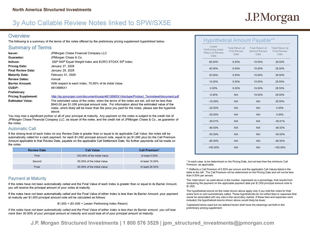 Overview The following is a summary of the terms of the notes offered by the preliminary pricing supplement hyperlinked below. Summary of Terms Issuer: JPMorgan Chase Financial Company LLC Guarantor: JPMorgan Chase & Co. Indices: S&P 500 ® Equal Weight Index and EURO STOXX 50 ® Index Pricing Date: January 27, 2026 Final Review Date: January 29, 2029 Maturity Date: February 01, 2029 Review Dates: Annual Barrier Amount: With respect to each Index, 70.00% of its Initial Value CUSIP: 48136M5X1 Preliminary Pricing Supplement: http://sp.jpmorgan.com/document/cusip/48136M5X1/doctype/Product_Termsheet/document.pdf Estimated Value: The estimated value of the notes, when the terms of the notes are set, will not be less than $940.00 per $1,000 principal amount note. For information about the estimated value of the notes, which likely will be lower than the price you paid for the notes, please see the hyperlink above. You may lose a significant portion or all of your principal at maturity. Any payment on the notes is subject to the credit ri sk of JPMorgan Chase Financial Company LLC, as issuer of the notes, and the credit risk of JPMorgan Chase & Co., as guarantor of the notes. Automatic Call If the closing level of each Index on any Review Date is greater than or equal to its applicable Call Value, the notes will b e automatically called for a cash payment, for each $1,000 principal amount note, equal to (a) $1,000 plus (b) the Call Premium Amount applicable to that Review Date, payable on the applicable Call Settlement Date. No further payments will be made on the notes. Payment at Maturity If the notes have not been automatically called and the Final Value of each Index is greater than or equal to its Barrier Amo unt , you will receive the principal amount of your notes at maturity. If the notes have not been automatically called and the Final Value of either Index is less than its Barrier Amount, your pay men t at maturity per $1,000 principal amount note will be calculated as follows: $1,000 + ($1,000 î Lesser Performing Index Return) If the notes have not been automatically called and the Final Value of either Index is less than its Barrier amount, you will lo se more than 30.00% of your principal amount at maturity and could lose all of your principal amount at maturity. Hypothetical Amount Payable** J.P. Morgan Structured Investments | 1 800 576 3529 | jpm_structured_investments@jpmorgan.com 3y Auto Callable Review Notes linked to SPW/SX5E North America Structured Investments Total Return at Final Review Date Total Return at Second Review Date Total Return at First Review Date Lesser Performing Index Return at Review Date 28.50% 19.00% 9.50% 80.00% 28.50% 19.00% 9.50% 40.00% 28.50% 19.00% 9.50% 20.00% 28.50% 19.00% 9.50% 10.00% 28.50% 19.00% 9.50% 0.00% 28.50% 19.00% N/A - 5.00% 28.50% N/A N/A - 10.00% 0.00% N/A N/A - 20.00% 0.00% N/A N/A - 30.00% - 30.01% N/A N/A - 30.01% - 40.00% N/A N/A - 40.00% - 50.00% N/A N/A - 50.00% - 80.00% N/A N/A - 80.00% - 100.00% N/A N/A - 100.00% * In each case, to be determined on the Pricing Date, but not less than the minimum Call Premium, as applicable. ** Reflects a Call Premium of 9.50% per annum and the applicable Call Values listed in the table to the left. The Call Premium will be determined on the Pricing Date and will not be less than 9.50% per annum. The “total return” as used above is the number, expressed as a percentage, that results from comparing the payment on the applicable payment date per $1,000 principal amount note to $1,000. The hypothetical returns on the notes shown above apply only if you hold the notes for their entire term or until automatically called. These hypotheticals do not reflect fees or expenses that would be associated with any sale in the secondary market. If these fees and expenses were included, the hypothetical returns shown above would likely be lower. Capitalized terms used but not defined herein shall have the meanings set forth in the preliminary pricing supplement. Call Premium* Call Value Review Date At least 9.50 % 100.00% of the Initial Value First At least 19.00 % 95.00% of the Initial Value Second At least 28.50 % 90.00% of the Initial Value Final