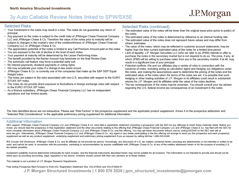 J.P. Morgan Structured Investments | 1 800 576 3529 | jpm_structured_investments@jpmorgan.com Selected Risks • Your investment in the notes may result in a loss. The notes do not guarantee any return of principal. • Any payment on the notes is subject to the credit risks of JPMorgan Chase Financial Company LLC and JPMorgan Chase & Co. Therefore the value of the notes prior to maturity will be subject to changes in the market’s view of the creditworthiness of JPMorgan Chase Financial Company LLC or JPMorgan Chase & Co. • The appreciation potential of the notes is limited to any Call Premium Amount paid on the notes. • You are exposed to the risk of decline in the level of each Index. • Your payment at maturity will be determined by the Lesser Performing Index. • The benefit provided by the Barrier Amount may terminate on the final Review Date. • The automatic call feature may force a potential early exit. • No interest payments, dividend payments or voting rights. • We may accelerate your notes if a change - in - law event occurs. • JPMorgan Chase & Co. is currently one of the companies that make up the S&P 500 ® Equal Weight Index. • The notes are subject to the risks associated with non - U.S. securities with respect to the EURO STOXX 50 ® Index . • The notes do not provide direct exposure to fluctuations in foreign exchange rates with respect to the EURO STOXX 50 ® Index. • As a finance subsidiary, JPMorgan Chase Financial Company LLC has no independent operations and has limited assets. Selected Risks (continued) • The estimated value of the notes will be lower than the original issue price (price to public) of the notes. • The estimated value of the notes is determined by reference to an internal funding rate. • The estimated value of the notes does not represent future values and may differ from others’ estimates. • The value of the notes, which may be reflected in customer account statements, may be higher than the then current estimated value of the notes for a limited time period. • Lack of liquidity: J.P. Morgan Securities LLC (who we refer to as JPMS ) intends to offer to purchase the notes in the secondary market but is not required to do so. The price, if any, at which JPMS will be willing to purchase notes from you in the secondary market, if at all, may result in a significant loss of your principal. • Potential conflicts: We and our affiliates play a variety of roles in connection with the issuance of notes, including acting as calculation agent and hedging our obligations under the notes, and making the assumptions used to determine the pricing of the notes and the estimated value of the notes when the terms of the notes are set. It is possible that such hedging or other trading activities of J.P. Morgan or its affiliates could result in substantial returns for J.P. Morgan and its affiliates while the value of the notes declines. • The tax consequences of the notes may be uncertain. You should consult your tax adviser regarding the U.S. federal income tax consequences of an investment in the notes. Additional Information SEC Legend: JPMorgan Chase Financial Company LLC and JPMorgan Chase & Co. have filed a registration statement (including a pr osp ectus) with the SEC for any offerings to which these materials relate. Before you invest, you should read the prospectus in that registration statement and the other documents relating to this offering that JPM organ Chase Financial Company LLC and JPMorgan Chase & Co. has filed with the SEC for more complete information about JPMorgan Chase Financial Company LLC and JPMorgan Chase & Co. and this offering. You may get the se documents without cost by visiting EDGAR on the SEC web site at www.sec.gov. Alternatively, JPMorgan Chase Financial Company LLC and JPMorgan Chase & Co., any agent or any dealer participat ing in the this offering will arrange to send you the prospectus and each prospectus supplement as well as any product supplement, underlying supplement and preliminary pricing supplement if you so request by c all ing toll - free 1 - 866 - 535 - 9248. IRS Circular 230 Disclosure: JPMorgan Chase & Co. and its affiliates do not provide tax advice. Accordingly, any discussion o f U .S. tax matters contained herein (including any attachments) is not intended or written to be used, and cannot be used, in connection with the promotion, marketing or recommendation by anyone unaffiliated with JPMorgan Cha se & Co. of any of the matters addressed herein or for the purpose of avoiding U.S. tax - related penalties. Investment suitability must be determined individually for each investor, and the financial instruments described herein may not be suitable for all investors. This information is not intended to provide and should not be relied upon as providing accounting, legal, regulatory or tax advice. Investors should consult with their own advisers as to the se matters. This material is not a product of J.P. Morgan Research Departments. Free writing Prospectus filed Pursuant to Rule 433; Registration Statement Nos. 333 - 270004 and 333 - 270004 - 01 North America Structured Investments 3y Auto Callable Review Notes linked to SPW/SX5E The risks identified above are not exhaustive. Please see “Risk Factors” in the prospectus supplement and the applicable prod uct supplement, Annex A to the prospectus addendum and “Selected Risk Considerations” in the applicable preliminary pricing supplement for additional information.