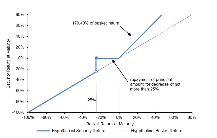 If the ending level of the basket is less than the threshold level, you will have full downside exposure to the decrease in the level of the basket from the starting level and will lose more than 25%, and possibly all, of the principal amount of your securities at maturity.