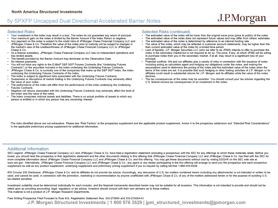 J.P. Morgan Structured Investments | 1 800 576 3529 | jpm_structured_investments@jpmorgan.com Selected Risks • Your investment in the notes may result in a loss. The notes do not guarantee any return of principal. • Your maximum gain on the notes is limited by the Barrier Amount if the Index Return is negative. • Any payment on the notes is subject to the credit risks of JPMorgan Chase Financial Company LLC and JPMorgan Chase & Co. Therefore the value of the notes prior to maturity will be subject to changes in the market’s view of the creditworthiness of JPMorgan Chase Financial Company LLC or JPMorgan Chase & Co. • As a finance subsidiary, JPMorgan Chase Financial Company LLC has no independent operations and has limited assets. • The benefit provided by the Barrier Amount may terminate on the Observation Date. • No interest payments. • You will not have any rights to the E - Mini ® S&P 500 ® Futures Contracts (the “Underlying Futures Contracts”) or the securities included in the index underlying the Underlying Futures Contracts. • JPMorgan Chase & Co. is currently one of the companies that make up the S&P 500 ® Index, the index underlying the Underlying Futures Contracts of the Index. • The Index is subject to significant risks associated with the Underlying Futures Contracts. • Suspension or disruptions of market trading in the Underlying Futures Contracts may adversely affect the value of your notes. • The performance of the Index will differ from the performance of the index underlying the Underlying Futures Contracts. • Negative roll returns associated with the Underlying Futures Contracts may adversely affect the level of the Index and the value of the notes. • The Index comprises notional assets and liabilities. There is no actual portfolio of assets to which any person is entitled or in which any person has any ownership interest. Selected Risks (continued) • The estimated value of the notes will be lower than the original issue price (price to public) of the notes. • The estimated value of the notes does not represent future values and may differ from others’ estimates. • The estimated value of the notes is determined by reference to an internal funding rate. • The value of the notes, which may be reflected in customer account statements, may be higher than the then current estimated value of the notes for a limited time period. • Lack of liquidity: J.P. Morgan Securities LLC (who we refer to as JPMS) intends to offer to purchase the notes in the secondary market but is not required to do so. The price, if any, at which JPMS will be willing to purchase notes from you in the secondary market, if at all, may result in a significant loss of your principal. • Potential conflicts: We and our affiliates play a variety of roles in connection with the issuance of notes, including acting as calculation agent and hedging our obligations under the notes, and making the assumptions used to determine the pricing of the notes and the estimated value of the notes when the terms of the notes are set. It is possible that such hedging or other trading activities of J.P. Morgan or its affiliates could result in substantial returns for J.P. Morgan and its affiliates while the value of the notes declines. • The tax consequences of the notes may be uncertain. You should consult your tax adviser regarding the U.S. federal income tax consequences of an investment in the notes. Additional Information SEC Legend: JPMorgan Chase Financial Company LLC and JPMorgan Chase & Co. have filed a registration statement (including a pr osp ectus) with the SEC for any offerings to which these materials relate. Before you invest, you should read the prospectus in that registration statement and the other documents relating to this offering that JPM organ Chase Financial Company LLC and JPMorgan Chase & Co. has filed with the SEC for more complete information about JPMorgan Chase Financial Company LLC and JPMorgan Chase & Co. and this offering. You may get the se documents without cost by visiting EDGAR on the SEC web site at www.sec.gov. Alternatively, JPMorgan Chase Financial Company LLC and JPMorgan Chase & Co., any agent or any dealer participat ing in the this offering will arrange to send you the prospectus and each prospectus supplement as well as any product supplement, underlying supplement and preliminary pricing supplement if you so request by c all ing toll - free 1 - 866 - 535 - 9248. IRS Circular 230 Disclosure: JPMorgan Chase & Co. and its affiliates do not provide tax advice. Accordingly, any discussion o f U .S. tax matters contained herein (including any attachments) is not intended or written to be used, and cannot be used, in connection with the promotion, marketing or recommendation by anyone unaffiliated with JPMorgan Cha se & Co. of any of the matters addressed herein or for the purpose of avoiding U.S. tax - related penalties. Investment suitability must be determined individually for each investor, and the financial instruments described herein may not be suitable for all investors. This information is not intended to provide and should not be relied upon as providing accounting, legal, regulatory or tax advice. Investors should consult with their own advisers as to the se matters. This material is not a product of J.P. Morgan Research Departments. Free Writing Prospectus Filed Pursuant to Rule 433, Registration Statement Nos. 333 - 270004 and 333 - 270004 - 01 North America Structured Investments The risks identified above are not exhaustive. Please see “Risk Factors” in the prospectus supplement and the applicable prod uct supplement, Annex A to the prospectus addendum and “Selected Risk Considerations” in the applicable preliminary pricing supplement for additional information. 5y SPXFP Uncapped Dual Directional Accelerated Barrier Notes