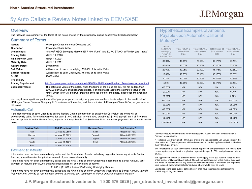 Overview The following is a summary of the terms of the notes offered by the preliminary pricing supplement hyperlinked below. Summary of Terms Issuer: JPMorgan Chase Financial Company LLC Guarantor: JPMorgan Chase & Co. Underlyings: iShares ® MSCI Emerging Markets ETF (the “Fund”) and EURO STOXX 50 ® Index (the “Index”) Pricing Date: March 13, 2026 Final Review Date: March 13, 2031 Maturity Date: March 18, 2031 Review Dates: Semiannual Call Value: With respect to each Underlying, 95.00% of its Initial Value Barrier Amount: With respect to each Underlying, 75.00% of its Initial Value CUSIP: 46660M5P6 Preliminary Pricing Supplement: http://sp.jpmorgan.com/document/cusip/46660M5P6/doctype/Product_Termsheet/document.pdf Estimated Value: The estimated value of the notes, when the terms of the notes are set, will not be less than $900.00 per $1,000 principal amount note. For information about the estimated value of the notes, which likely will be lower than the price you paid for the notes, please see the hyperlink above. You may lose a significant portion or all of your principal at maturity. Any payment on the notes is subject to the credit ri sk of JPMorgan Chase Financial Company LLC, as issuer of the notes, and the credit risk of JPMorgan Chase & Co., as guarantor of the notes. Automatic Call If the closing value of each Underlying on any Review Date is greater than or equal to its Call Value, the notes will be automatically called for a cash payment, for each $1,000 principal amount note, equal to (a) $1,000 plus (b) the Call Premium Amount applicable to that Review Date, payable on the applicable Call Settlement Date. No further payments will be made on th e notes. Payment at Maturity If the notes have not been automatically called and the Final Value of each Underlying is greater than or equal to its Barrie r Amount, you will receive the principal amount of your notes at maturity. If the notes have not been automatically called and the Final Value of either Underlying is less than its Barrier Amount, you r payment at maturity per $1,000 principal amount note will be calculated as follows: $1,000 + ($1,000 î Lesser Performing Underlying Return) If the notes have not been automatically called and the Final Value of either Underlying is less than its Barrier Amount, you wi ll lose more than 25.00% of your principal amount at maturity and could lose all of your principal amount at maturity. Hypothetical Examples of Amounts Payable upon Automatic Call or at Maturity** J.P. Morgan Structured Investments | 1 800 576 3529 | jpm_structured_investments@jpmorgan.com 5y Auto Callable Review Notes linked to EEM / SX5E North America Structured Investments Total Return at Final Review Date Total Return at Sixth Review Date Total Return at Third Review Date Total Return at First Review Date Lesser Performing Underlying Return at Review Date 50.25% 35.175% 20.10% 10.05% 80.00% 50.25% 35.175% 20.10% 10.05% 40.00% 50.25% 35.175% 20.10% 10.05% 20.00% 50.25% 35.175% 20.10% 10.05% 10.00% 50.25% 35.175% 20.10% 10.05% 0.00% 50.25% 35.175% 20.10% 10.05% - 5.00% 0.00% N/A N/A N/A - 10.00% 0.00% N/A N/A N/A - 20.00% 0.00% N/A N/A N/A - 25.00% - 25.01% N/A N/A N/A - 25.01% - 30.00% N/A N/A N/A - 30.00% - 40.00% N/A N/A N/A - 40.00% - 50.00% N/A N/A N/A - 50.00% - 80.00% N/A N/A N/A - 80.00% - 100.00% N/A N/A N/A - 100.00% * In each case, to be determined on the Pricing Date, but not less than the minimum Call Premium, as applicable. ** Reflects a Call Premium of 10.05% per annum and the applicable Call Values listed in the table to the left. The call premium will be determined on the Pricing Date and will not be less than 10.05% per annum. The “total return” as used above is the number, expressed as a percentage, that results from comparing the payment on the applicable payment date per $1,000 principal amount note to $1,000. The hypothetical returns on the notes shown above apply only if you hold the notes for their entire term or until automatically called. These hypotheticals do not reflect fees or expenses that would be associated with any sale in the secondary market. If these fees and expenses were included, the hypothetical returns shown above would likely be lower. Capitalized terms used but not defined herein shall have the meanings set forth in the preliminary pricing supplement . Call Premium* Review Date Call Premium* Review Date At least 35.175% Sixth At least 10.050% First At least 40.200% Seventh At least 15.075% Second At least 45.225% Eighth At least 20.100% Third At least 50.250% Final At least 25.125% Fourth At least 30.150% Fifth