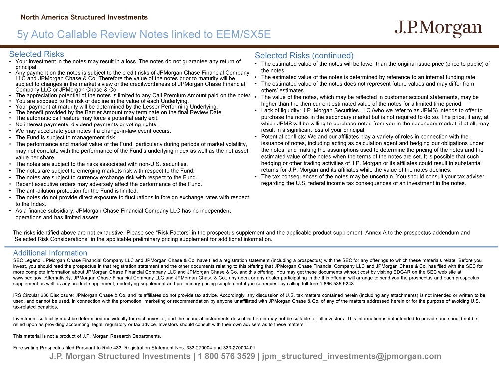 J.P. Morgan Structured Investments | 1 800 576 3529 | jpm_structured_investments@jpmorgan.com Selected Risks • Your investment in the notes may result in a loss. The notes do not guarantee any return of principal. • Any payment on the notes is subject to the credit risks of JPMorgan Chase Financial Company LLC and JPMorgan Chase & Co. Therefore the value of the notes prior to maturity will be subject to changes in the market’s view of the creditworthiness of JPMorgan Chase Financial Company LLC or JPMorgan Chase & Co. • The appreciation potential of the notes is limited to any Call Premium Amount paid on the notes. • You are exposed to the risk of decline in the value of each Underlying. • Your payment at maturity will be determined by the Lesser Performing Underlying. • The benefit provided by the Barrier Amount may terminate on the final Review Date. • The automatic call feature may force a potential early exit. • No interest payments, dividend payments or voting rights. • We may accelerate your notes if a change - in - law event occurs. • The Fund is subject to management risk. • The performance and market value of the Fund, particularly during periods of market volatility, may not correlate with the performance of the Fund’s underlying index as well as the net asset value per share. • The notes are subject to the risks associated with non - U.S. securities. • The notes are subject to emerging markets risk with respect to the Fund. • The notes are subject to currency exchange risk with respect to the Fund. • Recent executive orders may adversely affect the performance of the Fund. • The anti - dilution protection for the Fund is limited. • The notes do not provide direct exposure to fluctuations in foreign exchange rates with respect to the Index. • As a finance subsidiary, JPMorgan Chase Financial Company LLC has no independent operations and has limited assets. Selected Risks (continued) • The estimated value of the notes will be lower than the original issue price (price to public) of the notes. • The estimated value of the notes is determined by reference to an internal funding rate. • The estimated value of the notes does not represent future values and may differ from others’ estimates. • The value of the notes, which may be reflected in customer account statements, may be higher than the then current estimated value of the notes for a limited time period. • Lack of liquidity: J.P. Morgan Securities LLC (who we refer to as JPMS ) intends to offer to purchase the notes in the secondary market but is not required to do so. The price, if any, at which JPMS will be willing to purchase notes from you in the secondary market, if at all, may result in a significant loss of your principal. • Potential conflicts: We and our affiliates play a variety of roles in connection with the issuance of notes, including acting as calculation agent and hedging our obligations under the notes, and making the assumptions used to determine the pricing of the notes and the estimated value of the notes when the terms of the notes are set. It is possible that such hedging or other trading activities of J.P. Morgan or its affiliates could result in substantial returns for J.P. Morgan and its affiliates while the value of the notes declines. • The tax consequences of the notes may be uncertain. You should consult your tax adviser regarding the U.S. federal income tax consequences of an investment in the notes. Additional Information SEC Legend: JPMorgan Chase Financial Company LLC and JPMorgan Chase & Co. have filed a registration statement (including a pr osp ectus) with the SEC for any offerings to which these materials relate. Before you invest, you should read the prospectus in that registration statement and the other documents relating to this offering that JPM organ Chase Financial Company LLC and JPMorgan Chase & Co. has filed with the SEC for more complete information about JPMorgan Chase Financial Company LLC and JPMorgan Chase & Co. and this offering. You may get the se documents without cost by visiting EDGAR on the SEC web site at www.sec.gov. Alternatively, JPMorgan Chase Financial Company LLC and JPMorgan Chase & Co., any agent or any dealer participat ing in the this offering will arrange to send you the prospectus and each prospectus supplement as well as any product supplement, underlying supplement and preliminary pricing supplement if you so request by c all ing toll - free 1 - 866 - 535 - 9248. IRS Circular 230 Disclosure: JPMorgan Chase & Co. and its affiliates do not provide tax advice. Accordingly, any discussion o f U .S. tax matters contained herein (including any attachments) is not intended or written to be used, and cannot be used, in connection with the promotion, marketing or recommendation by anyone unaffiliated with JPMorgan Cha se & Co. of any of the matters addressed herein or for the purpose of avoiding U.S. tax - related penalties. Investment suitability must be determined individually for each investor, and the financial instruments described herein may not be suitable for all investors. This information is not intended to provide and should not be relied upon as providing accounting, legal, regulatory or tax advice. Investors should consult with their own advisers as to the se matters. This material is not a product of J.P. Morgan Research Departments. Free writing Prospectus filed Pursuant to Rule 433; Registration Statement Nos. 333 - 270004 and 333 - 270004 - 01 North America Structured Investments 5y Auto Callable Review Notes linked to EEM / SX5E The risks identified above are not exhaustive. Please see “Risk Factors” in the prospectus supplement and the applicable prod uct supplement, Annex A to the prospectus addendum and “Selected Risk Considerations” in the applicable preliminary pricing supplement for additional information.