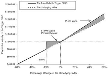 If the Trigger PLUS have not been automatically redeemed prior to maturity and: · the final index value is greater than the initial index value, for each $1,000 stated principal amount Trigger PLUS: $1,000 + leveraged upside payment · the final index value is less than or equal to the initial index value but is greater than or equal to the trigger level, for each $1,000 stated principal amount Trigger PLUS: $1,000 · the final index value is less than the trigger level, for each $1,000 stated principal amount Trigger PLUS: $1,000 × index performance factor This amount will be less than the stated principal amount of $1,000 per Trigger PLUS and will represent a loss of more than 20%, and possibly all, of your investment. |
