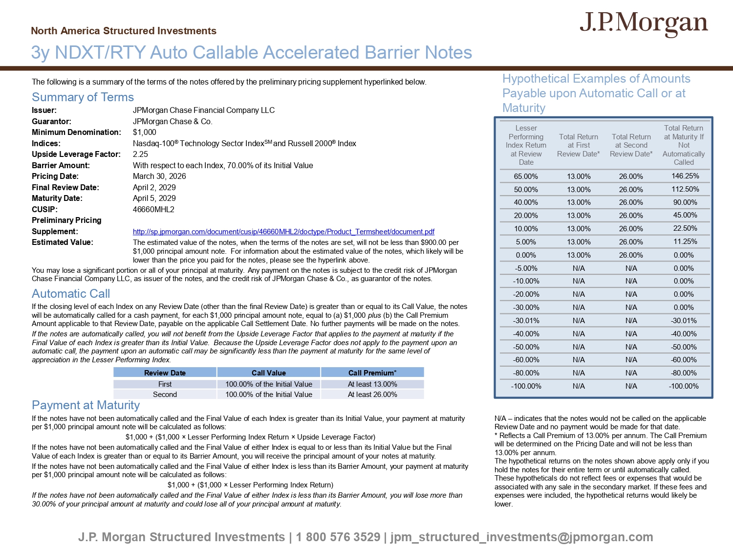 The following is a summary of the terms of the notes offered by the preliminary pricing supplement hyperlinked below. Summary of Terms Issuer: JPMorgan Chase Financial Company LLC Guarantor: JPMorgan Chase & Co. Minimum Denomination: $1,000 Indices: Nasdaq - 100 ® Technology Sector Index SM and Russell 2000 ® Index Upside Leverage Factor: 2.25 Barrier Amount: With respect to each Index, 70.00% of its Initial Value Pricing Date: March 30, 2026 Final Review Date: April 2, 2029 Maturity Date: April 5, 2029 CUSIP: 46660MHL2 Preliminary Pricing Supplement: http://sp.jpmorgan.com/document/cusip/46660MHL2/doctype/Product_Termsheet/document.pdf Estimated Value: The estimated value of the notes, when the terms of the notes are set, will not be less than $900.00 per $1,000 principal amount note. For information about the estimated value of the notes, which likely will be lower than the price you paid for the notes, please see the hyperlink above. You may lose a significant portion or all of your principal at maturity. Any payment on the notes is subject to the credit ri sk of JPMorgan Chase Financial Company LLC, as issuer of the notes, and the credit risk of JPMorgan Chase & Co., as guarantor of the notes. Automatic Call If the closing level of each Index on any Review Date (other than the final Review Date) is greater than or equal to its Call Va lue, the notes will be automatically called for a cash payment, for each $1,000 principal amount note, equal to (a) $1,000 plus (b) the Call Premium Amount applicable to that Review Date, payable on the applicable Call Settlement Date. No further payments will be made on th e n otes. If the notes are automatically called, you will not benefit from the Upside Leverage Factor that applies to the payment at ma tur ity if the Final Value of each Index is greater than its Initial Value. Because the Upside Leverage Factor does not apply to the paymen t u pon an automatic call, the payment upon an automatic call may be significantly less than the payment at maturity for the same level of appreciation in the Lesser Performing Index. Payment at Maturity If the notes have not been automatically called and the Final Value of each Index is greater than its Initial Value, your pay men t at maturity per $1,000 principal amount note will be calculated as follows: $1,000 + ($1,000 î Lesser Performing Index Return î Upside Leverage Factor) If the notes have not been automatically called and the Final Value of either Index is equal to or less than its Initial Valu e b ut the Final Value of each Index is greater than or equal to its Barrier Amount, you will receive the principal amount of your notes at ma tur ity. If the notes have not been automatically called and the Final Value of either Index is less than its Barrier Amount, your pay men t at maturity per $1,000 principal amount note will be calculated as follows: $1,000 + ($1,000 î Lesser Performing Index Return) If the notes have not been automatically called and the Final Value of either Index is less than its Barrier Amount, you will lo se more than 30.00% of your principal amount at maturity and could lose all of your principal amount at maturity. J.P. Morgan Structured Investments | 1 800 576 3529 | jpm_structured_investments@jpmorgan.com 3y NDXT/RTY Auto Callable Accelerated Barrier Notes North America Structured Investments Call Premium* Call Value Review Date At least 13.00 % 100.00% of the Initial Value First At least 26.00 % 100.00% of the Initial Value Second Hypothetical Examples of Amounts Payable upon Automatic Call or at Maturity Total Return at Maturity If Not Automatically Called Total Return at Second Review Date* Total Return at First Review Date* Lesser Performing Index Return at Review Date 146.25% 26.00% 13.00 % 65.00% 112.50% 26.00% 13.00 % 50.00% 90.00% 26.00% 13.00 % 40.00% 45.00% 26.00% 13.00 % 20.00% 22.50% 26.00% 13.00 % 10.00% 11.25% 26.00% 13.00 % 5.00% 0.00% 26.00% 13.00 % 0.00% 0.00% N/A N/A - 5.00% 0.00% N/A N/A - 10.00% 0.00% N/A N/A - 20.00% 0.00% N/A N/A - 30.00% - 30.01% N/A N/A - 30.01% - 40.00% N/A N/A - 40.00% - 50.00% N/A N/A - 50.00% - 60.00% N/A N/A - 60.00% - 80.00% N/A N/A - 80.00% - 100.00% N/A N/A - 100.00% N/A – indicates that the notes would not be called on the applicable Review Date and no payment would be made for that date. * Reflects a Call Premium of 13.00 % per annum. The Call Premium will be determined on the Pricing Date and will not be less than 13.00 % per annum. The hypothetical returns on the notes shown above apply only if you hold the notes for their entire term or until automatically called. These hypotheticals do not reflect fees or expenses that would be associated with any sale in the secondary market. If these fees and expenses were included, the hypothetical returns would likely be lower.