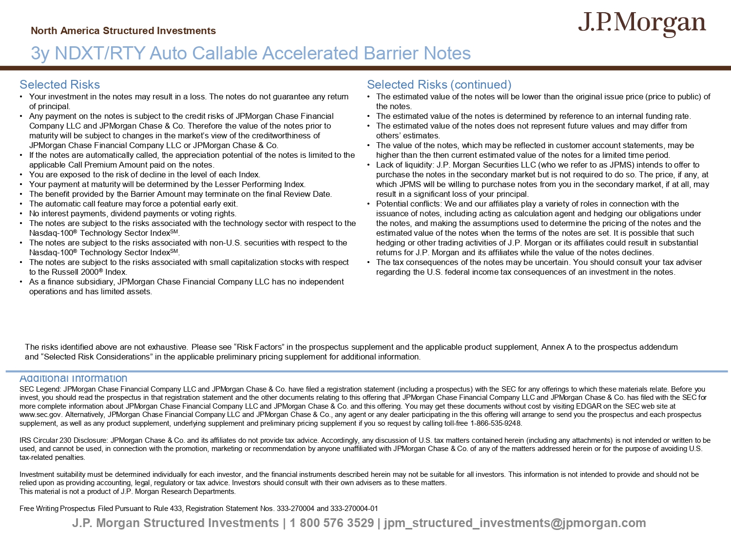 J.P. Morgan Structured Investments | 1 800 576 3529 | jpm_structured_investments@jpmorgan.com Selected Risks • Your investment in the notes may result in a loss. The notes do not guarantee any return of principal. • Any payment on the notes is subject to the credit risks of JPMorgan Chase Financial Company LLC and JPMorgan Chase & Co. Therefore the value of the notes prior to maturity will be subject to changes in the market’s view of the creditworthiness of JPMorgan Chase Financial Company LLC or JPMorgan Chase & Co. • If the notes are automatically called, the appreciation potential of the notes is limited to the applicable Call Premium Amount paid on the notes. • You are exposed to the risk of decline in the level of each Index. • Your payment at maturity will be determined by the Lesser Performing Index. • The benefit provided by the Barrier Amount may terminate on the final Review Date. • The automatic call feature may force a potential early exit. • No interest payments, dividend payments or voting rights. • The notes are subject to the risks associated with the technology sector with respect to the Nasdaq - 100 ® Technology Sector Index SM . • The notes are subject to the risks associated with non - U.S. securities with respect to the Nasdaq - 100 ® Technology Sector Index SM . • The notes are subject to the risks associated with small capitalization stocks with respect to the Russell 2000 ® Index. • As a finance subsidiary, JPMorgan Chase Financial Company LLC has no independent operations and has limited assets. Selected Risks (continued) • The estimated value of the notes will be lower than the original issue price (price to public) of the notes. • The estimated value of the notes is determined by reference to an internal funding rate. • The estimated value of the notes does not represent future values and may differ from others’ estimates. • The value of the notes, which may be reflected in customer account statements, may be higher than the then current estimated value of the notes for a limited time period. • Lack of liquidity: J.P. Morgan Securities LLC (who we refer to as JPMS) intends to offer to purchase the notes in the secondary market but is not required to do so. The price, if any, at which JPMS will be willing to purchase notes from you in the secondary market, if at all, may result in a significant loss of your principal. • Potential conflicts: We and our affiliates play a variety of roles in connection with the issuance of notes, including acting as calculation agent and hedging our obligations under the notes, and making the assumptions used to determine the pricing of the notes and the estimated value of the notes when the terms of the notes are set. It is possible that such hedging or other trading activities of J.P. Morgan or its affiliates could result in substantial returns for J.P. Morgan and its affiliates while the value of the notes declines. • The tax consequences of the notes may be uncertain. You should consult your tax adviser regarding the U.S. federal income tax consequences of an investment in the notes. Additional Information SEC Legend: JPMorgan Chase Financial Company LLC and JPMorgan Chase & Co. have filed a registration statement (including a pr osp ectus) with the SEC for any offerings to which these materials relate. Before you invest, you should read the prospectus in that registration statement and the other documents relating to this offering that JPM organ Chase Financial Company LLC and JPMorgan Chase & Co. has filed with the SEC for more complete information about JPMorgan Chase Financial Company LLC and JPMorgan Chase & Co. and this offering. You may get the se documents without cost by visiting EDGAR on the SEC web site at www.sec.gov. Alternatively, JPMorgan Chase Financial Company LLC and JPMorgan Chase & Co., any agent or any dealer participat ing in the this offering will arrange to send you the prospectus and each prospectus supplement, as well as any product supplement, underlying supplement and preliminary pricing supplement if you so request by cal ling toll - free 1 - 866 - 535 - 9248. IRS Circular 230 Disclosure: JPMorgan Chase & Co. and its affiliates do not provide tax advice. Accordingly, any discussion o f U .S. tax matters contained herein (including any attachments) is not intended or written to be used, and cannot be used, in connection with the promotion, marketing or recommendation by anyone unaffiliated with JPMorgan Cha se & Co. of any of the matters addressed herein or for the purpose of avoiding U.S. tax - related penalties. Investment suitability must be determined individually for each investor, and the financial instruments described herein may not be suitable for all investors. This information is not intended to provide and should not be relied upon as providing accounting, legal, regulatory or tax advice. Investors should consult with their own advisers as to the se matters. This material is not a product of J.P. Morgan Research Departments. Free Writing Prospectus Filed Pursuant to Rule 433, Registration Statement Nos. 333 - 270004 and 333 - 270004 - 01 North America Structured Investments 3y NDXT/RTY Auto Callable Accelerated Barrier Notes The risks identified above are not exhaustive. Please see “Risk Factors” in the prospectus supplement and the applicable prod uct supplement, Annex A to the prospectus addendum and “Selected Risk Considerations” in the applicable preliminary pricing supplement for additional information.
