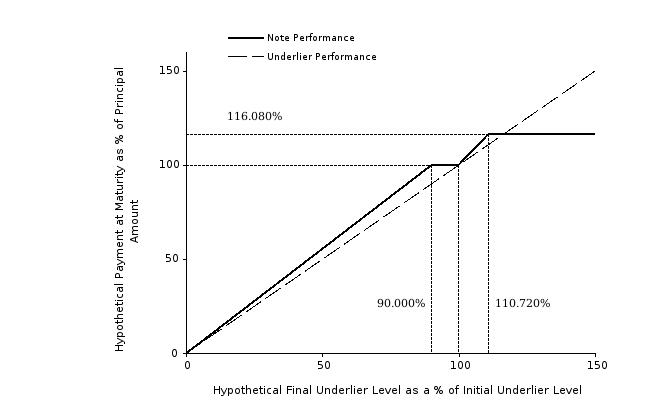 The following chart also shows a graphical illustration of the hypothetical payments at maturity (expressed as a percentage of the principal amount of your notes) that we would pay on your notes on the stated maturity date, if the final underlier level (expressed as a percentage of the initial underlier level) were any of the hypothetical levels shown on the horizontal axis. The chart shows that any hypothetical final underlier level (expressed as a percentage of the initial underlier level) of less than 90.000% (the section left of the 90.000% marker on the horizontal axis) would result in a hypothetical payment at maturity of less than 100.000% of the principal amount of your notes (the section below the 100.000% marker on the vertical axis) and, accordingly, in a loss of principal to the holder of the notes. The chart also shows that any hypothetical final underlier level (expressed as a percentage of the initial underlier level) of greater than or equal to 110.720% (the section right of the 110.720% marker on the horizontal axis) would result in a capped return on your investment.