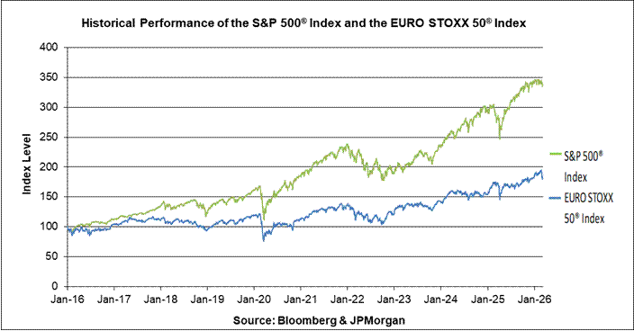 The graph below illustrates the daily performance of the S&P 500® Index and the EURO STOXX 50® Index from January 4, 2016 through March 11, 2026. For comparison purposes, each Underlying has been normalized to have a closing level of 100.00 on January 4, 2016 by dividing the closing level of that Underlying on each day by the closing level of that Underlying on January 4, 2016 and multiplying by 100.00. We obtained the closing levels used to determine the normalized closing levels set forth below from Bloomberg, without independent verification.