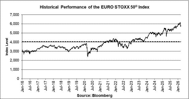 The graph below illustrates the daily performance of the EURO STOXX 50® Index from January 4, 2016 through March 11, 2026, based on information from Bloomberg, without independent verification. The closing level of the EURO STOXX 50® Index on March 11, 2026 was 5,794.68. We obtained the closing levels of the EURO STOXX 50® Index above and below from Bloomberg, without independent verification.