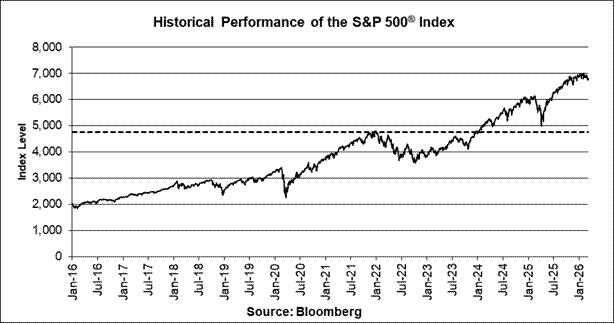 The graph below illustrates the daily performance of the S&P 500® Index from January 4, 2016 through March 11, 2026, based on information from Bloomberg, without independent verification. The closing level of the S&P 500® Index on March 11, 2026 was 6,775.80. We obtained the closing levels of the S&P 500® Index above and below from Bloomberg, without independent verification.
