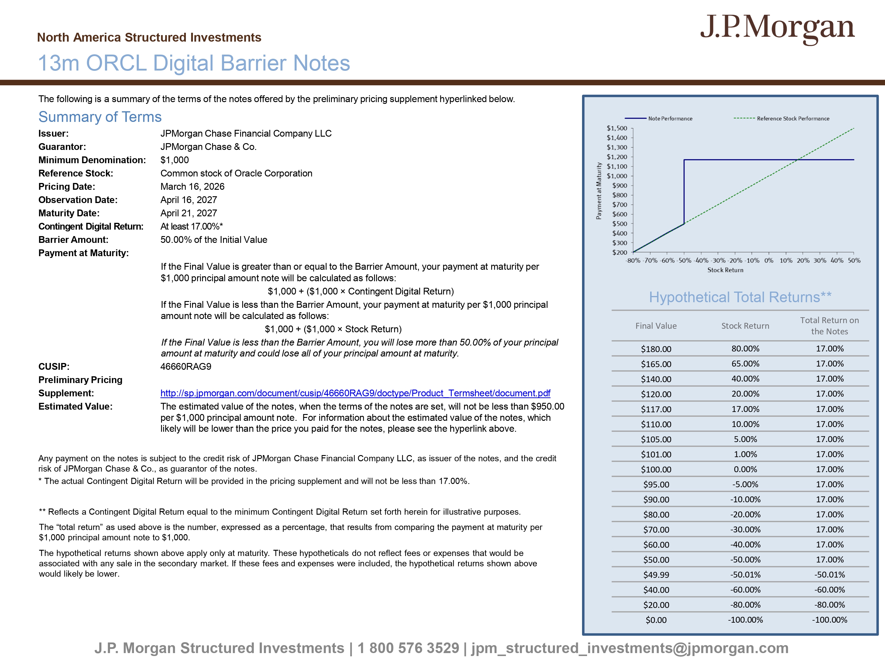 H The following is a summary of the terms of the notes offered by the preliminary pricing supplement hyperlinked below. Summary of Terms Issuer: JPMorgan Chase Financial Company LLC Guarantor: JPMorgan Chase & Co. Minimum Denomination: $1,000 Reference Stock: Common stock of Oracle Corporation Pricing Date: March 16, 2026 Observation Date: April 16, 2027 Maturity Date: April 21, 2027 Contingent Digital Return: At least 17.00%* Barrier Amount: 50.00% of the Initial Value Payment at Maturity: If the Final Value is greater than or equal to the Barrier Amount, your payment at maturity per $1,000 principal amount note will be calculated as follows: $1,000 + ($1,000 î Contingent Digital Return) If the Final Value is less than the Barrier Amount, your payment at maturity per $1,000 principal amount note will be calculated as follows: $1,000 + ($1,000 î Stock Return) If the Final Value is less than the Barrier Amount, you will lose more than 50.00 % of your principal amount at maturity and could lose all of your principal amount at maturity. CUSIP: 46660RAG9 Preliminary Pricing Supplement: http://sp.jpmorgan.com/document/cusip/46660RAG9/doctype/Product_Termsheet/document.pdf Estimated Value: The estimated value of the notes, when the terms of the notes are set, will not be less than $950.00 per $1,000 principal amount note. For information about the estimated value of the notes, which likely will be lower than the price you paid for the notes, please see the hyperlink above. Any payment on the notes is subject to the credit risk of JPMorgan Chase Financial Company LLC, as issuer of the notes, and t he credit risk of JPMorgan Chase & Co., as guarantor of the notes. * The actual Contingent Digital Return will be provided in the pricing supplement and will not be less than 17.00%. J.P. Morgan Structured Investments | 1 800 576 3529 | jpm_structured_investments@jpmorgan.com Hypothetical Total Returns** Total Return on the Notes Stock Return Final Value 17.00% 80.00% $180.00 17.00% 65.00% $165.00 17.00% 40.00% $140.00 17.00% 20.00% $120.00 17.00% 17.00% $117.00 17.00% 10.00% $110.00 17.00% 5.00% $105.00 17.00% 1.00% $101.00 17.00% 0.00% $100.00 17.00% - 5.00% $95.00 17.00% - 10.00% $90.00 17.00% - 20.00% $80.00 17.00% - 30.00% $70.00 17.00% - 40.00% $60.00 17.00% - 50.00% $50.00 - 50.01% - 50.01% $49.99 - 60.00% - 60.00% $40.00 - 80.00% - 80.00% $20.00 - 100.00% - 100.00% $0.00 13m ORCL Digital Barrier Notes North America Structured Investments ** Reflects a Contingent Digital Return equal to the minimum Contingent Digital Return set forth herein for illustrative purposes. The “total return” as used above is the number, expressed as a percentage, that results from comparing the payment at maturit y p er $1,000 principal amount note to $1,000. The hypothetical returns shown above apply only at maturity. These hypotheticals do not reflect fees or expenses that would b e associated with any sale in the secondary market. If these fees and expenses were included, the hypothetical returns shown ab ove would likely be lower.