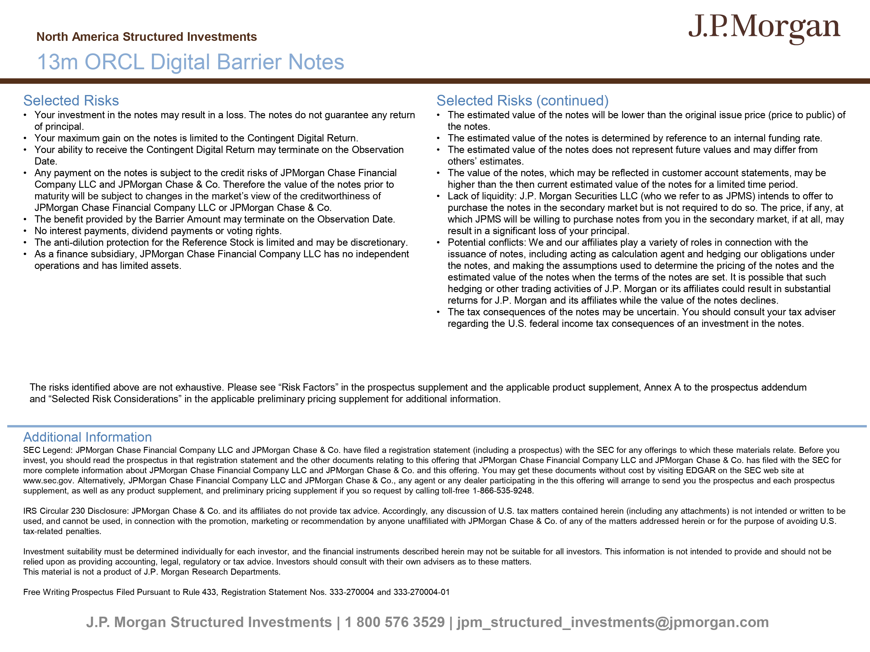 J.P. Morgan Structured Investments | 1 800 576 3529 | jpm_structured_investments@jpmorgan.com Selected Risks • Your investment in the notes may result in a loss. The notes do not guarantee any return of principal. • Your maximum gain on the notes is limited to the Contingent Digital Return. • Your ability to receive the Contingent Digital Return may terminate on the Observation Date. • Any payment on the notes is subject to the credit risks of JPMorgan Chase Financial Company LLC and JPMorgan Chase & Co. Therefore the value of the notes prior to maturity will be subject to changes in the market’s view of the creditworthiness of JPMorgan Chase Financial Company LLC or JPMorgan Chase & Co. • The benefit provided by the Barrier Amount may terminate on the Observation Date. • No interest payments, dividend payments or voting rights. • The anti - dilution protection for the Reference Stock is limited and may be discretionary. • As a finance subsidiary, JPMorgan Chase Financial Company LLC has no independent operations and has limited assets. Selected Risks (continued) • The estimated value of the notes will be lower than the original issue price (price to public) of the notes. • The estimated value of the notes is determined by reference to an internal funding rate. • The estimated value of the notes does not represent future values and may differ from others’ estimates. • The value of the notes, which may be reflected in customer account statements, may be higher than the then current estimated value of the notes for a limited time period. • Lack of liquidity: J.P. Morgan Securities LLC (who we refer to as JPMS ) intends to offer to purchase the notes in the secondary market but is not required to do so. The price, if any, at which JPMS will be willing to purchase notes from you in the secondary market, if at all, may result in a significant loss of your principal. • Potential conflicts: We and our affiliates play a variety of roles in connection with the issuance of notes, including acting as calculation agent and hedging our obligations under the notes, and making the assumptions used to determine the pricing of the notes and the estimated value of the notes when the terms of the notes are set. It is possible that such hedging or other trading activities of J.P. Morgan or its affiliates could result in substantial returns for J.P. Morgan and its affiliates while the value of the notes declines. • The tax consequences of the notes may be uncertain. You should consult your tax adviser regarding the U.S. federal income tax consequences of an investment in the notes. Additional Information SEC Legend: JPMorgan Chase Financial Company LLC and JPMorgan Chase & Co. have filed a registration statement (including a pr osp ectus) with the SEC for any offerings to which these materials relate. Before you invest, you should read the prospectus in that registration statement and the other documents relating to this offering that JPM organ Chase Financial Company LLC and JPMorgan Chase & Co. has filed with the SEC for more complete information about JPMorgan Chase Financial Company LLC and JPMorgan Chase & Co. and this offering. You may get the se documents without cost by visiting EDGAR on the SEC web site at www.sec.gov. Alternatively, JPMorgan Chase Financial Company LLC and JPMorgan Chase & Co., any agent or any dealer participat ing in the this offering will arrange to send you the prospectus and each prospectus supplement, as well as any product supplement, and preliminary pricing supplement if you so request by calling toll - free 1 - 866 - 5 35 - 9248. IRS Circular 230 Disclosure: JPMorgan Chase & Co. and its affiliates do not provide tax advice. Accordingly, any discussion o f U .S. tax matters contained herein (including any attachments) is not intended or written to be used, and cannot be used, in connection with the promotion, marketing or recommendation by anyone unaffiliated with JPMorgan Cha se & Co. of any of the matters addressed herein or for the purpose of avoiding U.S. tax - related penalties. Investment suitability must be determined individually for each investor, and the financial instruments described herein may not be suitable for all investors. This information is not intended to provide and should not be relied upon as providing accounting, legal, regulatory or tax advice. Investors should consult with their own advisers as to the se matters. This material is not a product of J.P. Morgan Research Departments. Free Writing Prospectus Filed Pursuant to Rule 433, Registration Statement Nos. 333 - 270004 and 333 - 270004 - 01 North America Structured Investments 13m ORCL Digital Barrier Notes The risks identified above are not exhaustive. Please see “Risk Factors” in the prospectus supplement and the applicable prod uct supplement, Annex A to the prospectus addendum and “Selected Risk Considerations” in the applicable preliminary pricing supplement for additional information.