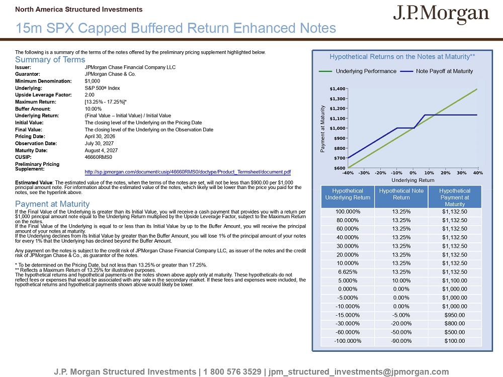 North America Structured Investments 15m SPX Capped Buffered Return Enhanced Notes The following is a summary of the terms of the notes offered by the preliminary pricing supplement highlighted below. Summary of Terms JPMorgan Chase Financial Company LLC JPMorgan Chase & Co. $1,000 S&P 500 ® Index 2.00 [13.25% - 17.25%]* 10.00% (Final Value – Initial Value) / Initial Value The closing level of the Underlying on the Pricing Date The closing level of the Underlying on the Observation Date April 30, 2026 July 30, 2027 August 4, 2027 46660RMS0 Issuer: Guarantor: Minimum Denomination: Underlying: Upside Leverage Factor: Maximum Return: Buffer Amount: Underlying Return: Initial Value: Final Value: Pricing Date: Observation Date: Maturity Date: CUSIP: Preliminary Pricing Supplement: http://sp.jpmorgan.com/document/cusip/46660RMS0/doctype/Product_Termsheet/document.pdf Estimated Value : The estimated value of the notes, when the terms of the notes are set, will not be less than $900.00 per $1,000 principal amount note. For information about the estimated value of the notes, which likely will be lower than the price you paid for the notes, see the hyperlink above. Payment at Maturity If the Final Value of the Underlying is greater than its Initial Value, you will receive a cash payment that provides you with a return per $1,000 principal amount note equal to the Underlying Return multiplied by the Upside Leverage Factor, subject to the Maximum Return on the notes. If the Final Value of the Underlying is equal to or less than its Initial Value by up to the Buffer Amount, you will receive the principal amount of your notes at maturity. If the Underlying declines from its Initial Value by greater than the Buffer Amount, you will lose 1% of the principal amount of your notes for every 1% that the Underlying has declined beyond the Buffer Amount. Any payment on the notes is subject to the credit risk of JPMorgan Chase Financial Company LLC, as issuer of the notes and the credit risk of JPMorgan Chase & Co., as guarantor of the notes. * To be determined on the Pricing Date, but not less than 13.25% or greater than 17.25%. ** Reflects a Maximum Return of 13.25% for illustrative purposes. The hypothetical returns and hypothetical payments on the notes shown above apply only at maturity. These hypotheticals do not reflect fees or expenses that would be associated with any sale in the secondary market. If these fees and expenses were included, the hypothetical returns and hypothetical payments shown above would likely be lower. Hypothetical Returns on the Notes at Maturity** Underlying Performance Note Payoff at Maturity Payment at Maturity Underlying Return Hypothetical Payment at Maturity Hypothetical Note Return Hypothetical Underlying Return $1,132.50 13.25% 100.000% $1,132.50 13.25% 80.000% $1,132.50 13.25% 60.000% $1,132.50 13.25% 40.000% $1,132.50 13.25% 30.000% $1,132.50 13.25% 20.000% $1,132.50 13.25% 10.000% $1,132.50 13.25% 6.625% $1,100.00 10.00% 5.000% $1,000.00 0.00% 0.000% $1,000.00 0.00% - 5.000% $1,000.00 0.00% - 10.000% $950.00 - 5.00% - 15.000% $800.00 - 20.00% - 30.000% $500.00 - 50.00% - 60.000% $100.00 - 90.00% - 100.000% J.P. Morgan Structured Investments | 1 800 576 3529 | jpm_structured_investments@jpmorgan.com