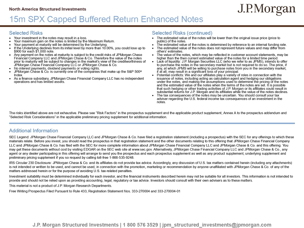 North America Structured Investments 15m SPX Capped Buffered Return Enhanced Notes Ɣ Ɣ Ɣ Ɣ Your investment in the notes may result in a loss. Your maximum gain on the notes is limited by the Maximum Return. Your payment at maturity will be determined by the Underlying. If the Underlying declines from its initial level by more than 10.00%, you could lose up to $900 for each $1,000 note. Any payment on the notes at maturity is subject to the credit risks of JPMorgan Chase Financial Company LLC and JPMorgan Chase & Co. Therefore the value of the notes prior to maturity will be subject to changes in the market’s view of the creditworthiness of JPMorgan Chase Financial Company LLC or JPMorgan Chase & Co. No interest payments, dividend payments or voting rights. JPMorgan Chase & Co. is currently one of the companies that make up the S&P 500 ® Index. As a finance subsidiary, JPMorgan Chase Financial Company LLC has no independent operations and has limited assets. Selected Risks Selected Risks (continued) Ɣ Ɣ Ɣ Ɣ Ɣ The estimated value of the notes will be lower than the original issue price (price to public) of the notes. The estimated value of the notes is determined by reference to an internal funding rate. The estimated value of the notes does not represent future values and may differ from others’ estimates. The value of the notes, which may be reflected in customer account statements, may be higher than the then current estimated value of the notes for a limited time period. Lack of liquidity : J . P . Morgan Securities LLC (who we refer to as JPMS), intends to offer to purchase the notes in the secondary market but is not required to do so . The price, if any, at which JPMS will be willing to purchase notes from you in the secondary market, if at all, may result in a significant loss of your principal . Potential conflicts: We and our affiliates play a variety of roles in connection with the issuance of notes, including acting as calculation agent and hedging our obligations under the notes, and making the assumptions used to determine the pricing of the notes and the estimated value of the notes when the terms of the notes are set. It is possible that such hedging or other trading activities of J.P. Morgan or its affiliates could result in substantial returns for J.P. Morgan and its affiliates while the value of the notes declines. The tax consequences of the notes may be uncertain. You should consult your tax adviser regarding the U.S. federal income tax consequences of an investment in the notes. Ɣ Ɣ Ɣ Ɣ Ɣ Ɣ The risks identified above are not exhaustive. Please see “Risk Factors” in the prospectus supplement and the applicable product supplement, Annex A to the prospectus addendum and “Selected Risk Considerations” in the applicable preliminary pricing supplement for additional information. Additional Information SEC Legend: JPMorgan Chase Financial Company LLC and JPMorgan Chase & Co. have filed a registration statement (including a prospectus) with the SEC for any offerings to which these materials relate. Before you invest, you should read the prospectus in that registration statement and the other documents relating to this offering that JPMorgan Chase Financial Company LLC and JPMorgan Chase & Co. has filed with the SEC for more complete information about JPMorgan Chase Financial Company LLC and JPMorgan Chase & Co. and this offering. You may get these documents without cost by visiting EDGAR on the SEC web site at www.sec.gov. Alternatively, JPMorgan Chase Financial Company LLC and JPMorgan Chase & Co., any agent or any dealer participating in this offering will arrange to send you the prospectus and each prospectus supplement as well as any product supplement, underlying supplement and preliminary pricing supplement if you so request by calling toll - free 1 - 866 - 535 - 9248. IRS Circular 230 Disclosure: JPMorgan Chase & Co. and its affiliates do not provide tax advice. Accordingly, any discussion of U.S. tax matters contained herein (including any attachments) is not intended or written to be used, and cannot be used, in connection with the promotion, marketing or recommendation by anyone unaffiliated with JPMorgan Chase & Co. of any of the matters addressed herein or for the purpose of avoiding U.S. tax - related penalties. Investment suitability must be determined individually for each investor, and the financial instruments described herein may not be suitable for all investors. This information is not intended to provide and should not be relied upon as providing accounting, legal, regulatory or tax advice. Investors should consult with their own advisers as to these matters. This material is not a product of J.P. Morgan Research Departments. Free Writing Prospectus Filed Pursuant to Rule 433, Registration Statement Nos. 333 - 270004 and 333 - 270004 - 01 J.P. Morgan Structured Investments | 1 800 576 3529 | jpm_structured_investments@jpmorgan.com