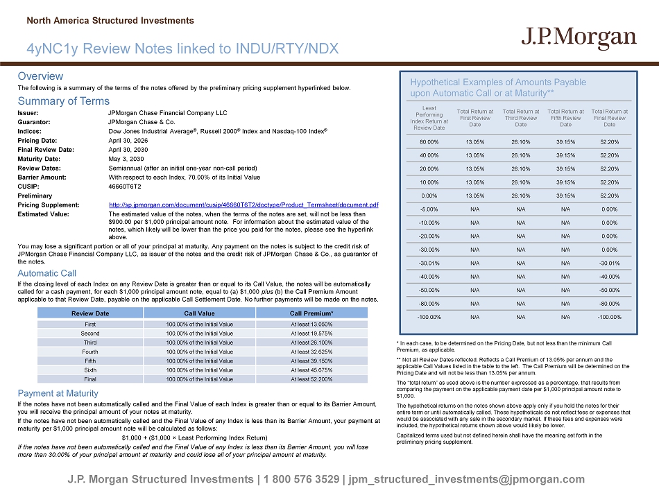 Overview The following is a summary of the terms of the notes offered by the preliminary pricing supplement hyperlinked below. Summary of Terms Issuer: JPMorgan Chase Financial Company LLC Guarantor: JPMorgan Chase & Co. Indices: Dow Jones Industrial Average ® , Russell 2000 ® Index and Nasdaq - 100 Index ® Pricing Date: April 30, 2026 Final Review Date: April 30, 2030 Maturity Date: May 3, 2030 Review Dates: Semiannual (after an initial one - year non - call period) Barrier Amount: With respect to each Index, 70.00% of its Initial Value CUSIP: 46660T6T2 Preliminary Pricing Supplement: http://sp.jpmorgan.com/document/cusip/46660T6T2/doctype/Product_Termsheet/document.pdf Estimated Value: The estimated value of the notes, when the terms of the notes are set, will not be less than $900.00 per $1,000 principal amount note. For information about the estimated value of the notes, which likely will be lower than the price you paid for the notes, please see the hyperlink above. You may lose a significant portion or all of your principal at maturity. Any payment on the notes is subject to the credit ri sk of JPMorgan Chase Financial Company LLC, as issuer of the notes and the credit risk of JPMorgan Chase & Co., as guarantor of the notes. Automatic Call If the closing level of each Index on any Review Date is greater than or equal to its Call Value, the notes will be automatic all y called for a cash payment, for each $1,000 principal amount note, equal to (a) $1,000 plus (b) the Call Premium Amount applicable to that Review Date, payable on the applicable Call Settlement Date. No further payments will be made on the notes . Payment at Maturity If the notes have not been automatically called and the Final Value of each Index is greater than or equal to its Barrier Amo unt , you will receive the principal amount of your notes at maturity. If the notes have not been automatically called and the Final Value of any Index is less than its Barrier Amount, your paymen t a t maturity per $1,000 principal amount note will be calculated as follows: $1,000 + ($1,000 î Least Performing Index Return) If the notes have not been automatically called and the Final Value of any Index is less than its Barrier Amount, you will lo se more than 30.00% of your principal amount at maturity and could lose all of your principal amount at maturity. Hypothetical Examples of Amounts Payable upon Automatic Call or at Maturity** J.P. Morgan Structured Investments | 1 800 576 3529 | jpm_structured_investments@jpmorgan.com 4yNC1y Review Notes linked to INDU/RTY/NDX North America Structured Investments Total Return at Final Review Date Total Return at Fifth Review Date Total Return at Third Review Date Total Return at First Review Date Least Performing Index Return at Review Date 52.20% 39.15% 26.10% 13.05% 80.00% 52.20% 39.15% 26.10% 13.05% 40.00% 52.20% 39.15% 26.10% 13.05% 20.00% 52.20% 39.15% 26.10% 13.05% 10.00% 52.20% 39.15% 26.10% 13.05% 0.00% 0.00% N/A N/A N/A - 5.00% 0.00% N/A N/A N/A - 10.00% 0.00% N/A N/A N/A - 20.00% 0.00% N/A N/A N/A - 30.00% - 30.01% N/A N/A N/A - 30.01% - 40.00% N/A N/A N/A - 40.00% - 50.00% N/A N/A N/A - 50.00% - 80.00% N/A N/A N/A - 80.00% - 100.00 % N/A N/A N/A - 100.00% * In each case, to be determined on the Pricing Date, but not less than the minimum Call Premium, as applicable. ** Not all Review Dates reflected. Reflects a Call Premium of 13.05% per annum and the applicable Call Values listed in the table to the left. The Call Premium will be determined on the Pricing Date and will not be less than 13.05% per annum. The “total return” as used above is the number expressed as a percentage, that results from comparing the payment on the applicable payment date per $1,000 principal amount note to $1,000. The hypothetical returns on the notes shown above apply only if you hold the notes for their entire term or until automatically called. These hypotheticals do not reflect fees or expenses that would be associated with any sale in the secondary market. If these fees and expenses were included, the hypothetical returns shown above would likely be lower. Capitalized terms used but not defined herein shall have the meaning set forth in the preliminary pricing supplement. Call Premium* Call Value Review Date At least 13.050% 100.00% of the Initial Value First At least 19.575% 100.00% of the Initial Value Second At least 26.100% 100.00% of the Initial Value Third At least 32.625% 100.00% of the Initial Value Fourth At least 39.150% 100.00% of the Initial Value Fifth At least 45.675% 100.00% of the Initial Value Sixth At least 52.200% 100.00% of the Initial Value Final