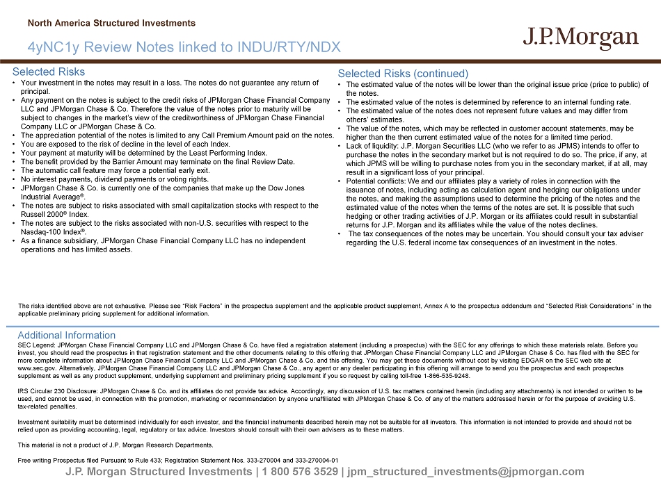 J.P. Morgan Structured Investments | 1 800 576 3529 | jpm_structured_investments@jpmorgan.com Selected Risks • Your investment in the notes may result in a loss. The notes do not guarantee any return of principal. • Any payment on the notes is subject to the credit risks of JPMorgan Chase Financial Company LLC and JPMorgan Chase & Co. Therefore the value of the notes prior to maturity will be subject to changes in the market’s view of the creditworthiness of JPMorgan Chase Financial Company LLC or JPMorgan Chase & Co. • The appreciation potential of the notes is limited to any Call Premium Amount paid on the notes. • You are exposed to the risk of decline in the level of each Index. • Your payment at maturity will be determined by the Least Performing Index. • The benefit provided by the Barrier Amount may terminate on the final Review Date. • The automatic call feature may force a potential early exit. • No interest payments, dividend payments or voting rights. • JPMorgan Chase & Co. is currently one of the companies that make up the Dow Jones Industrial Average ® . • The notes are subject to risks associated with small capitalization stocks with respect to the Russell 2000 ® Index. • The notes are subject to the risks associated with non - U.S. securities with respect to the Nasdaq - 100 Index ® . • As a finance subsidiary, JPMorgan Chase Financial Company LLC has no independent operations and has limited assets. Selected Risks (continued) • The estimated value of the notes will be lower than the original issue price (price to public) of the notes. • The estimated value of the notes is determined by reference to an internal funding rate. • The estimated value of the notes does not represent future values and may differ from others’ estimates. • The value of the notes, which may be reflected in customer account statements, may be higher than the then current estimated value of the notes for a limited time period. • Lack of liquidity: J.P. Morgan Securities LLC (who we refer to as JPMS ) intends to offer to purchase the notes in the secondary market but is not required to do so. The price, if any, at which JPMS will be willing to purchase notes from you in the secondary market, if at all, may result in a significant loss of your principal. • Potential conflicts: We and our affiliates play a variety of roles in connection with the issuance of notes, including acting as calculation agent and hedging our obligations under the notes, and making the assumptions used to determine the pricing of the notes and the estimated value of the notes when the terms of the notes are set. It is possible that such hedging or other trading activities of J.P. Morgan or its affiliates could result in substantial returns for J.P. Morgan and its affiliates while the value of the notes declines. • The tax consequences of the notes may be uncertain. You should consult your tax adviser regarding the U.S. federal income tax consequences of an investment in the notes. Additional Information SEC Legend: JPMorgan Chase Financial Company LLC and JPMorgan Chase & Co. have filed a registration statement (including a pr osp ectus) with the SEC for any offerings to which these materials relate. Before you invest, you should read the prospectus in that registration statement and the other documents relating to this offering that JPM organ Chase Financial Company LLC and JPMorgan Chase & Co. has filed with the SEC for more complete information about JPMorgan Chase Financial Company LLC and JPMorgan Chase & Co. and this offering. You may get the se documents without cost by visiting EDGAR on the SEC web site at www.sec.gov. Alternatively, JPMorgan Chase Financial Company LLC and JPMorgan Chase & Co., any agent or any dealer participat ing in this offering will arrange to send you the prospectus and each prospectus supplement as well as any product supplement, underlying supplement and preliminary pricing supplement if you so request by c all ing toll - free 1 - 866 - 535 - 9248. IRS Circular 230 Disclosure: JPMorgan Chase & Co. and its affiliates do not provide tax advice. Accordingly, any discussion o f U .S. tax matters contained herein (including any attachments) is not intended or written to be used, and cannot be used, in connection with the promotion, marketing or recommendation by anyone unaffiliated with JPMorgan Cha se & Co. of any of the matters addressed herein or for the purpose of avoiding U.S. tax - related penalties. Investment suitability must be determined individually for each investor, and the financial instruments described herein may not be suitable for all investors. This information is not intended to provide and should not be relied upon as providing accounting, legal, regulatory or tax advice. Investors should consult with their own advisers as to the se matters. This material is not a product of J.P. Morgan Research Departments. Free writing Prospectus filed Pursuant to Rule 433; Registration Statement Nos. 333 - 270004 and 333 - 270004 - 01 North America Structured Investments 4yNC1y Review Notes linked to INDU/RTY/NDX The risks identified above are not exhaustive. Please see “Risk Factors” in the prospectus supplement and the applicable product supplement, Annex A to the prospectus addendum and “Selected Risk Considerations” in the applicable preliminary pricing supplement for additional information.