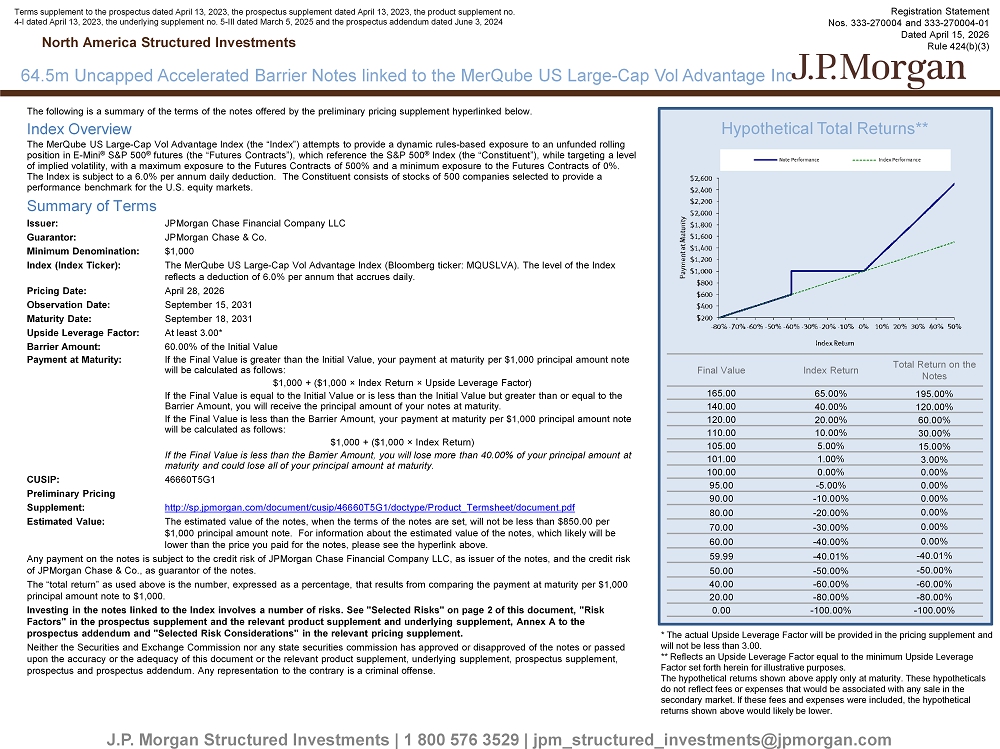 The following is a summary of the terms of the notes offered by the preliminary pricing supplement hyperlinked below. Index Overview The MerQube US Large - Cap Vol Advantage Index (the “Index”) attempts to provide a dynamic rules - based exposure to an unfunded rolling position in E - Mini ® S&P 500 ® futures (the “Futures Contracts”), which reference the S&P 500 ® Index (the “Constituent”), while targeting a level of implied volatility, with a maximum exposure to the Futures Contracts of 500% and a minimum exposure to the Futures Contrac ts of 0%. The Index is subject to a 6.0% per annum daily deduction. The Constituent consists of stocks of 500 companies selected to pr ovi de a performance benchmark for the U.S. equity markets. Summary of Terms Issuer: JPMorgan Chase Financial Company LLC Guarantor: JPMorgan Chase & Co. Minimum Denomination: $1,000 Index (Index Ticker): The MerQube US Large - Cap Vol Advantage Index (Bloomberg ticker: MQUSLVA). The level of the Index reflects a deduction of 6.0% per annum that accrues daily. Pricing Date: April 28, 2026 Observation Date: September 15, 2031 Maturity Date: September 18, 2031 Upside Leverage Factor: At least 3.00* Barrier Amount: 60.00% of the Initial Value Payment at Maturity: If the Final Value is greater than the Initial Value, your payment at maturity per $1,000 principal amount note will be calculated as follows: $1,000 + ($1,000 î Index Return î Upside Leverage Factor) If the Final Value is equal to the Initial Value or is less than the Initial Value but greater than or equal to the Barrier Amount, you will receive the principal amount of your notes at maturity. If the Final Value is less than the Barrier Amount, your payment at maturity per $1,000 principal amount note will be calculated as follows: $1,000 + ($1,000 î Index Return) If the Final Value is less than the Barrier Amount, you will lose more than 40.00% of your principal amount at maturity and could lose all of your principal amount at maturity. CUSIP: 46660T5G1 Preliminary Pricing Supplement: http://sp.jpmorgan.com/document/cusip/46660T5G1/doctype/Product_Termsheet/document.pdf Estimated Value: The estimated value of the notes, when the terms of the notes are set, will not be less than $850.00 per $1,000 principal amount note. For information about the estimated value of the notes, which likely will be lower than the price you paid for the notes, please see the hyperlink above. Any payment on the notes is subject to the credit risk of JPMorgan Chase Financial Company LLC, as issuer of the notes, and t he credit risk of JPMorgan Chase & Co., as guarantor of the notes. The “total return” as used above is the number, expressed as a percentage, that results from comparing the payment at maturit y p er $1,000 principal amount note to $1,000. Investing in the notes linked to the Index involves a number of risks. See "Selected Risks" on page 2 of this document, "Risk Factors" in the prospectus supplement and the relevant product supplement and underlying supplement, Annex A to the prospectus addendum and "Selected Risk Considerations" in the relevant pricing supplement. Neither the Securities and Exchange Commission nor any state securities commission has approved or disapproved of the notes o r p assed upon the accuracy or the adequacy of this document or the relevant product supplement, underlying supplement, prospectus supp lem ent, prospectus and prospectus addendum. Any representation to the contrary is a criminal offense. J.P. Morgan Structured Investments | 1 800 576 3529 | jpm_structured_investments@jpmorgan.com 64.5m Uncapped Accelerated Barrier Notes linked to the MerQube US Large - Cap Vol Advantage Index H North America Structured Investments Registration Statement Nos. 333 - 270004 and 333 - 270004 - 01 Dated April 15, 2026 Rule 424(b)(3) Terms supplement to the prospectus dated April 13, 2023, the prospectus supplement dated April 13, 2023, the product suppleme nt no. 4 - I dated April 13, 2023, the underlying supplement no. 5 - III dated March 5, 2025 and the prospectus addendum dated June 3, 2024 Hypothetical Total Returns** Total Return on the Notes Index Return Final Value 195.00% 65.00% 165.00 120.00% 40.00% 140.00 60.00% 20.00% 120.00 30.00% 10.00% 110.00 15.00% 5.00% 105.00 3.00% 1.00% 101.00 0.00% 0.00% 100.00 0.00% - 5.00% 95.00 0.00% - 10.00% 90.00 0.00% - 20.00% 80.00 0.00% - 30.00% 70.00 0.00% - 40.00% 60.00 - 40.01% - 40.01% 59.99 - 50.00% - 50.00% 50.00 - 60.00% - 60.00% 40.00 - 80.00% - 80.00% 20.00 - 100.00% - 100.00% 0.00 * The actual Upside Leverage Factor will be provided in the pricing supplement and will not be less than 3.00. ** Reflects an Upside Leverage Factor equal to the minimum Upside Leverage Factor set forth herein for illustrative purposes. The hypothetical returns shown above apply only at maturity. These hypotheticals do not reflect fees or expenses that would be associated with any sale in the secondary market. If these fees and expenses were included, the hypothetical returns shown above would likely be lower.