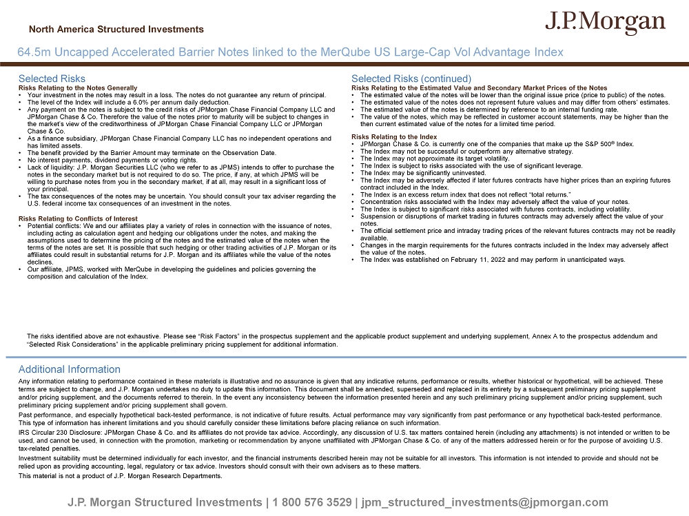J.P. Morgan Structured Investments | 1 800 576 3529 | jpm_structured_investments@jpmorgan.com Selected Risks Risks Relating to the Notes Generally • Your investment in the notes may result in a loss. The notes do not guarantee any return of principal. • The level of the Index will include a 6.0% per annum daily deduction. • Any payment on the notes is subject to the credit risks of JPMorgan Chase Financial Company LLC and JPMorgan Chase & Co. Therefore the value of the notes prior to maturity will be subject to changes in the market’s view of the creditworthiness of JPMorgan Chase Financial Company LLC or JPMorgan Chase & Co. • As a finance subsidiary, JPMorgan Chase Financial Company LLC has no independent operations and has limited assets. • The benefit provided by the Barrier Amount may terminate on the Observation Date. • No interest payments, dividend payments or voting rights. • Lack of liquidity: J.P. Morgan Securities LLC (who we refer to as JPMS) intends to offer to purchase the notes in the secondary market but is not required to do so. The price, if any, at which JPMS will be willing to purchase notes from you in the secondary market, if at all, may result in a significant loss of your principal. • The tax consequences of the notes may be uncertain. You should consult your tax adviser regarding the U.S. federal income tax consequences of an investment in the notes. Risks Relating to Conflicts of Interest • Potential conflicts: We and our affiliates play a variety of roles in connection with the issuance of notes, including acting as calculation agent and hedging our obligations under the notes, and making the assumptions used to determine the pricing of the notes and the estimated value of the notes when the terms of the notes are set. It is possible that such hedging or other trading activities of J.P. Morgan or its affiliates could result in substantial returns for J.P. Morgan and its affiliates while the value of the notes declines. • Our affiliate, JPMS, worked with MerQube in developing the guidelines and policies governing the composition and calculation of the Index. Selected Risks (continued) Risks Relating to the Estimated Value and Secondary Market Prices of the Notes • The estimated value of the notes will be lower than the original issue price (price to public) of the notes. • The estimated value of the notes does not represent future values and may differ from others’ estimates. • The estimated value of the notes is determined by reference to an internal funding rate. • The value of the notes, which may be reflected in customer account statements, may be higher than the then current estimated value of the notes for a limited time period. Risks Relating to the Index • JPMorgan Chase & Co. is currently one of the companies that make up the S&P 500 ® Index. • The Index may not be successful or outperform any alternative strategy. • The Index may not approximate its target volatility. • The Index is subject to risks associated with the use of significant leverage. • The Index may be significantly uninvested. • The Index may be adversely affected if later futures contracts have higher prices than an expiring futures contract included in the Index. • The Index is an excess return index that does not reflect “total returns.” • Concentration risks associated with the Index may adversely affect the value of your notes. • The Index is subject to significant risks associated with futures contracts, including volatility. • Suspension or disruptions of market trading in futures contracts may adversely affect the value of your notes. • The official settlement price and intraday trading prices of the relevant futures contracts may not be readily available. • Changes in the margin requirements for the futures contracts included in the Index may adversely affect the value of the notes. • The Index was established on February 11, 2022 and may perform in unanticipated ways. Additional Information Any information relating to performance contained in these materials is illustrative and no assurance is given that any indic ati ve returns, performance or results, whether historical or hypothetical, will be achieved. These terms are subject to change, and J.P. Morgan undertakes no duty to update this information. This document shall be amended, s upe rseded and replaced in its entirety by a subsequent preliminary pricing supplement and/or pricing supplement, and the documents referred to therein. In the event any inconsistency between the information pres ent ed herein and any such preliminary pricing supplement and/or pricing supplement, such preliminary pricing supplement and/or pricing supplement shall govern. Past performance, and especially hypothetical back - tested performance, is not indicative of future results. Actual performance m ay vary significantly from past performance or any hypothetical back - tested performance. This type of information has inherent limitations and you should carefully consider these limitations before placing reliance on such information. IRS Circular 230 Disclosure: JPMorgan Chase & Co. and its affiliates do not provide tax advice. Accordingly, any discussion o f U .S. tax matters contained herein (including any attachments) is not intended or written to be used, and cannot be used, in connection with the promotion, marketing or recommendation by anyone unaffiliated with JPMorgan Cha se & Co. of any of the matters addressed herein or for the purpose of avoiding U.S. tax - related penalties. Investment suitability must be determined individually for each investor, and the financial instruments described herein may not be suitable for all investors. This information is not intended to provide and should not be relied upon as providing accounting, legal, regulatory or tax advice. Investors should consult with their own advisers as to the se matters. This material is not a product of J.P. Mor